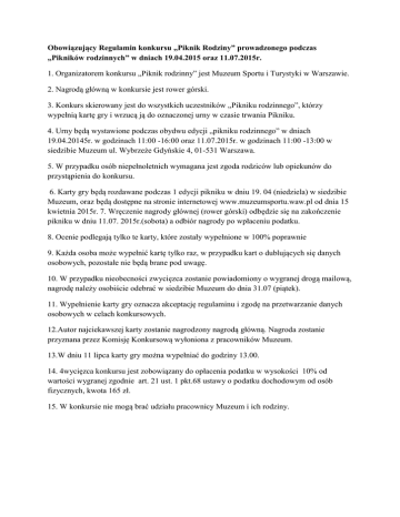 Obowiązujący Regulamin konkursu „Piknik Rodziny” prowadzonego podczas „Pikników rodzinnych” w dniach 19.04.2015 oraz 11.07.2015r. 1. Organizatorem konkursu „Piknik rodzinny” jest Muzeum Sportu i Turystyki w Warszawie. 2. Nagrodą główną w konkursie jest rower górski. 3. Konkurs skierowany jest do wszystkich uczestników „Pikniku rodzinnego”, którzy wypełnią kartę gry i wrzucą ją do oznaczonej urny w czasie trwania Pikniku. 4. Urny będą wystawione podczas obydwu edycji „pikniku rodzinnego” w dniach 19.04.20145r. w godzinach 11:00 -16:00 oraz 11.07.2015r. w godzinach 11:00 -13:00 w siedzibie Muzeum ul. Wybrzeże Gdyńskie 4, 01-531 Warszawa. 5. W przypadku osób niepełnoletnich wymagana jest zgoda rodziców lub opiekunów do przystąpienia do konkursu. 6. Karty gry będą rozdawane podczas 1 edycji pikniku w dniu 19. 04 (niedziela) w siedzibie Muzeum, oraz będą dostępne na stronie internetowej www.muzeumsportu.waw.pl od dnia 15 kwietnia 2015r. 7. Wręczenie nagrody głównej (rower górski) odbędzie się na zakończenie pikniku w dniu 11.07. 2015r.(sobota) a odbiór nagrody po wpłaceniu podatku. 8. Ocenie podlegają tylko te karty, które zostały wypełnione w 100% poprawnie 9. Każda osoba może wypełnić kartę tylko raz, w przypadku kart o dublujących się danych osobowych, pozostałe nie będą brane pod uwagę. 10. W przypadku nieobecności zwycięzca zostanie powiadomiony o wygranej drogą mailową, nagrodę należy osobiście odebrać w siedzibie Muzeum do dnia 31.07 (piątek). 11. Wypełnienie karty gry oznacza akceptację regulaminu i zgodę na przetwarzanie danych osobowych w celach konkursowych. 12.Autor najciekawszej karty zostanie nagrodzony nagrodą główną. Nagroda zostanie przyznana przez Komisję Konkursową wyłoniona z pracowników Muzeum. 13.W dniu 11 lipca karty gry można wypełniać do godziny 13.00. 14. 4wycięzca konkursu jest zobowiązany do opłacenia podatku w wysokości 10% od wartości wygranej zgodnie art. 21 ust. 1 pkt.68 ustawy o podatku dochodowym od osób fizycznych, kwota 165 zł. 15. W konkursie nie mogą brać udziału pracownicy Muzeum i ich rodziny.