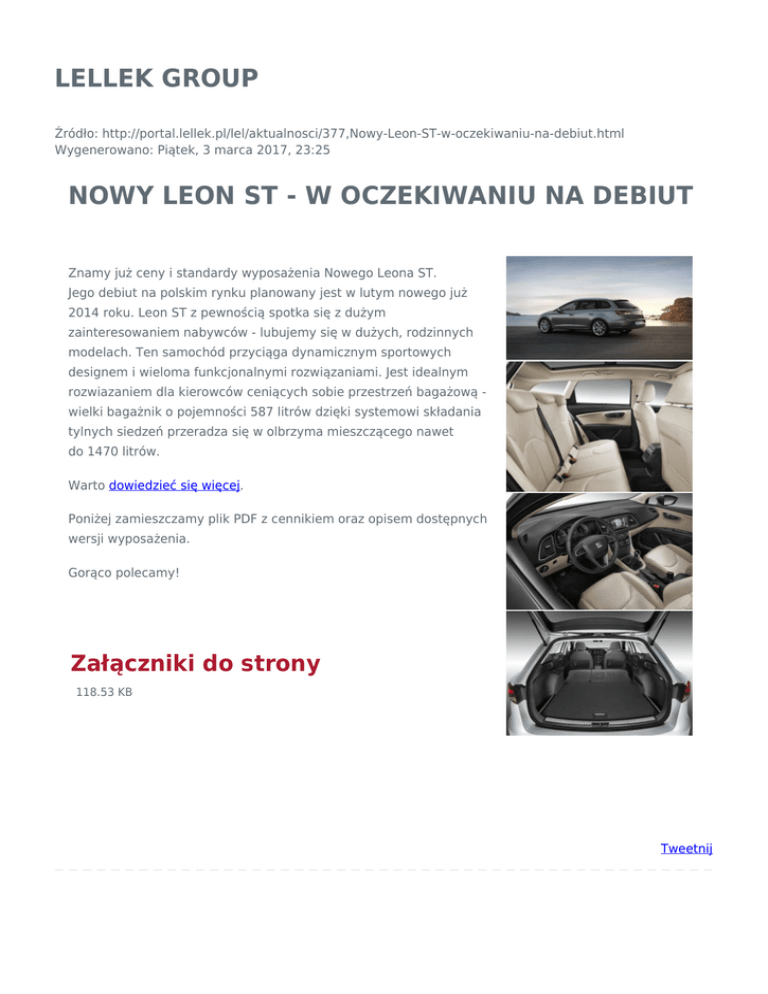 LELLEK GROUP Źródło: http://portal.lellek.pl/lel/aktualnosci/377,Nowy-Leon-ST-w-oczekiwaniu-na-debiut.html Wygenerowano: Piątek, 3 marca 2017, 23:25 NOWY LEON ST - W OCZEKIWANIU NA DEBIUT Znamy już ceny i standardy wyposażenia Nowego Leona ST. Jego debiut na polskim rynku planowany jest w lutym nowego już 2014 roku. Leon ST z pewnością spotka się z dużym zainteresowaniem nabywców - lubujemy się w dużych, rodzinnych modelach. Ten samochód przyciąga dynamicznym sportowych designem i wieloma funkcjonalnymi rozwiązaniami. Jest idealnym rozwiazaniem dla kierowców ceniących sobie przestrzeń bagażową wielki bagażnik o pojemności 587 litrów dzięki systemowi składania tylnych siedzeń przeradza się w olbrzyma mieszczącego nawet do 1470 litrów. Warto dowiedzieć się więcej. Poniżej zamieszczamy plik PDF z cennikiem oraz opisem dostępnych wersji wyposażenia. Gorąco polecamy! Załączniki do strony 118.53 KB Tweetnij