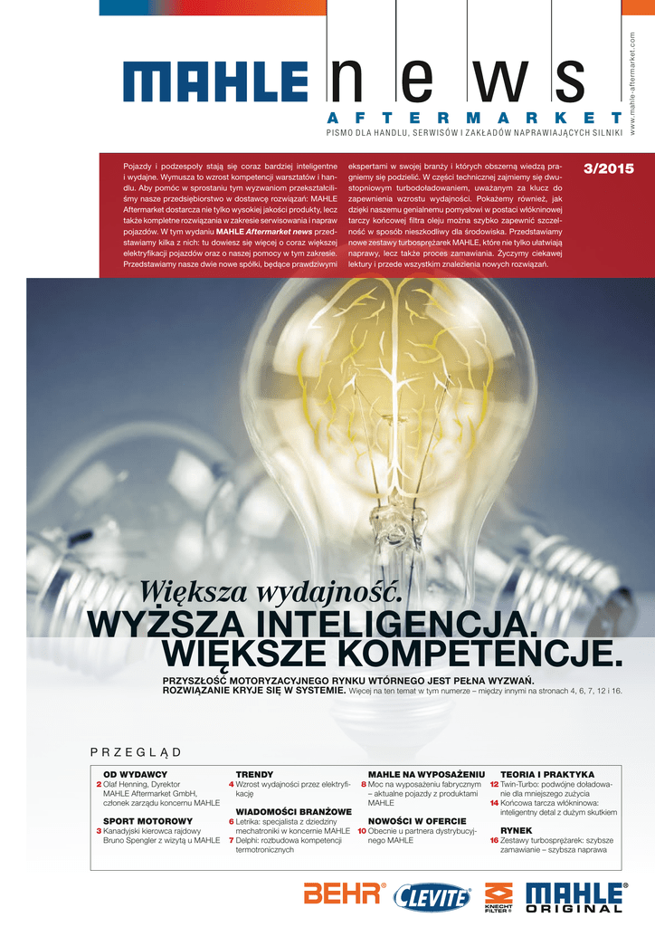 F T E R M A R K E T PISMO DLA HANDLU, SERWISÓW I ZAKŁADÓW NAPRAWIAJĄCYCH SILNIKI Pojazdy i podzespoły stają się coraz bardziej inteligentne i wydajne. Wymusza to wzrost kompetencji warsztatów i handlu. Aby pomóc w sprostaniu tym wyzwaniom przekształciliśmy nasze przedsiębiorstwo w dostawcę rozwiązań: MAHLE Aftermarket dostarcza nie tylko wysokiej jakości produkty, lecz także kompletne rozwiązania w zakresie serwisowania i napraw pojazdów. W tym wydaniu MAHLE Aftermarket news przedstawiamy kilka z nich: tu dowiesz się więcej o coraz większej elektryfikacji pojazdów oraz o naszej pomocy w tym zakresie. Przedstawiamy nasze dwie nowe spółki, będące prawdziwymi ekspertami w swojej branży i których obszerną wiedzą pragniemy się podzielić. W części technicznej zajmiemy się dwustopniowym turbodoładowaniem, uważanym za klucz do zapewnienia wzrostu wydajności. Pokażemy również, jak dzięki naszemu genialnemu pomysłowi w postaci włókninowej tarczy końcowej filtra oleju można szybko zapewnić szczelność w sposób nieszkodliwy dla środowiska. Przedstawiamy nowe zestawy turbosprężarek MAHLE, które nie tylko ułatwiają naprawy, lecz także proces zamawiania. Życzymy ciekawej lektury i przede wszystkim znalezienia nowych rozwiązań. 3/2015 Większa wydajność. WYŻSZA INTELIGENCJA. WIĘKSZE KOMPETENCJE. PRZYSZŁOŚĆ MOTORYZACYJNEGO RYNKU WTÓRNEGO JEST PEŁNA WYZWAŃ. ROZWIĄZANIE KRYJE SIĘ W SYSTEMIE. Więcej na ten temat w tym numerze – między innymi na stronach 4, 6, 7, 12 i 16. PRZEGLĄD OD WYDAWCY TRENDY w w w.mahle-aftermarket.com A MAHLE NA WYPOSAŻENIU TEORIA I PRAKTYKA 2Olaf Henning, Dyrektor 4Wzrost wydajności przez elektryfi- 8Moc na wyposażeniu fabrycznym 12Twin-Turbo: podwójne doładowaMAHLE Aftermarket GmbH, kację – aktualne pojazdy z produktami nie dla mniejszego zużycia członek zarządu koncernu MAHLE MAHLE 14Końcowa tarcza włókninowa: WIADOMOŚCI BRANŻOWE inteligentny detal z dużym skutkiem SPORT MOTOROWY 6Letrika: specjalista z dziedziny NOWOŚCI W OFERCIE 3Kanadyjski kierowca rajdowy mechatroniki w koncernie MAHLE 10Obecnie u partnera dystrybucyj- RYNEK Bruno Spengler z wizytą u MAHLE 7Delphi: rozbudowa kompetencji nego MAHLE 16Zestawy turbosprężarek: szybsze termotronicznych zamawianie – szybsza naprawa OD WYDAWCY Szanowni Czytelnicy! Chcąc odnosić sukcesy jako przedsiębiorstwo i być dzięki temu niezawodnym partnerem swoich klientów należy ciągle wyglądać poza swoje przysłowiowe podwórko. Dlatego w MAHLE Aftermarket zdefiniowaliśmy wytyczne w sferze najważniejszych tematów przyszłości: gdzie chcemy się znaleźć za pięć do dziesięciu lat, wychodząc z naszej dzisiejszej pozycji? Jak w przyszłości będziemy w stanie spełniać nasze własne wysokie wymagania jakościowe? Jak będziemy nadal mogli odpowiadać na rosnące wymagania naszych klientów w zakresie części zamiennych, rozwiązań związanych z naprawami i usługami? A przede wszystkim: jak możemy nadal pomagać Państwu szybko i kompetentnie w wypełnianiu codziennych zadań w handlu i warsztacie? Olaf Henning, Dyrektor MAHLE Aftermarket GmbH i członek zarządu koncernu MAHLE. Wszystko to jest możliwe tylko dzięki decydującemu czynnikowi: naszym pracownikom. To oni reprezentują naszą wizję i żyją naszymi wartościami – w każdym spotkaniu, w każdej czynności, w każdym dialogu. Identyfikacja naszych pracowników to podstawa siły marki MAHLE: jakość, innowacja i niezawodność. Sposób realizacji naszych pomysłów we wszystkich naszych działaniach jest jednym z głównych elementów, przedstawionych w tym numerze MAHLE Aftermarket news. Myślimy tu przede wszystkim o temacie, który porusza naszą branżę i stawia przed nią nowe wyzwania – zwiększenie łącznej wydajności pojazdów. Bezpośrednio z tym wiąże się również rosnący zakres elektryfikacji pojazdów. Na następnych stronach pokażemy, jak MAHLE chce towarzyszyć temu rozwojowi ważnymi impulsami. Myślimy przy tym oczywiście o nowej spółce MAHLE – firmie Letrika, która rozszerzy asortyment produktów MAHLE Aftermarket do pojazdów ciężarowych, czyniąc z niego kompletny program. Początkowo będą to rozruszniki i prądnice, a potem także elektroniczne Drive Systems. Wraz z elektryfikacją rośnie także znaczenie zarządzania temperaturą. Również w tym zakresie MAHLE ma doskonały asortyment. Najnowszy nabytek w rodzinie MAHLE, czyli pion zarządzania temperaturą amerykańskiego poddostawcy przemysłu motoryzacyjnego Delphi Automotive, który przedstawiamy w tym wydaniu, dodatkowo rozszerzył ten zakres działalności. TYLKO MAJĄC CEL MOŻNA GO OSIĄGNĄĆ! Kierowanie się misją z nastawieniem na klientów oznacza oczywiście również pozostanie otwartym na dalszy rozwój, prowadzony razem z Państwem – naszymi klientami. Aby dobre stawało się lepszym, chcemy uczyć się od Państwa. W ramach procesu ciągłej optymalizacji jesteśmy zdani na nowe impulsy: prosimy o informacje, co możemy udoskonalić. Zapraszamy na wspólną drogę pomyślnej współpracy – drogę do celu, wzmacniającego i rozwijającego partnerstwo. Naszą misją jest pozostanie – również w przyszłości – preferowanym dostawcą naszych klientów na motoryzacyjnym rynku wtórnym. Jako prawdziwy dostawca rozwiązań chcemy pomagać i oferować wszystko to, co jest potrzebne do zapewnienia wydajnej i dochodowej pracy: produkty w najwyższej jakości OEM. Wyposażenie warsztatów, zwiększające kompetencje usług. Oraz usługi serwisowe, bezkompromisowo dopasowane do potrzeb klientów i pomagające im w codziennej pracy w warsztatach: czy poprzez infolinie, szkolenia lub dokumentacje bądź też całkiem konkretnie poprzez czynną pomoc w postaci naszej wiedzy specjalistycznej przy wymianie turbosprężarki czy też podczas prac przy obiegu klimatyzacji. 2 Życzę interesującej lektury. Państwa Olaf Henning X SPORT MOTOROWY Gaz do DESK