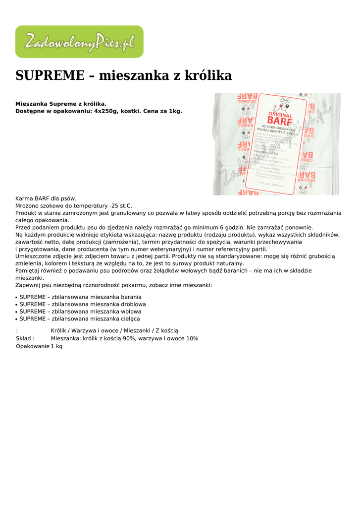 SUPREME – mieszanka z królika Mieszanka Supreme z królika. Dostępne w opakowaniu: 4x250g, kostki. Cena za 1kg. Karma BARF dla psów. Mrożone szokowo do temperatury -25 st.C. Produkt w stanie zamrożonym jest granulowany co pozwala w łatwy sposób oddzielić potrzebną porcję bez rozmrażania całego opakowania. Przed podaniem produktu psu do zjedzenia należy rozmrażać go minimum 6 godzin. Nie zamrażać ponownie. Na każdym produkcie widnieje etykieta wskazująca: nazwę produktu (rodzaju produktu), wykaz wszystkich składników, zawartość netto, datę produkcji (zamrożenia), termin przydatności do spożycia, warunki przechowywania i przygotowania, dane producenta (w tym numer weterynaryjny) i numer referencyjny partii. Umieszczone zdjęcie jest zdjęciem towaru z jednej partii. Produkty nie są standaryzowane: mogę się różnić grubością zmielenia, kolorem i teksturą ze względu na to, że jest to surowy produkt naturalny. Pamiętaj również o podawaniu psu podrobów oraz żołądków wołowych bądź baranich – nie ma ich w składzie mieszanki. Zapewnij psu niezbędną różnorodność pokarmu, zobacz inne mieszanki: ● ● ● ● SUPREME SUPREME SUPREME SUPREME – – – – zbilansowana zbilansowana zbilansowana zbilansowana mieszanka mieszanka mieszanka mieszanka barania drobiowa wołowa cielęca : Królik / Warzywa i owoce / Mieszanki / Z kością Skład : Mieszanka: królik z kością 90%, warzywa i owoce 10% Opakowanie 1 kg
