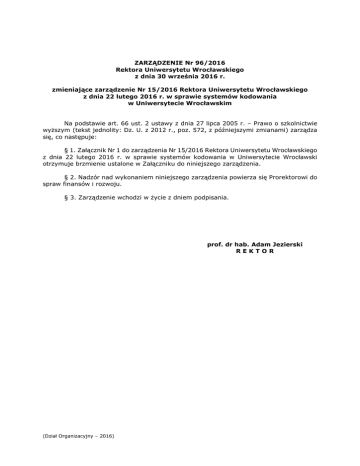 ZARZĄDZENIE Nr 96/2016 Rektora Uniwersytetu Wrocławskiego z