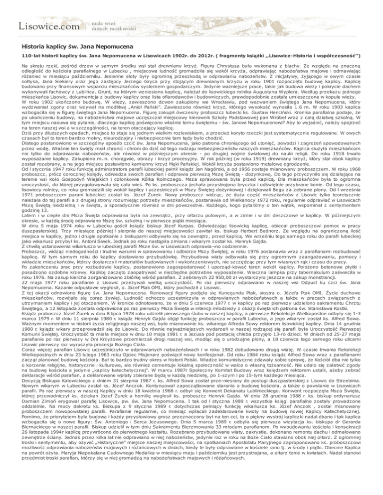 Historia kaplicy św. Jana Nepomucena 110-lat historii kaplicy św. Jana Nepomucena w Lisowicach 1902r. do 2012r. ( fragmenty książki ,,Lisowice-Historia i współcz esność’’) Na skraju rzeki, pośród drzew w samym środku wsi stał drewniany krzyż. Figura Chrystusa była wykonana z blachy. Ze względu na znaczną odległość do kościoła parafialnego w Lubecku , miejscowa ludność gromadziła się wokół krzyża, odprawiając nabożeństwa majowe i odmawiając różaniec w miesiącu październiku. Jesienne słoty były ogromną przeszkodą w odprawianiu nabożeństw. Z inicjatywy, żyjącego w owym czasie sołtysa, Jana Siekiery oraz jego zastępcy Jerzego Gryca przy stojącym drewnianym krzyżu w roku 1901 rozpoczęto budowę kaplicy. Kaplicę budowano przy finansowym wsparciu mieszkańców systemem gospodarczym. Jedynie ważniejsze prace, takie jak budowa wieży i pokrycie dachem wykonywali fachowcy z Lublińca. Grunt, na którym wzniesiono kaplicę, należał do lisowickiego rolnika Augustyna Wyplera. Według przekazu jednego mieszkańca Lisowic, dokumentcja z budowy kaplicy oraz lista ofiarodawców i budowniczych, prawdopodobnie została umieszczona w kopule wieży. W roku 1902 ukończono budowę. W wieży, zawieszono dzwon zakupiony we Wrocławiu, pod wezwaniem świętego Jana Nepomucena, który wydzwaniał zgony oraz wzywał na modlitwę „Anioł Pański". Zawieszono również krzyż, którego wysokość wynosiła 1.6 m. W roku 1903 kaplica wzbogaciła się w figurę świętego Jana Nepomucena. Figurę zakupił ówczesny proboszcz lubecki ks. Gustaw Henciński. Kronika parafialna podaje, że po ukończeniu budowy, na nabożeństwa majowe uczęszczał miejscowy kierownik Szkoły Podstawowej pan Wróbel wraz z całą dziatwą szkolną. W tym miejscu nasuwa się pytanie, dlaczego kaplicę poświęcono właśnie temu świętemu - św. Janowi Nepomucenowi? Aby to wyjaśnić, należy spojrzeć na teren naszej wsi a w szczególności, na teren otaczający kaplicę. Dziś przy dłuższych opadach, miejsce to staje się jednym wielkim rozlewiskiem, a przecież koryto rzeczki jest systematycznie regulowane. W owych czasach był to teren bardzo mokry, nieurodzajny i niebezpiecznie tam tędy było chodzić. Dlatego postanowiono w szczególny sposób czcić św. Jana Nepomucena, jako patrona chroniącego od utonięć, powodzi i zagrożeń spowodowanych przez wodę. Właśnie ten święty miał chronić i chroni do dziś od tego rodzaju niebezpieczeństw naszych mieszkańców. Kaplica służyła mieszkańcom nie tylko do odprawiania nabożeństw, ale również w późniejszym okresie - po drugiej wojnie światowej do nauki religii. Do roku 1918 trwało wyposażanie kaplicy. Zakupiono m.in. chorągwie, obrazy i krzyż procesyjny. W rok później (w roku 1919) drewniany krzyż, który stał obok kaplicy został rozebrany, a na jego miejscu postawiono kamienny krzyż Męki Pańskiej. Wokół krzyża postawiono metalowe ogrodzenie. Od l stycznia 1947 roku funkcję administratora parafii lubeckiej pełnił ksiądz Jan Nagórski, a od 1956 zostaje mianowany proboszczem. W roku 1968 proboszcz, prócz corocznej kolędy, odwiedza swoich parafian i odprawia pierwszą Mszę Świętą - dożynkową. Do tego przyczyniło się działające na terenie wsi Koło Gospodyń Wiejskich i członkowie Kółka Rolniczego. Msza sprawowana była przed kaplicą. Dla mieszkańców była to ogromna uroczystość, do której przygotowywała się cała wieś. Po ks. proboszcza jechała przystrojona bryczka i odświętnie przybrane konie. Od tego czasu, lisowiccy rolnicy, co roku gromadzili się wokół kaplicy i uczestniczyli w Mszy Świętej dożynkowej i dziękowali Bogu za zebrane plony. Od l września 1971 proboszczem parani lubeckiej został ks. Józef Żurek. Nowy proboszcz widząc, że duża część mieszkańców z Lisowic tylko teoretycznie należała do tej parafii a z drugiej strony rozumiejąc potrzeby mieszkańców, postanawia od Wielkanocy 1972 roku, regularnie odprawiać w Lisowicach Mszę Świętą niedzielną i w święta, a sporadycznie również w dni powszednie. Każdego, kogo pytaliśmy o ten wątek, wspominał z sentymentem godzinę 13. Latem i w ciepłe dni Msza Święta odprawiana była na zewnątrz, przy ołtarzu polowym, a w zimie i w dni deszczowe w kaplicy. W późniejszym okresie, w każdą środę odprawiano Mszę św. szkolną i w pierwsze piątki miesiąca. W dniu 5 maja 1974 roku w Lubecku gościł ksiądz biskup Józef Kurpas. Odwiedzając lisowicką kaplicę, obiecał proboszczowi pomoc w pracy duszpasterskiej. Trzy miesiące później l sierpnia do naszej miejscowości zawitał ks. biskup Herbert Bednorz. Ze względu na ograniczoną ilość miejsca w kaplicy, jedno i drugie spotkanie z biskupami odbywało się na zewnątrz, przed kaplicą. We wrześniu tego samego roku do parafii lubeckiej jako wikariusz przybył ks. Antoni Siwek. Jednak po roku nastąpiła zmiana i wikarym został ks. Henryk Gajda. Z chwilą ustanowienia wikariusza w lubeckiej parafii Msze św. w Lisowicach odprawia¬no codziennie. Proboszcz, widząc niedogodności i trudne warunki w sprawowaniu i odbiorze Mszy Świętej, w roku 1976 postanawia wraz z parafianami rozbudować kaplicę. W tym samym roku do kaplicy dostawiono przybudówkę. Przybudowa wiaty odbywała się przy ogromnym zaangażowaniu, pomocy i wkładzie mieszkańców, którzy dostarczyli materiałów budowlanych i wykończeniowych, nie szczędząc przy tym własnych rąk i czasu do pracy. Po zakończeniu prac przy rozbudowie kaplicy, postanowiono zagospodarować i uporząd-kować teren wokół kaplicy. Położono betonowe płytki i posadzono ozdobne krzewy. Kaplicę zaczęto zaopatrywać w niezbędne potrzebne wyposażenie. Wieczna lampka przy tabernakulum zaświeciła w roku 1976. Na zakup kielicha zorganizowano zbiórkę wśród parafian. Z zebranych 22 950,00 zł wystarczyło jeszcze na zakup monstrancji. 22 maja 1977 roku parafianie z Lis