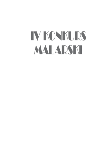 IV KONKURS MALARSKI 5DGRĂÊRF]XMHVWSRF]ÈWNLHPPLïRĂFL $U\VWRWHOHV IV KONKURS MALARSKI WARSZAWA 2011 :HUQLVDĝZ\VWDZ\ ;,URJRG]LQLH 8URF]\VWHZUÚF]HQLHQDJUöGODXUHDWRP ;,,URJRG]LQLH :\VWDZDSUDFNRQNXUVRZ\FK ;,ļ;,, *DOHULD=DGUDXO)UHWD:DUV]DZD 01/2011 Dagmara RybakÃDeep endÃ2011 53 x 64 cm, akryl na płótnie, Sosnowiec 5 02/2011 Rafał Paszkowski ∙ Przestrzeń ∙ 2011 6 21 x 29,7 cm, farba plakatowa na tekturze, Olsztyn 03/2011 Luiza Kolasa ∙ Pod wrażeniem ∙ 2009 160 x 100 cm, olej na płótnie, Zabrze 7 04/2011/1 Antonina Radzięda ∙ Błękitne niebo ∙ 2011 40,5 x 50,5 cm, akryl na płótnie, Jesień 8 04/2011/2 Antonina Radzięda ∙ Taniec ∙ 2011 50,5 x 40,5 cm, akryl na płótnie, Jesień 9 05/2011 Halina Olechowska - Cwanek ∙ Akt ∙ 2010 80 x 60 cm, własna na płótnie, Ropczyce 10 06/2011 Małgorzata Mróz ∙ Z cyklu Stany ∙ 2009 100 x 90 cm, akryl na płótnie, Ostrowiec Świętokrzyski 11 07/2011 Paweł Stańczyk ∙ Klif ∙ 2010 50 x 40 cm, olej na płótnie, Jawor 12 08/2011 Aleksandra Kaleta ∙ Obraz mój codzienny ∙ 2008 70 x 100 cm, olej na płótnie, Kraków 13 09/2011 Anna Lugowska ∙ Na łące ∙ 2011 50 x 70 cm, olej na płótnie, Warszawa 14 10/2011/1 Jaga Karkoszka ∙ Posiadanie ∙ 2009 31,5 x 21 cm, rysunek dwubarwny, Międzyborów 15 10/2011/2 Jaga Karkoszka ∙ Wolność ∙ 2009 31,5 x 21 cm , rysunek dwubarwny, Międzyborów 16 10/2011/3 Jaga Karkoszka ∙ Równowaga ∙ 2009 31,5 x 21 cm , rysunek dwubarwny, Międzyborów 17 11/2011/1 Maria Dziarmaga ∙ Kompozycja nr 0 ∙ 2011 18 93,5 x 53,5cm, olej na płótnie, Kielce 11/2011/2 Maria Dziarmaga ∙ Kompozycja nr 1 ∙ 2011 50 x 65 cm, olej na płótnie, Kielce 19 12/2011/1 Małgorzata Śliwa ∙ Pracujący Mężczyzna ∙ 2010 100 x 100 cm, mieszana na płótnie, Szumsko - Kolonia 20 12/2011/2 Małgorzata Śliwa ∙ Siedząca Kobieta ∙ 2010 100 x 100 cm, mieszana na płótnie, Szumsko - Kolonia 21 13/2011 Barbara Gałczyńska ∙ Łąka ∙ 2011 29 x 20 cm, akwarela, Augustów 22 14/2011 Lili Fijałkowska ∙ Plażowa natura martwa ∙ 2011 90 x 116 cm, olej na płótnie, Ożarów Mazowiecki 23 15/2011/1 Krzysztof Chmielowski ∙ Kompozycja ze słonecznikami ∙ 2011 70 x 50 cm, olej na płótnie, Mielec 24 15/2011/2 Krzysztof Chmielowski ∙ Kompozycja z kwiatami ∙ 2011 70 x 50, olej na płótnie, Mielec 25 16/2011/1 Barbara Wiernicka - Domagała ∙ Chóry anielskie ∙ 2001 32 x 37 cm, na szkle malowane, Warszawa 26 16/2011/2 Barbara Wiernicka - Domagała ∙ Grają i śpiewają anieli ∙ 2001 30 x 37 cm, na szkle malowane, Warszawa 27 16/2011/3 Barbara Wiernicka - Domagała ∙ Mała szopeczka w Zakopanem ∙ 2000 35 x 35 cm, na szkle malowane, Warszawa 28 16/2011/4 Barbara Wiernicka - Domagała ∙ Szopka w kościele ∙ 2000 35 x 35 cm, na szkle malowane, Warszawa 29 17/2011/1 Halina Podgórska-Dutka ∙ Przekazanie płomienia ∙ 2011 55 x 46 cm, mieszana na płótnie, Kraków 30 17/2011/2 Halina Podgórska-Dutka ∙ Bogowie schodzą ze słońca ∙ 2011 50 x 50cm, mieszana na płótnie, Kraków 31 18/2011 Teresa Kuźnicka ∙ Po powodzi pod Wieluniem ∙ 2005 55 x 45 cm, olej na płótnie, Warszawa 32 19/2011 Iwona Czerniak ∙ Ogród iluzji ∙ 2011 70 x 60 cm, mieszana na płótnie, Wrocław 33 20/2011 Renata Lichańska - Mleczko ∙ Amnezja ∙ 2011 55 x 46 cm, mieszana na płótnie, Kęty 34 21/2011 Tomasz Kuran ∙ Dekoratorka ∙ 2010 120 x 80 cm, mieszana na płótnie, Warszawa 35 22/2011 Maja Franaszek ∙ Płetwal odlotowiec ∙ 2011 50 x 50 cm, olej na płótnie, Kraków 36 23/2011 Katarzyna Mosna - Bojarska ∙ bez tytułu ∙ 2010 58 x 44 cm, akryl na płycie, Pękowice 37 24/2011 Małgorzata Gądek ∙ Głębia spojrzenia ∙ 2011 29,7 x 21 cm, własna na kartonie, Owieczka 38 25/2011 Izabela Ołdak ∙ Namiętność ∙ 2011 50 x 40 cm, akryl, ekolina na płótnie, Węgierska Górka 39 26/2011/1 Kazimierz Fiałkiewicz ∙ Bukiet ∙ 2007 49 x 38 cm, olej na płycie, Lubań 40 26/2011/2 Kazimierz Fiałkiewicz ∙ Taniec ∙ 2007 55,5 x 40 cm, olej na płycie, Lubań 41 26/2011/3 Kazimierz Fiałkiewicz ∙ Przenikanie ∙ 2008 56 x 49,5 cm, olej na płycie, Lubań 42 27/2011 Sylwia Ewa Paszko ∙ Wieczerza ∙ 2011 58 x 82 cm, olej , płótno na płycie, Warszawa 43 28/2011/1 Genowefa Borowska ∙ Tańczące flakony ∙ 2007 30 x 40 cm, olej na płótnie, Szczecin 44 28/2011/2 Genowefa Borowska ∙ Brzozy ∙ 2007 30 x 40 cm, olej na płótnie, Szczecin 45 28/2011/3 Genowefa Borowska ∙ Wraki na wodzie ∙ 2010 40 x 50 cm, mieszana na płótnie, Szczecin 46 28/2011/4 Genowefa Borowska ∙ Wyobraźnia kwiatu w przekroju ∙ 2009 70 x 50 cm, olej na płótnie, Szczecin 47 29/2011/1 Maria Maciejewska ∙ Intymność I ∙ 2011 80 x 60 cm, akryl na płótnie, Kielce 48 29/2011/2 Maria Maciejewska ∙ Intymność II ∙ 2011 80 x 60 cm, akryl na płótnie, Kielce 49 29/2011/3 Maria Maciejewska ∙ Intymność III ∙ 2011 80 x 60 cm, akryl na płótnie, Kielce 50 30/2011/1 Bolesław Okuniewski ∙ Galaktyczny wymiatacz ∙ 2010 80 x 60 cm, olej na płótnie, Gdynia 51 30/2011/2 Bolesław Okuniewski ∙ Zmierzch życia ∙ 2010 75 x 80 cm, olej na płótnie, Gdynia 52 30/2011/3 Bolesław Okuniewski ∙ Dolina Oczywistości ∙ 2011 100 x 80 cm, olej na płótnie, Gdynia 53 31/2011/1 Martyna Wolna ∙ One ∙ 2011 54 70 x 50 cm, akryl na płótnie, Gdańsk 31/2011/2 Martyna Wolna ∙ Kuba ∙ 2009 92 x 73 cm, olej na płótnie, Gdańsk 55 32/2011/1 Krystyna Zimnicka ∙ Uroki ∙ 2011 60 x 60 cm, własna na tekturze, Włodawa 56 32/2011/2 Krystyna Zimnicka ∙ Uroki ∙ 2011 20 x 20 cm, własna na tekturze, Włodawa 57 32/2011/3 Krystyna Zimnicka ∙ Uroki ∙ 2011 20 x 20cm, własna na tekturze, Włodawa 58 33/2011 Dariusz Słota ∙ Zakopane ∙ 2010 66,7 x 47,8 cm, akryl na tekturze, Częstochowa 59 34/2011 Aleksandra Miernik ∙ Architektura średniowieczna – zamek średniowieczny ∙ 2011 70 x 50 cm, akwarela, Milanówek 60 35/2011 Milena Chomontowska 