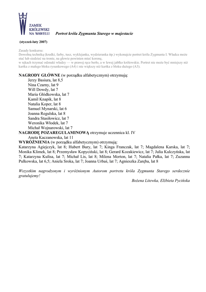 Portret króla Zygmunta Starego w majestacie (styczeń-luty 2007) Zasady konkursu: Dowolną techniką (kredki, farby, tusz, wyklejanka, wydzieranka itp.) wykonajcie portret króla Zygmunta I. Władca może stać lub siedzieć na tronie, na głowie powinien mieć koronę, w rękach trzymać odznaki władzy — w prawej ręce berło, a w lewej jabłko królewskie. Portret nie może być mniejszy niż kartka z małego bloku rysunkowego (A4) i nie większy niż kartka z bloku dużego (A3). NAGRODY GŁÓWNE (w porządku alfabetycznym) otrzymują: Jerzy Basiura, lat 8,5 Nina Czarny, lat 9 Will Dowdy, lat 7 Maria Głódkowska, lat 7 Kamil Knapik, lat 8 Natalia Koper, lat 8 Samuel Mynarski, lat 6 Joanna Regulska, lat 8 Sandra Stasiłowicz, lat 7 Weronika Włodek, lat 7 Michał Wojnarowski, lat 7 NAGRODĘ POZAREGULAMINOWĄ otrzymuje uczennica kl. IV Aneta Kaczanowska, lat 11 WYRÓŻNIENIA (w porządku alfabetycznym) otrzymują: Katarzyna Agiejczyk, lat 8; Hubert Bury, lat 7; Kinga Franczak, lat 7; Magdalena Karska, lat 7; Monika Klimek, lat 8; Przemysław Kopyciński, lat 8; Gerard Kozakiewicz, lat 7; Julia Kulczyńska, lat 7; Katarzyna Kulisa, lat 7; Michał Lis, lat 8; Milena Morton, lat 7; Natalia Pałka, lat 7; Zuzanna Pulkowska, lat 6,5; Aniela Sroka, lat 7; Joanna Urbaś, lat 7; Agnieszka Zaręba, lat 8 Wszystkim nagrodzonym i wyróżnionym Autorom portretu króla Zygmunta Starego serdecznie gratulujemy! Bożena Litewka, Elżbieta Pycińska Portret króla Zygmunta Starego w majestacie Jerzy Basiura, lat 8,5 Will Dowdy, lat 7 Nina Czarny, lat 9 Maria Głódkowska, lat 7 Portret króla Zygmunta Starego w majestacie Kamil Knapik, lat 8 Natalia Koper, lat 8 Samuel Mynarski, lat 6 Joanna Regulska, lat 8 Portret króla Zygmunta Starego w majestacie Sandra Stasiłowicz, lat 7 Weronika Włodek, lat 7 Michał Wojnarowski, lat 7 Aneta Kaczanowska, lat 11 (kl. IV)
