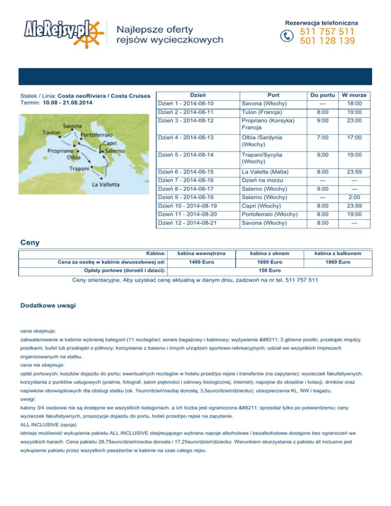 Statek / Linia: Costa neoRiviera / Costa Cruises Termin: 10.08 - 21.08.2014 Dzień Port Do portu W morze --- 18:00 Tulon (Francja) 8:00 19:00 Propriano (Korsyka) Francja 9:00 23:00 Dzień 4 - 2014-08-13 Olbia /Sardynia (Włochy) 7:00 17:00 Dzień 5 - 2014-08-14 Trapani/Sycylia (Włochy) 9;00 19:00 Dzień 6 - 2014-08-15 La Valetta (Malta) 8:00 23:59 Dzień 7 - 2014-08-16 Dzień na morzu --- --- Dzień 8 - 2014-08-17 Salerno (Włochy) 8:00 --- Dzień 9 - 2014-08-18 Salerno (Włochy) --- 2:00 Dzień 10 - 2014-08-19 Capri (Włochy) 8:00 23:59 Dzień 11 - 2014-08-20 Portoferraio (Włochy) 8:00 19:00 Dzień 12 - 2014-08-21 Savona (Włochy) 8:00 --- Dzień 1 - 2014-08-10 Savona (Włochy) Dzień 2 - 2014-08-11 Dzień 3 - 2014-08-12 Ceny Kabina: Cena za osobę w kabinie dwuosobowej od: kabina wewnętrzna kabina z oknem kabina z balkonem 1499 Euro 1699 Euro 1969 Euro Opłaty portowe (dorośli i dzieci): 150 Euro Ceny orientacyjne. Aby uzyskać cenę aktualną w danym dniu, zadzwoń na nr tel. 511 757 511 Dodatkowe uwagi cena obejmuje: zakwaterowanie w kabinie wybranej kategorii (11 noclegów); serwis bagażowy i kabinowy; wyżywienie – 3 główne posiłki, przekąski między posiłkami, bufet lub przekąski o północy; korzystanie z basenu i innych urządzeń sportowo-rekreacyjnych; udział we wszystkich imprezach organizowanych na statku. cena nie obejmuje: opłat portowych; kosztów dojazdu do portu; ewentualnych noclegów w hotelu przed/po rejsie i transferów (na zapytanie); wycieczek fakultatywnych; korzystania z punktów usługowych (pralnia, fotograf, salon piękności i odnowy biologicznej, internet); napojów do obiadów i kolacji, drinków oraz napiwków obowiązkowych dla obsługi statku (ok. 7euro/dzień/osobę dorosłą; 3,5euro/dzień/dziecko); ubezpieczenia KL, NW i bagażu. uwagi: kabiny 3/4 osobowe nie są dostępne we wszystkich kategoriach, a ich liczba jest ograniczona – sprzedaż tylko po potwierdzeniu; ceny wycieczek fakultatywnych, propozycje dojazdu do portu, hoteli przed/po rejsie na zapytanie. ALL INCLUSIVE (opcja) istnieje możliwość wykupienia pakietu ALL INCLUSIVE obejmującego wybrane napoje alkoholowe i bezalkoholowe dostępne bez ograniczeń we wszystkich barach. Cena pakietu 28,75euro/dzień/osoba dorosła i 17,25euro/dzień/dziecko. Warunkiem skorzystania z pakietu all inclusive jest wykupienie pakietu przez wszystkich pasażerów w kabinie na czas całego rejsu.