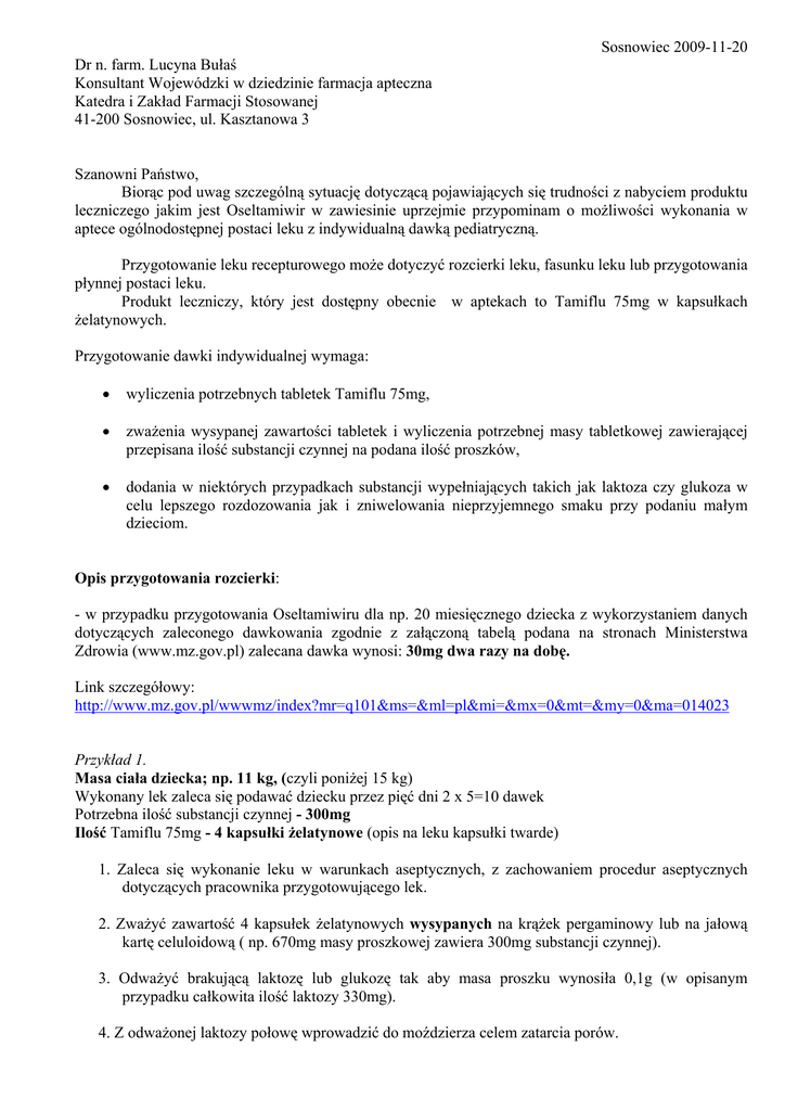 Sosnowiec 2009-11-20 Dr n. farm. Lucyna Bułaś Konsultant Wojewódzki w dziedzinie farmacja apteczna Katedra i Zakład Farmacji Stosowanej 41-200 Sosnowiec, ul. Kasztanowa 3 Szanowni Państwo, Biorąc pod uwag szczególną sytuację dotyczącą pojawiających się trudności z nabyciem produktu leczniczego jakim jest Oseltamiwir w zawiesinie uprzejmie przypominam o możliwości wykonania w aptece ogólnodostępnej postaci leku z indywidualną dawką pediatryczną. Przygotowanie leku recepturowego może dotyczyć rozcierki leku, fasunku leku lub przygotowania płynnej postaci leku. Produkt leczniczy, który jest dostępny obecnie w aptekach to Tamiflu 75mg w kapsułkach żelatynowych. Przygotowanie dawki indywidualnej wymaga: • wyliczenia potrzebnych tabletek Tamiflu 75mg, • zważenia wysypanej zawartości tabletek i wyliczenia potrzebnej masy tabletkowej zawierającej przepisana ilość substancji czynnej na podana ilość proszków, • dodania w niektórych przypadkach substancji wypełniających takich jak laktoza czy glukoza w celu lepszego rozdozowania jak i zniwelowania nieprzyjemnego smaku przy podaniu małym dzieciom. Opis przygotowania rozcierki: - w przypadku przygotowania Oseltamiwiru dla np. 20 miesięcznego dziecka z wykorzystaniem danych dotyczących zaleconego dawkowania zgodnie z załączoną tabelą podana na stronach Ministerstwa Zdrowia (www.mz.gov.pl) zalecana dawka wynosi: 30mg dwa razy na dobę. Link szczegółowy: http://www.mz.gov.pl/wwwmz/index?mr=q101&ms=&ml=pl&mi=&mx=0&mt=&my=0&ma=014023 Przykład 1. Masa ciała dziecka; np. 11 kg, (czyli poniżej 15 kg) Wykonany lek zaleca się podawać dziecku przez pięć dni 2 x 5=10 dawek Potrzebna ilość substancji czynnej - 300mg Ilość Tamiflu 75mg - 4 kapsułki żelatynowe (opis na leku kapsułki twarde) 1. Zaleca się wykonanie leku w warunkach aseptycznych, z zachowaniem procedur aseptycznych dotyczących pracownika przygotowującego lek. 2. Zważyć zawartość 4 kapsułek żelatynowych wysypanych na krążek pergaminowy lub na jałową kartę celuloidową ( np. 670mg masy proszkowej zawiera 300mg substancji czynnej). 3. Odważyć brakującą laktozę lub glukozę tak aby masa proszku wynosiła 0,1g (w opisanym przypadku całkowita ilość laktozy 330mg). 4. Z odważonej laktozy połowę wprowadzić do moździerza celem zatarcia porów. 5. Stopniowo wprowadzać do moździerza masę odważonych kapsułek tamiflu dokładnie proszkując i mieszając z laktozą. 6. Rozważyć przygotowaną rozcierkę po 0,1g do 10 kapsułek skrobiowych. Można celem zwiększenia ilości środka słodzącego uwzględnić glukozy lub laktozy po 0,1g do każdej sporządzonej kapsułki. Wówczas sporządzony lek: masa całkowita to 1000mg laktozy + 670mg masy proszkowej, masa proszku odważona do jednej kapsułki skrobiowej wynosić 0,167g masy sporządzonej rozcierki. Przykład 2. W przypadku niemowlęcia w wieku 4 miesięcy zalecane dawkowanie 3mg/kg masy ciała dwa razy na dobę Waga dziecka np. 6kg 3mg x 6 kg =18mg w dawce jednorazowej na dobę 36mg na dobę ilość substancji czynnej potrzebnej do wykonania dziesięciu proszków dzielonych 180mg 1 kapsułka gotowego preparatu obecnie dostępnego w aptekach to 75mg Potrzebna ilość gotowego produktu - 3 kapsułki a 75mg Z otrzymanej masy 3 kapsułek (400mg) zawierającej 225mg tamiflu wymieszanej w moździerzu odważyć wyliczoną ilość zawierająca 180mg substancji czynnej - tj. (wstępnie przeważono 3 kapsułki gotowego leku) 500mg masy – zawiera 225mg tamiflu x mg masy - zaw. 180mg tamiflu to x = 400mg • Odważamy laktozę w celu właściwego rozdozowania (przygotowanie rozcierki) - odważenie 600mg laktozy, (glukozy). • Wprowadzenie części laktozy do moździerza i roztarcie celem zatarcia porów. • Wprowadzenie stopniowe odważonej masy proszkowej tamiflu, przy mieszaniu pistlem i kartą. • Wprowadzanie stopniowe odważonej laktozy, lub glukozy. • Rozważenie przygotowanej rozcierki po 0,1g do 10 kapsułek skrobiowych. Można celem zwiększenia ilości środka słodzącego uwzględnić glukozy lub laktozy po 0,1g do każdej kapsułki skrobiowej. Wówczas sporządzony lek, czyli jego masa całkowita to 1000mg laktozy + 400mg masy proszkowej. Masa proszku odważona do jednej kapsułki skrobiowej wynosić 140mg masy sporządzonej rozcierki. (w przypadku braku podanej masy ciała uśrednione masy ciała podane w podręczniku do receptury). Uwaga! Należy przygotować pisemną instrukcję podania dziecku przez opiekuna przygotowanej postaci leku. Wyjaśnić że podanie wymaga wysypania zawartości kapsułki i podania w łyżeczce płynnego słodkiego pokarmu – np. wody z cukrem. Jednocześnie uprzejmie informuję że na stronach internetowych Urzędu Rejestracji Produktów Leczniczych znajduje się wyciąg z charakterystyki Produktu leczniczego Tamiflu - przygotowania Tamiflu roztworu w aptekach z kapsułek Tamiflu. (www.urpl.gov.pl,). Przedstawiony sposób postępowania w większości przypadków zależeć będzie od zapisu podanego na recepcie lekarskiej. Link szczegółowy: http://www.urpl.gov.pl/komunikaty/2009/Przygotowanie.zawiesiny.w.aptece.pdf Strony Śląskiej Izby Aptekarskiej: http://www.katowice.oia.pl/wpisy-act-more-id-3056.html http://www.katowice.oia.pl/wpisy-act-more-id-3057.html