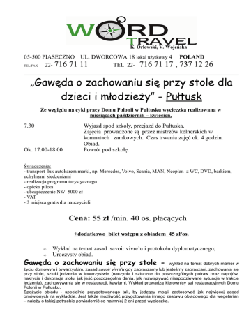 K. Orłowski, V. Wojeńska 05-500 PIASECZNO UL. DWORCOWA 18 lokal użytkowy 4 TEL/FAX 22- 716 71 11 TEL 22- 716 71 17 POLAND , 737 12 26 „Gawęda o zachowaniu się przy stole dla dzieci i młodzieży” - Pułtusk Ze względu na cykl pracy Domu Polonii w Pułtusku wycieczka realizowana w miesiącach październik – kwiecień. 7.30 Ok. 17.00-18.00 Wyjazd spod szkoły, przejazd do Pułtuska. Zajęcia prowadzone są przez mistrzów kelnerskich w komnatach zamkowych. Czas trwania zajęć ok. 4 godzin. Obiad. Powrót pod szkołę. Świadczenia: - transport lux autokarem marki, np. Mercedes, Volvo, Scania, MAN, Neoplan z WC, DVD, barkiem, uchylnymi siedzeniami - realizacja programu turystycznego - opieka pilota - ubezpieczenie NW 5000 zł - VAT - 3 miejsca gratis dla nauczycieli Cena: 55 zł /min. 40 os. płacących +dodatkowo bilet wstępu z obiadem 45 zł/os. • • Wykład na temat zasad savoir vivre’u i protokołu dyplomatycznego; Uroczysty obiad. Gawęda o zachowaniu się przy stole - wykład na temat dobrych manier w życiu domowym i towarzyskim, zasad savoir vivre’u gdy zapraszamy lub jesteśmy zapraszani, zachowania się przy stole, sztuki jedzenia w towarzystwie (naczynia i sztuczce do poszczególnych potraw oraz napojów, nakrycie i dekoracja stołu, jak jeść poszczególne dania, jak rozwiązywać niespodziewane sytuacje w trakcie jedzenia), zachowywania się w restauracji, kawiarni. Wykład prowadzą kierownicy sal restauracyjnych Domu Polonii w Pułtusku. Spożycie obiadu - specjalnie przygotowanego tak, by jedzący mogli zastosować jak najwięcej zasad omówionych na wykładzie. Jest także możliwość przygotowania innego zestawu obiadowego dla wegetarian – należy o takiej potrzebie powiadomić co najmniej 2 dni przed wycieczką. W celu podpisania umowy i rezerwacji konkretnego terminu prosimy o telefon do biura 022 716 71 11 lub 022 716 71 17 lub mail [email protected] Zaliczka konieczna do podpisania umowy 40zł/os. Ze względu na duże zainteresowanie szkół tą ofertą uprzejmie prosimy o zamawianie wycieczki z dużym wyprzedzeniem! ( przyjmowane są grupy min. 40 os.) KWOTĘ NA BILETY WSTĘPU OBOWIĄZUJĄCYMI CENNIKAMI. POTWIERDZAMY PRZED DOPŁATĄ ZGODNIE Z PROGRAM ZAJĘĆ I. Zajęcia prowadzone są przez mistrzów kelnerskich w komnatach zamkowych. Czas trwania zajęć ok. 4 godzin. II. Plan szkolenia 1. Wstęp • • • • Historia kultury stołu Historia polskiej kuchni Kuchnia i stół tradycyjnych polskich świąt Sztućce, porcelana, naczynia szklane i nie tylko 2. O zachowaniu się przy stole – wykład • • • Siadamy do stołu Jemy posiłek Pijemy napoje 3. Spożywanie posiłków, picie napojów – wykład, ćwiczenia • • • • Rola serwetki i sposoby jej składania Prawidłowe nakrycie stołu Odczytywanie kodu ułożenia sztućców Potrawy „proste” i „trudne” 4. Zasady zachowania się w hotelu, restauracji, kawiarni – wykład • • Rola hotelu, restauracji i kawiarni Zasady zachowania się podczas różnych przyjęć bankietowych 5. Zwiedzanie historycznych komnat zamkowych 6. Obiad w restauracji zamkowej Domu Polonii jako praktyczna część szkolenia wg zamówionego wcześniej zestawu. Możliwość rozszerzenia wycieczki o zwiedzanie Pułtuska z przewodnikiem lub przejazd do Ciechanowa – Zamek Książąt Mazowieckich (+ dodatkowo bilet wstępu i powrót pod szkołę około 2h później). Warsztaty zajęciowe związane z plastyką obrzędową okresu wielkanocnego pt. „Wielkanoc w obrzędach i plastyce obrzędowej”. Dzieci uczą się i wykonują palemki, pisanki różnymi technikami, kartki świąteczne oraz kolorowe wiosenne kwiaty z bibuły. LUB Piśmiennictwo średniowieczne” – celem warsztatów jest zapoznanie uczestników z historią polskiego piśmiennictwa oraz poinformowanie uczestników o sposobach tworzenia średniowiecznych dokumentów. W ramach zajęć uczestnicy zdobędą informacje na temat sztuki pisania a także samodzielnie wykonają list opatrzony pieczęcią, metodami używanymi w średniowieczu.