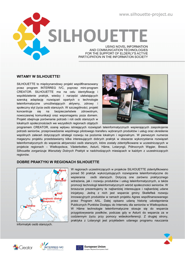 WITAMY W SILHOUETTE! SILHOUETTE to międzynarodowy projekt współfinansowany przez program INTERREG IVC, poprzez mini-program CREATOR. SILHOUETTE ma na celu identyfikację i współdzielenie praktyk, wiedzy i narzędzi ułatwiających szeroką adaptację rozwiązań opartych o technologie teleinformatyczne umożliwiających aktywny, zdrowy i społeczny styl życia osób starszych. W szczególności, projekt koncentruje się na bezpieczeństwie zdrowotnym, nowoczesnej komunikacji oraz wspomaganiu poza domem. Projekt obejmuje porównanie potrzeb i roli osób starszych w lokalnych społecznościach we wszystkich regionach objętych programem CREATOR, ocenę wpływu istniejących rozwiązań teleinformatycznych wspierających zaspokojenie potrzeb seniorów, przeprowadzenie wspólnego pilotowego transferu wybranych produktów i usług oraz określenie wspólnych zaleceń dotyczących strategii rozwoju na poziomie lokalnym i regionalnym. W pierwszym numerze magazynu projektu przedstawiamy kilka interesujących dobrych praktyk w obszarze wykorzystania rozwiązań teleinformatycznych do wsparcia aktywności osób starszych, które zostały zidentyfikowane w uczestniczących w projekcie regionach – Wielkopolsce, Västerbotten, Asturii, Häme, Lotaryngii, Północnych Węgier, Brescii. Silhouette zorganizuje Warsztaty Dobrych Praktyk w nadchodzących miesiącach w każdym z uczestniczących regionów. DOBRE PRAKTYKI W REGIONACH SILHOUETTE W regionach uczestniczących w projekcie SILHOUETTE zidentyfikowano ponad 50 praktyk wykorzystujących rozwiązania teleinformatyczne do wspierania osób starszych. Dotyczą one zarówno praktycznego wdrażania, jak i rozwoju produktów i usług teleinformatycznych, a także promocji technologii teleinformatycznych wśród społeczności seniorów. W broszurze prezentujemy te najbardziej interesujące i najbardziej udane inicjatywy. Jedną z nich jest wsparcie gminy Skellefteå rozwoju innowacyjnych produktów w ramach projektu Agnes wspófinansowanego przez Program AAL. Dalej opisano udaną historię udostępnienia Publicznych Punktów Dostępu do Internetu dla seniorów w Wielkopolsce. W Häme technologie teleinformatyczne stosuje się do wsparcia przygotowywania posiłków, podczas gdy w Asturii do wsparcia za w codziennym życiu przy pomocy wideokonferencji. Z drugiej strony, praktyka z Lotaryngii jest przykładem udanego programu nauczania informatyki osób starszych. WYCZULONE NA UŻYTKOWNIKA SYSTEMY DOMOWE DLA SENIORÓW W SPOŁECZEŃSTWIE INFORMACYJNYM AGNES to odpowiedź na rosnącą liczbę osób starszych żyjących samotnie w domach, które wymagają zarówno społecznej jak i praktycznej pomocy w codziennych aktywnościach i utrzymaniu dobrej jakości życia. Obecnie często doskwiera im społeczna jak i fizyczna izolacja, a także chroniczne dolegliwości jak spadek zdolności poznawczych, początkowe fazy demencji, niska aktywność i złe samopoczucie. AGNES dostarcza rozwiązania domowe wyczulone na użytkownika, mające za cel wspomóc opiekę nad nim i jego interakcję w społeczeństwie. Wykrywanie subiektywnych stanów i aktywności osoby starszej pozwala lepiej dopasować reakcje systemu. Wykorzystanie dedykowanej sieci społecznej pozwala zredukować uczucie osamotnienia i zachęcić do aktywności społecznych i poznawczych. Ponadto platforma AGNES zapewnia medium informacyjno-komunikacyjne osobom starszym, z wiadomościami, aktualnościami na temat bliskich, przypomnieniami o urodzinach i rzeczach do zrobienia itp. Nowe wyświetlacze zanurzone w otoczeniu i urządzenia dotykowe stanowią nowe formy interakcji pomiędzy siecią społeczną a osobą starszą. Seniorzy ze Szwecji, Hiszpanii i Grecji są włączani we wszystkie etapy projektu, począwszy od koncepcji a na ocenie skończywszy. Wpływ praktyczny, socjopsychologiczny i skuteczność wszystkich rozwiązań są testowane w domach użytkowników. PUBLICZNE PUNKTY DOSTĘPU INTERNETU DLA SENIORÓW DO Publiczne Punkty Dostępu do Internetu (PIAPy) od długiego czasu przeciwdziałają cyfrowemu wykluczeniu. Gminy w Wielkopolsce dostrzegły, że PIAPy sprzyjają aktywnej współpracy z obywatelami i zorganizowały takie punkty nie tylko w budynkach administracji, ale także w innych lokalizacjach uczęszczanych przez obywateli. Obecnie ponad 75% gmin wielkopolskich posiada PIAPy, pokrywając ponad 90% kosztów związanych z ich działaniem. Inne instytucje finansujące PIAPy to ochotnicza straż pożarna, centra doradztwa rolniczego, urzędy pracy, stowarzyszenia i inne pozarządowe organizacje. W ponad 50% PIAPów pracownik zatrudniony na pełen etat wspomaga obywateli w korzystaniu z darmowego dostępu do komputerów z Internetem. Co ciekawe, w Wielkopolsce PIAPy są często wykorzystywane przez osoby w wieku 50+, ze względu na ich rozmieszczenie także w klubach seniora, domach opieki i parafiach. Te miejsca są uczęszczane przez osoby starsze, które zyskały możliwość skorzystania z komputera z dostępem do Internetu. Dzięki tej nowoczesnej formie komunikacji, dostępowi do e-usług, społeczeństwo informacyjne jest w zasięgu osób starszych. Czołowym miastem udostępniającym nowoczesne, bazujące na Internecie mechanizmy komunikacji z osobami starszymi w Wielkopolsce jest miasto Poznań, gdzie utworzono 35 Publicznych Punktów Dostępu do Internetu, w tym trzy w klubach seniora i jeden w domu opieki. Komputery umieszczone w tych miejscach są aktywnie wykorzystywane przez seniorów i razem ze szkoleniami z obsługi komputera organizowanymi w tych klubach i portalem Centrum Inicjatyw Senioralnych tworzą dobry przykład oferty miasta dla mieszkańców w podeszłym wieku, którzy chcą pozostać aktywnymi członkami społeczeństwa informacyjnego. NIEZALEŻNE SPOŻYWANIE POSIŁKÓW W DOMU TELEINFORMATYCZNE DOMU Menumat to system bazujący na inteligentnych urządzeniach w domu osoby starszej. Pozwala seniorom na niezależne spożywanie posiłków, co podnosi ich jakość