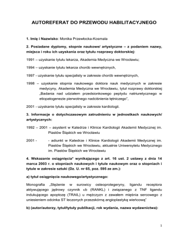 AUTOREFERAT DO PRZEWODU HABILITACYJNEGO 1. Imię i Nazwisko: Monika Przewłocka-Kosmala 2. Posiadane dyplomy, stopnie naukowe/ artystyczne – z podaniem nazwy, miejsca i roku ich uzyskania oraz tytułu rozprawy doktorskiej: 1991 – uzyskanie tytułu lekarza, Akademia Medyczna we Wrocławiu; 1994 – uzyskanie tytułu lekarza chorób wewnętrznych, 1997 - uzyskanie tytułu specjalisty w zakresie chorób wewnętrznych, 1998 – uzyskanie stopnia naukowego doktora nauk medycznych w zakresie medycyny, Akademia Medyczna we Wrocławiu, tytuł rozprawy doktorskiej „Badania nad udziałem przedsionkowego peptydu natriuretycznego w etiopatogenezie pierwotnego nadciśnienia tętniczego”, 2001 - uzyskanie tytułu specjalisty w zakresie kardiologii. 3. Informacje o dotychczasowym zatrudnieniu w jednostkach naukowych/ artystycznych: 1992 – 2001 – asystent w Katedrze i Klinice Kardiologii Akademii Medycznej im. Piastów Śląskich we Wrocławiu 2001 - - adiunkt w Katedrze i Klinice Kardiologii Akademii Medycznej im. Piastów Śląskich we Wrocławiu, aktualnie Uniwersytetu Medycznego im. Piastów Śląskich we Wrocławiu 4. Wskazanie osiągnięcia* wynikającego z art. 16 ust. 2 ustawy z dnia 14 marca 2003 r. o stopniach naukowych i tytule naukowym oraz o stopniach i tytule w zakresie sztuki (Dz. U. nr 65, poz. 595 ze zm.): a) tytuł osiągnięcia naukowego/artystycznego: Monografia „Stężenie w surowicy osteoprotegeryny, ligandu receptora aktywującego jądrowy czynnik b (RANKL) i związanego z TNF ligandu indukującego apoptozę (TRAIL) u mężczyzn z zawałem mięśnia sercowego z uniesieniem odcinka ST leczonych przezskórną angioplastyką wieńcową” b) (autor/autorzy, tytuł/tytuły publikacji, rok wydania, nazwa wydawnictwa): 1 Monika Przewłocka-Kosmala „Stężenie w surowicy osteoprotegeryny, ligandu receptora aktywującego jądrowy czynnik b (RANKL) i związanego z TNF ligandu indukującego apoptozę (TRAIL) u mężczyzn z zawałem mięśnia sercowego z uniesieniem odcinka ST leczonych przezskórną angioplastyką wieńcową” 2013 Wydawnictwo Uniwersytetu Medycznego im. Piastów Śląskich we Wrocławiu c) omówienie celu naukowego/artystycznego ww. pracy/prac i osiągniętych wyników wraz z omówieniem ich ewentualnego wykorzystania: Choroba niedokrwienna serca i zawał mięśnia serca będący często pierwszą jej manifestacją, stanowią aktualnie najczęstszą przyczynę zgonu na świecie, dominującą przede wszystkim w krajach rozwiniętych. O ile szeroko stosowana profilaktyka, nowoczesne sposoby opieki nad pacjentami we wczesnej fazie zawału i wysoko zaawansowane metody jego interwencyjnego leczenia spowodowały spadek umieralności z powodu tej jednostki chorobowej, to jednak nie rozwiązały całkowicie problemu związanego z pozawałowym uszkodzeniem mięśnia serca. Wydłużone przeżycie chorych po przebytym zawale sprzyja wręcz ujawnianiu się większej ilości przypadków niewydolności serca na tle niedokrwiennym i to pomimo stosowania optymalnej na chwilę obecną farmakoterapii. W związku z tym dużego znaczenia nabiera kwestia identyfikacji chorych najbardziej zagrożonych niekorzystnymi następstwami zawału oraz poszukiwania innowacyjnych leków, które działając na nie do końca jeszcze dobrze poznane ogniwa łańcucha patologicznego, mogą zapobiegać progresji dysfunkcji lewej komory serca (LV) do jej jawnej niewydolności. W ostatnich latach istotną rolę w rozwoju miażdżycy oraz w zjawiskach związanych z zawałem mięśnia serca i jego konsekwencjach przypisuje się cząsteczkom z rodziny TNF takim jak osteoprotegeryna (OPG) i jej dwa ligandy: ligand receptora aktywującego jądrowy czynnik B (RANKL) i związany z TNF ligand indukujący apoptozę (TRAIL), których znaczenie zostało dotychczas poznane w kontekście metabolizmu kostnego i ochrony przeciwnowotoworowej. Oba ligandy wykazują wielokierunkowe działanie, często uzależnione od rodzaju receptora z którym się łączą. RANKL stymuluje różnicowanie i aktywację niektórych komórek, jak również nasila degradację macierzy pozakomórkowej. TRAIL wywołuje apoptozę komórek, może też wykazywać działanie parakrynne analogiczne do RANKL. OPG łącząc się z każdym z ligandów jako receptor wabikowy neutralizuje ich efekt. Doniesienia z ostatnich lat wskazują na ważną rolę rokowniczą wszystkich trzech składowych układu OPG-RANKL-TRAIL w miażdżycy i jej następstwach oraz w schorzeniach kardiologicznych. 2 Celem podjętych przeze mnie badań w populacji mężczyzn z pierwszym w życiu zawałem mięśnia serca z uniesieniem odcinka ST leczonych pierwotną plastyką tętnicy wieńcowej była: (1) ocena stężeń OPG, sRANKL i TRAIL w surowicy w ostrej fazie zawału i ich zmian w okresie pozawałowym; (2) identyfikacja czynników determinujących stężenia OPG, sRANKL i TRAIL w surowicy w okresie okołozawałowym; (3) ocena zależności pomiędzy stężeniami OPG, sRANKL i TRAIL w surowicy i dynamiką ich zmian w okresie okołozawałowym i pozawałowym a przebiegiem zmian czynnościowych i strukturalnych lewej komory po zawale w trakcie 6-miesięcznej obserwacji. Badania zostały przeprowadzone u 150 mężczyzn w średnim wieku 61.1±10.4 lat leczonych skutecznie pierwotną przezskórną angioplastyką wieńcową z powodu pierwszego w życiu zawału mięśnia serca z uniesieniem odcinka ST. Grupy referencyjne obejmowały: pierwsza - 50 mężczyzn w średnim wieku 63.4±9.2 lat ze stabilną postacią choroby wieńcowej oraz druga - 44 mężczyzn w średnim wieku 60.6±8.9 lat bez miażdżycy. Do badań nie włączano pacjentów z przebytym w przeszłości zawałem i/lub rewaskularyzacją mięśnia serca, istotnym przerostem LV, wadami serca, kardiomiopatiami, istotną miażdżycą pozasercową, zaburzeniami endokrynologicznymi (poza cukrzycą typu 2), schorzeniami układowymi, zapalnymi, autoimmunologicznymi i nowotworowymi, osteopenią i osteoporozą, przewlekł