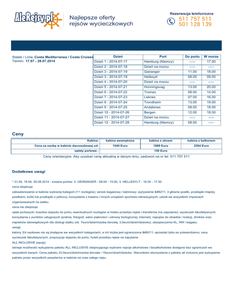 Dzień Statek / Linia: Costa Mediterranea / Costa Cruises Termin: 17.07 - 28.07.2014 Dzień 1 - 2014-07-17 Port Hamburg (Niemcy) Do portu W morze --:-- 17.00 Dzień 2 - 2014-07-18 Dzień na morzu --:-- --:-- Dzień 3 - 2014-07-19 Geiranger 11.00 18.00 Dzień 3 - 2014-07-19 Hellesylt 08.00 09.00 Dzień 4 - 2014-07-20 Dzień na morzu --:-- --:-- Dzień 5 - 2014-07-21 Honningsvag 13.00 20.00 Dzień 6 - 2014-07-22 Tromso 08.00 14.00 Dzień 7 - 2014-07-23 Leknes 07.00 16.00 Dzień 8 - 2014-07-24 Trondheim 13.00 19.00 Dzień 9 - 2014-07-25 Andalsnes 08.00 18.00 Dzień 10 - 2014-07-26 Bergen 12.00 18.00 Dzień 11 - 2014-07-27 Dzień na morzu --:-- --:-- Dzień 12 - 2014-07-28 Hamburg (Niemcy) 08.00 --:-- Ceny Kabina: kabina wewnętrzna kabina z oknem kabina z balkonem 1549 Euro 1989 Euro 2264 Euro Cena za osobę w kabinie dwuosobowej od: opłaty portowe : 150 Euro Ceny orientacyjne. Aby uzyskać cenę aktualną w danym dniu, zadzwoń na nr tel. 511 757 511 Dodatkowe uwagi * 31.05, 18.06, 26.08.2014 - zmiana portów: 3. GEIRANGER - 08:00 - 15:00, 3. HELLESYLT - 16:30 - 17:30 cena obejmuje: zakwaterowanie w kabinie wybranej kategorii (11 noclegów); serwis bagażowy i kabinowy; wyżywienie – 3 główne posiłki, przekąski między posiłkami, bufet lub przekąski o północy; korzystanie z basenu i innych urządzeń sportowo-rekreacyjnych; udział we wszystkich imprezach organizowanych na statku. cena nie obejmuje: opłat portowych; kosztów dojazdu do portu; ewentualnych noclegów w hotelu przed/po rejsie i transferów (na zapytanie); wycieczek fakultatywnych; korzystania z punktów usługowych (pralnia, fotograf, salon piękności i odnowy biologicznej, internet); napojów do obiadów i kolacji, drinków oraz napiwków obowiązkowych dla obsługi statku (ok. 7euro/dzień/osobę dorosłą; 3,5euro/dzień/dziecko); ubezpieczenia KL, NW i bagażu. uwagi: kabiny 3/4 osobowe nie są dostępne we wszystkich kategoriach, a ich liczba jest ograniczona – sprzedaż tylko po potwierdzeniu; ceny wycieczek fakultatywnych, propozycje dojazdu do portu, hoteli przed/po rejsie na zapytanie. ALL INCLUSIVE (opcja) istnieje możliwość wykupienia pakietu ALL INCLUSIVE obejmującego wybrane napoje alkoholowe i bezalkoholowe dostępne bez ograniczeń we wszystkich barach. Cena pakietu 23,5euro/dzień/osoba dorosła i 15euro/dzień/dziecko. Warunkiem skorzystania z pakietu all inclusive jest wykupienie pakietu przez wszystkich pasażerów w kabinie na czas całego rejsu. Costa Mediterranea Costa Mediterranea Tonaż: 86.000 ton Rok budowy: 2003 Długość: 292 m Szerokość: 32 m Szybkość: 22 węzły Pokłady pasażerskie: 12 Załoga: 912 Pasażerowie: 2.680 Basen: 4 (4 jacuzzi, basen dla dzieci) Waluta: EURO Do dyspozycji: 3 restauracje, bary (w tym Cigar Bar i Wine Bar), kasyno, teatr na 3 pokładach, dyskoteka, salon piękności, fitness center, sauna, sala gimnastyczna, kort tenisowy, trasa do joggingu (110m), biblioteka, kawiarenka internetowa, sala gier video, butiki, punkt medyczny. Kabiny: 999 kabin wyposażonych w łazienkę (prysznic, wc, suszarka), klimatyzację, telefon, sejf, mini bar, telewizję satelitarną, radio pokładowe. 620 posiada prywatny balkon. Na statku znajduje się 58 kabin typu suite (wszystkie z balkonami). Costa Mediterranea dysponuje również kabinami, które są przystosowane dla osób niepełnosprawnych. Room Service dostępny 24h na dobę.