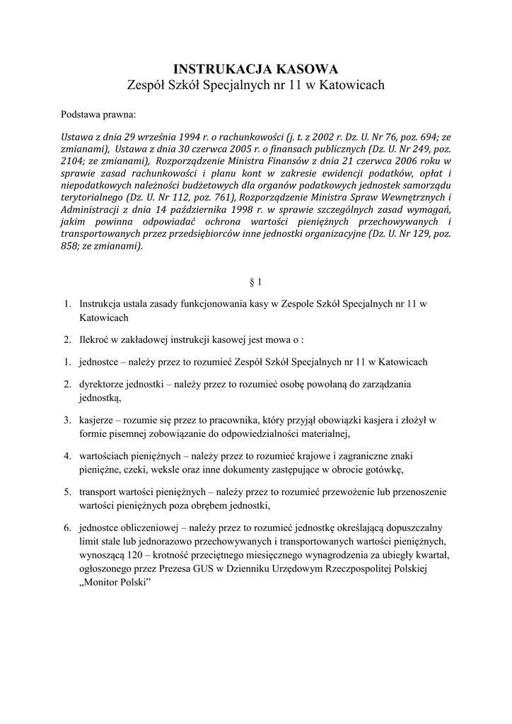 INSTRUKACJA KASOWA Zespół Szkół Specjalnych nr 11 w Katowicach Podstawa prawna: Ustawa z dnia 29 września 1994 r. o rachunkowości (j. t. z 2002 r. Dz. U. Nr 76, poz. 694; ze zmianami), Ustawa z dnia 30 czerwca 2005 r. o finansach publicznych (Dz. U. Nr 249, poz. 2104; ze zmianami), Rozporządzenie Ministra Finansów z dnia 21 czerwca 2006 roku w sprawie zasad rachunkowości i planu kont w zakresie ewidencji podatków, opłat i niepodatkowych należności budżetowych dla organów podatkowych jednostek samorządu terytorialnego (Dz. U. Nr 112, poz. 761), Rozporządzenie Ministra Spraw Wewnętrznych i Administracji z dnia 14 października 1998 r. w sprawie szczególnych zasad wymagań, jakim powinna odpowiadać ochrona wartości pieniężnych przechowywanych i transportowanych przez przedsiębiorców inne jednostki organizacyjne (Dz. U. Nr 129, poz. 858; ze zmianami). §1 1. Instrukcja ustala zasady funkcjonowania kasy w Zespole Szkół Specjalnych nr 11 w Katowicach 2. Ilekroć w zakładowej instrukcji kasowej jest mowa o : 1. jednostce – należy przez to rozumieć Zespół Szkół Specjalnych nr 11 w Katowicach 2. dyrektorze jednostki – należy przez to rozumieć osobę powołaną do zarządzania jednostką, 3. kasjerze – rozumie się przez to pracownika, który przyjął obowiązki kasjera i złożył w formie pisemnej zobowiązanie do odpowiedzialności materialnej, 4. wartościach pieniężnych – należy przez to rozumieć krajowe i zagraniczne znaki pieniężne, czeki, weksle oraz inne dokumenty zastępujące w obrocie gotówkę, 5. transport wartości pieniężnych – należy przez to rozumieć przewożenie lub przenoszenie wartości pieniężnych poza obrębem jednostki, 6. jednostce obliczeniowej – należy przez to rozumieć jednostkę określającą dopuszczalny limit stale lub jednorazowo przechowywanych i transportowanych wartości pieniężnych, wynoszącą 120 – krotność przeciętnego miesięcznego wynagrodzenia za ubiegły kwartał, ogłoszonego przez Prezesa GUS w Dzienniku Urzędowym Rzeczpospolitej Polskiej „Monitor Polski” Zabezpieczenie mienia i wartości pieniężnych §2 1. Wartości pieniężne powinny być przechowywane w warunkach zapewniających należytą ochronę. 1. w kasecie stalowej, 2. w szafie pancernej, do której chowa kasetę po zamknięciu kasy lub gdy opuszcza pomieszczenie kasy w trakcie godzin pracy. Transport wartości pieniężnych §3 1. Za prawidłowe zorganizowanie ochrony transportu wartości pieniężnych odpowiedzialny jest dyrektor jednostki. Kasjer §4 1. Kasjerem jest osoba, która: a) posiada wykształcenie średnie, b) nie jest karana za przestępstwa gospodarcze lub wykroczenia przeciwko mieniu, c) ma nienaganną opinię, d) posiada pełną zdolność do czynności prawnych. 2. Kasjer odpowiada za: a) stan gotówki w kasie, b) funkcjonowanie kasy, c) powierzone mu mienie. 3. Przyjmując obowiązki, kasjer składa pisemną deklarację odpowiedzialności o treści: „W związku z powierzeniem mi obowiązków kasjera, przyjmuję do wiadomości, że ponoszę materialną odpowiedzialność za stan gotówki w kasie, funkcjonowanie kasy, oraz powierzone mienie. Zobowiązuję się do przestrzegania przepisów w zakresie prowadzenia operacji kasowych, transportu gotówki i ponoszę odpowiedzialność za ich naruszenie”. Data i podpis. 4. Przyjęcie lub przekazanie kasy może nastąpić tylko przy sporządzeniu protokołu, w obecności komisji wyznaczonej przez głównego księgowego. 5. Dyrektor zapoznaje kasjera z zasadami gospodarki kasowej w jednostce, zawartymi w niniejszej instrukcji. Fakt ten kasjer potwierdza wpisując adnotację o treści : „Oświadczam, że zapoznałam się z niniejszą instrukcją oraz zobowiązuję się do jej stosowania„ - data i własnoręczny podpis. 6. Kasjer otrzymuje kopie: a) wykazu osób upoważnionych do dysponowania gotówką i zatwierdzania dowodów kasowych oraz wzory ich podpisów stanowiącego załącznik, b) obowiązującą w jednostce instrukcję kasową. §5 1. Kasjer zobowiązany jest do zachowania tajemnicy o terminach i wysokościach przechowywanych i transportowanych wartości pieniężnych. Gospodarka kasowa §6 1. W kasie znajdują się następujące środki pieniężne i papiery wartościowe: a) niezbędny zapas gotówki na bieżące wydatki ( tzw. pogotowie kasowe ) b) gotówka podjęta z rachunku bankowego na pokrycie określonych rodzajowo wydatków, c) gotówka pochodząca z bieżących wpłat do kasy jednostki 2. Wysokość niezbędnego zapasu gotówki w kasie wynosi 500,00 zł. 3. Gotówkę podjętą z rachunku bankowego na pokrycie określonych rodzajowo wydatków jednostka przeznacza na cel określony przy jej podjęciu. Dowody kasowe §7 1. Wpłaty gotówki są dokonywane wyłącznie na podstawie ujednoliconych dla wpłat z wszelkich tytułów przychodowych dowodów kasowych, podpisanych przynajmniej przez kasjera, na podstawie którego wystawia się w każdym dniu dowody kasowe KP – „Kasa przyjmie”. 2. Dowód KP zawiera co najmniej: podpis kasjera przyjmującego gotówkę, numer dowodu, datę wpłaty, tytuł dokonywanej wpłaty, kwotę wpłaty wypisaną cyframi i słownie . 3. Kwotę wpłaty kasjer wpisuje do właściwego raportu kasowego, a zainkasowaną gotówkę odprowadza na rachunek bankowy. Terminowość i prawidłowość odprowadzenia do banku przyjętych do kasy wpłat jest sprawdzana przez głównego księgowego lub upoważnioną przez niego osobę. Dokonanie sprawdzenia jest potwierdzane na sporządzonych raportach kasowych lub na poszczególnych stronach kwitariusza przez podpisanie klauzuli: data ......sprawdził, .................. podpis głównego księgowego”. §8 1. Wypłata gotówki z kasy może być zrealizowana na podstawie dowodów źródłowych uzasadniających wypłatę. 2. Odbiorca gotówki kwituje odbiór w sposób trwały swoim podpisem oraz datą otrzymania gotówki i wpisaniem kwoty słownie. §9 1. Źródłowe dowody