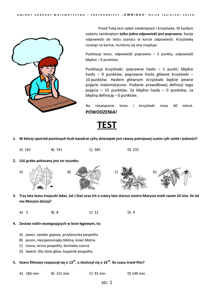 G M I N N Y K O N K U R S M A T E M A T Y C Z N O – P R Z Y R O D N I C Z Y „ OMNIBUS ” O S I E K J A S I E L S K I 2 0 1 1 R . Przed Tobą test zadań zamkniętych i krzyżówka. W każdym zadaniu zamkniętym tylko jedna odpowiedź jest poprawna. Swoje odpowiedzi do testu zaznacz w karcie odpowiedzi. Krzyżówkę rozwiąż na kartce, na której się ona znajduje. Punktacja testu: odpowiedź poprawna – 2 punkty, odpowiedź błędna – 0 punktów. Punktacja krzyżówki: poprawne hasło – 1 punkt, błędne hasło – 0 punktów, poprawne hasło główne krzyżówki – 10 punktów. Hasłem głównym krzyżówki będzie pewne pojęcie matematyczne. Podanie prawidłowej definicji tego pojęcia – 15 punktów. Za błędne hasła – 0 punktów, za błędną definicję – 0 punktów. Na rozwiązanie testu i krzyżówki masz 60 minut. POWODZENIA! TEST 1. W której spośród poniższych liczb kwadrat cyfry dziesiątek jest równy potrojonej sumie cyfr setek i jedności? A) 192 B) 741 C) 385 D) 231 2. Liść grabu pokazany jest na rysunku: A) B) C) D) 3. Trzy lata temu trojaczki Adaś, Jaś i Staś oraz ich o cztery lata starsza siostra Marysia mieli razem 24 lata. Ile lat ma Marysia dzisiaj? A) 5 B) 8 C) 12 D) 9 4. Zestaw roślin występujących w lesie łęgowym, to: A) B) C) D) jawor, zawilec gajowy, przylaszczka pospolita jesion, niezapominajka błotna, knieć błotna sosna, wrzos pospolity, borówka czarna świerk, lilia złoto głów, kopytnik pospolity 5. Seans filmowy rozpoczął się o 1347, a skończył się o 1618. Ile czasu trwał film? A) 185 min B) 151 min C) 91 min str. 1 D) 149 min G M I N N Y K O N K U R S M A T E M A T Y C Z N O – P R Z Y R O D N I C Z Y „ OMNIBUS ” O S I E K J A S I E L S K I 2 0 1 1 R . 6. Zdjęcie przedstawia zniszczony las w Sudetach. Przyczyna tej sytuacji, to: A) ścieka B) kwaśne deszcze C) smog D) śmieci pozostawiane przez turystów 7. Krzyś, jadąc rowerem, pokonał 6 kilometrów w ciągu 20 minut, a więc jechał z prędkością: A) 30 km/h B) 18 km/h C) 12 km/h D) 6 km/h 8. Czynnikiem powodującym mieszanie się wody w jeziorze jest: A) tlen rozpuszczony w wodzie B) światło docierające w głąb jeziora C) temperatura wody D) różnorodność organizmów żyjących w jeziorze 9. Skacząc do basenu z trampoliny odbijam się od niej na wysokość metra, następnie spadam w dół 5 metrów, wreszcie wypływając w górę 2 metry osiągam powierzchnię wody. Na jakiej wysokości nad poziomem wody znajduje się trampolina? A) 2 m B) 1 m C) 3 m D) 4 m C) zamarzaniem D) topnieniem 10. Przejście gazu w stan ciekły to proces zwany: zwany A) parowaniem B) skraplaniem 11. Stary zegar spóźnia się 8 minut na dobę. O ile trzeba go posunąć w przód wieczorem o godzinie 2200, aby następnego ranka o godzinie 700 wskazał dokładną godzinę? godzinę A) 1 min. 40 sek. B) 2 min. 20 sek. C) 3 min. D) 6 min. 12. Podstawowym elementem budowy każdego organizmu żywego jest: C) tkanka B) narząd C) komórka D) organ 13. Wzdłuż ścieżki rośnie 10 drzew w odstępach co 4 metry. Jaka jest odległość pomiędzy pierwszym i ostatnim drzewem? A) 44 m B) 32 m C) 40 m D) 36 m 14. Organem, który utrzymuje roślinę w podłożu i pobiera wodę i sole mineralne z gleby jest: jest A) liść B) kwiat C) korzeń str. 2 D) łodyga G M I N N Y K O N K U R S M A T E M A T Y C Z N O – P R Z Y R O D N I C Z Y „ OMNIBUS ” O S I E K J A S I E L S K I 2 0 1 1 R . 15. Bilet wstępu do muzeum kosztuje 1 zł dla dorosłych. Dzieci płacą połowę tej ceny. W ubiegłą niedzielę muzeum odwiedziło 50 osób, płacąc za bilety łącznie 35 zł. Ilu dorosłych było wśród zwiedzających? A) 20 B) 18 C) 25 D) 40 16. Drzewem o miękkich, zielonych igłach, które opadają na zimę, jest: A) sosna B) modrzew C) cis pospolity D) jodła 17. Jaka jest reszta z dzielenia przez 8 liczby CDLXIX : A) 7 B) 5 C) 4 D) 3 18. W którym przykładzie podano wyłącznie organizmy łąkowe? A) B) C) D) jeleń, burak cukrowy, pająk, stokrotka kasztanowiec, kowalik, gil, śnieguliczka trawa, biedronka, jaskier, pszczoła forsycja, jarząb, dzik, trzmiel 19. Na planie w skali 1 : 3 000 prostokątna działka ma wymiary 3 cm X 5 cm. Jaka jest powierzchnia tej działki w rzeczywistości? A) 15 a B) 12,5 a C) 1,35 ha D) 1,5 ha C) ciśnienie D) termometr 20. Składnikiem pogody nie jest: A) wiatr B) opady A teraz pora na uśmiech. str. 3 G M I N N Y K O N K U R S M A T E M A T Y C Z N O – P R Z Y R O D N I C Z Y „ OMNIBUS BRUDNOPIS str. 4 ” O S I E K J A S I E L S K I 2 0 1 1 R . G M I N N Y K O N K U R S M A T E M A T Y C Z N O ..................................................................... – P R Z Y R O D N I C Z Y „ OMNIBUS ” O S I E K J A S I E L S K I 2 0 1 1 R . KRZYŻÓWKA MATEMATYCZNO - PRZYRODNICZA IMIĘ I NAZWISKO UCZESTNIKA KONKURSU 1. 2. 3. 4. 5. 6. 7. 8. 9. 10. 11. 12. 13. 14. 15. 16. 17. 18. 1. 2. 3. 4. 5. 6. 7. 8. 9. 10. 11. 12. 13. 14. 15. 16. 17. 18. Liczby, które mają dokładnie dwa dzielniki. Jedna z planet Układu Słonecznego. Kwadrat liczby 3. Fragment prostej, ograniczony dwoma punktami. Klimat panujący w Polsce. Łamana zamknięta. 10 Element neutralny mnożenia. Przyrząd do mierzenia ciśnienia atmosferycznego. Prostokąt, który ma wszystkie boki równe. Groźna choroba zakaźna przenoszona przez zwierzęta. Najdłuższa cięciwa. Teoria Mikołaja Kopernika mówiąca o tym, że Ziemia, podobnie jak inne planety, obraca się wokół własnej osi i krąży wokół Słońca. Liczba, która w systemie rzymskim zapisywana jest jako C. Najwyższe drzewo świata. Roślina występująca w środowisku wodnym. Kąt, którego miara jest mniejsza niż 90 stopni. Ułamek zwykły, w którym licznik jest większy od mianownika. Hasło główne krzyżówki: ................................................................................................................................................... Definicja, określająca pojęcie będące h