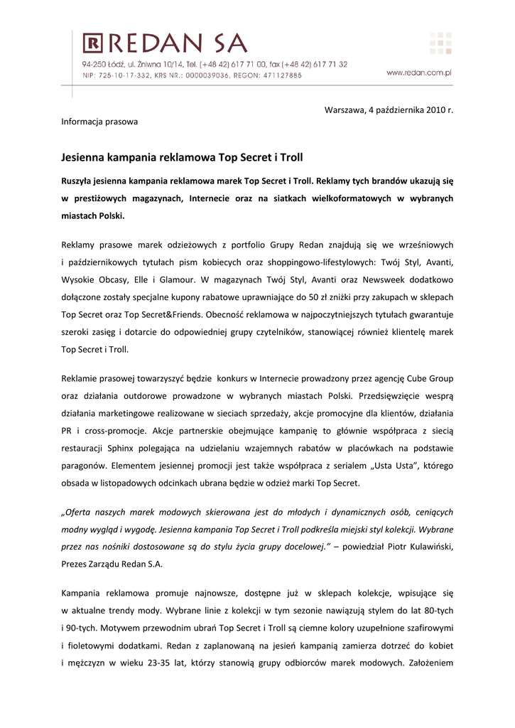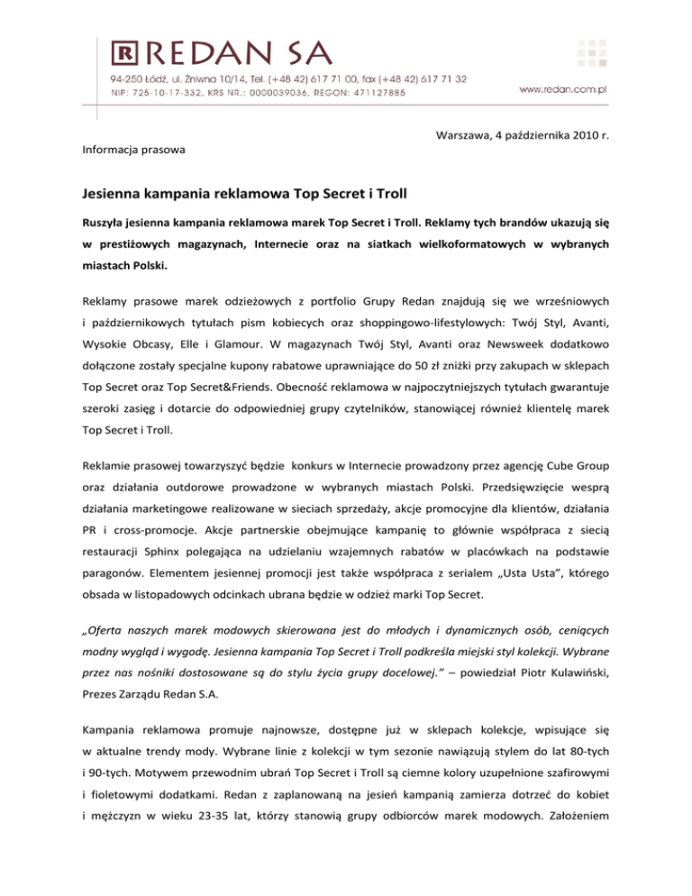 Warszawa, 4 października 2010 r. Informacja prasowa Jesienna kampania reklamowa Top Secret i Troll Ruszyła jesienna kampania reklamowa marek Top Secret i Troll. Reklamy tych brandów ukazują się w prestiżowych magazynach, Internecie oraz na siatkach wielkoformatowych w wybranych miastach Polski. Reklamy prasowe marek odzieżowych z portfolio Grupy Redan znajdują się we wrześniowych i październikowych tytułach pism kobiecych oraz shoppingowo-lifestylowych: Twój Styl, Avanti, Wysokie Obcasy, Elle i Glamour. W magazynach Twój Styl, Avanti oraz Newsweek dodatkowo dołączone zostały specjalne kupony rabatowe uprawniające do 50 zł zniżki przy zakupach w sklepach Top Secret oraz Top Secret&Friends. Obecnośd reklamowa w najpoczytniejszych tytułach gwarantuje szeroki zasięg i dotarcie do odpowiedniej grupy czytelników, stanowiącej również klientelę marek Top Secret i Troll. Reklamie prasowej towarzyszyd będzie konkurs w Internecie prowadzony przez agencję Cube Group oraz działania outdorowe prowadzone w wybranych miastach Polski. Przedsięwzięcie wesprą działania marketingowe realizowane w sieciach sprzedaży, akcje promocyjne dla klientów, działania PR i cross-promocje. Akcje partnerskie obejmujące kampanię to głównie współpraca z siecią restauracji Sphinx polegająca na udzielaniu wzajemnych rabatów w placówkach na podstawie paragonów. Elementem jesiennej promocji jest także współpraca z serialem „Usta Usta”, którego obsada w listopadowych odcinkach ubrana będzie w odzież marki Top Secret. „Oferta naszych marek modowych skierowana jest do młodych i dynamicznych osób, ceniących modny wygląd i wygodę. Jesienna kampania Top Secret i Troll podkreśla miejski styl kolekcji. Wybrane przez nas nośniki dostosowane są do stylu życia grupy docelowej.” – powiedział Piotr Kulawioski, Prezes Zarządu Redan S.A. Kampania reklamowa promuje najnowsze, dostępne już w sklepach kolekcje, wpisujące się w aktualne trendy mody. Wybrane linie z kolekcji w tym sezonie nawiązują stylem do lat 80-tych i 90-tych. Motywem przewodnim ubrao Top Secret i Troll są ciemne kolory uzupełnione szafirowymi i fioletowymi dodatkami. Redan z zaplanowaną na jesieo kampanią zamierza dotrzed do kobiet i mężczyzn w wieku 23-35 lat, którzy stanowią grupy odbiorców marek modowych. Założeniem działao reklamowych jest poinformowanie o ofercie opartej o najnowsze trendy w modzie i zachęcenie klientów do odwiedzenia sklepów, a przez to zwiększenie sprzedaży. *** Redan SA jest operatorem znanych detalicznych marek odzieżowych: Top Secret, Troll i Textilmarket. Spółka funkcjonuje w ramach Grupy Kapitałowej, która zajmuje się projektowaniem, marketingiem oraz dystrybucją odzieży. Redan zleca swoją produkcję fabrykom w Polsce, Chinach, Indiach, Turcji, Korei i Bangladeszu. W Polsce grupa kapitałowa zatrudnia ponad półtora tysiąca osób. Sprzedaż jest prowadzona w 4 sieciach detalicznych: Top Secret, Troll, Top Secret&Friends oraz Textilmarket liczących blisko 400 sklepów. Redan powstał w 1995 roku. W 2003 roku akcje spółki zostały dopuszczone do publicznego obrotu na Giełdzie Papierów Wartościowych w Warszawie. Centrala spółki znajduje się w Łodzi. Dodatkowych informacji udziela: Anna Nesterowicz tel.: 022 833 35 02 wew. 106 kom.: 664 926 910 e-mail: [email protected]