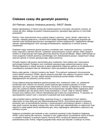 Ciekawe czasy dla genetyki pszenicy Ed Flatman, starszy hodowca pszenicy, RAGT Seeds Nastał najciekawszy w historii czas dla hodowli pszenicy w Europie, ale pewnie uznacie, Ŝe mówię tak tylko, dlatego Ŝe jestem hodowcą pszenicy i genetyka tego gatunku to mój chleb powszedni! Rolnicy i sieci Ŝywnościowe chcą uzyskać więcej z pszenicy - plony, jakość, odporność na choroby, najlepiej połączone z cechami które będą odpowiadały nieregularnej pogodzie jak równieŜ coraz bardziej specyficznym wymaganiom rynków ostatecznych. Zapewnienie takiego zakresu odpowiadających cech wymaga przewidywania, współpracy w ramach branŜy i cierpliwości. Dokładne mapy markerów genów pszenicy umoŜliwiły nam, hodowcom pszenicy, uczynienie kroku naprzód w zakresie technik i szybkości opracowywania nowych odmian. Nasz zespół w Ickleton w Angli pracuje nad mapą genomów pszenicy od ponad dekady. 'Mapa' zdefiniowała na nowo programy hodowli pszenicy umoŜliwiając nam zlokalizowanie pozycji i wzajemnych relacji waŜnych genów w ramach genetycznego układu pszenicy. Ponadto dopiero odkrywamy wierzchołek góry moŜliwości, które dadzą nam nowoczesne technologie hodowli. Dostępne nam moŜliwość genetycznego sekwencjonowania rosną. Wkrótce będziemy w stanie wykonać w jedno popołudnie mapę tylu genów na ile dekadę temu musielibyśmy poświęcić kilka lat. MoŜliwości, które pousiadamy dzisiaj są niezwykłe. Mamy wiele genów, z którymi moŜemy się 'bawić'. Przy pełnych zestawach chromosomów trzech dzikich krewnych (CRW), genom pszenicy jest pięć razy większy niŜ genom ludzki. Aby opisać skalę powiem, Ŝe nasz zespół aktualnie produkuje ponad siedem milionów segregowanych linii pszenicy ozimej rocznie. Coraz większa precyzja śledzenia genów pozwala nam, hodowcom roślin, na „ustawianie” kombinacji cech, których nie chcemy utracić podczas gdy szukamy poprawy w innych obszarach, jak na przykład wielkość plonów. Oznacza to równieŜ, Ŝe będziemy w stanie łączyć geny dla uzyskania efektów dodatkowychi lub kompensować wszelkie efekty negatywne jakie jeden poŜądany gen dla danej cechy moŜe wywoływać u innych. Daje to równieŜ wielkie korzyści przy selekcji cech, których identyfikacja jest trudna lub czasochłonna. To sprawia, Ŝe wprowadzenie nowych cech z szerokich krzyŜowań jest duŜo łatwiejsze. Jako przykład weźmy odmianę Relay, pszenicę Grupy 4, o najwyŜszym 9-tym stopiniu odporności na rdzę Ŝółtą wg Listy Rekomendowanej HGCA. Zrozumienie genomu pszenicy pozwoliło nam na wyhodowanie odmiany z towarzyszącym pomniejszym genem o stopniu 6, więc jeŜeli rozwinie się jakaś mutacja rdzy, która ominie gen odpowiedzialny za odporność 9-go stopnia to nadal będzie istniał wartościowy gen, który zapobiegnie całkowitemu załamaniu się odmiany na polu. Kolejnym przykładem jest hodowla w celu uzyskania wysokiej Liczby Opadania Hagberga (HFN), cechy waŜnej dla młynarzy. Hodując w celu uodpornienia na porastanie ziarna w kłosie, w zasadzie hodujemy w pewnym stopniu ochronę HFN, na którą źle wpływa porastanie powodowane przez mokrą i wilgotną pogodę kiedy zboŜe jest dojrzałe i oczekuje na Ŝniwa. Czynimy postępy w pracy nad waŜnymi cechami, jak geny odpowiedzialne za odporność na fuzariozę, paciornicę pszeniczankę, choroby podsuszkowe, rdzę brunatna i Ŝółtą jak równieŜ pracujemy nad rozwiązaniem całej historii Septoria tritici. Mamy równieŜ spore osiągnięcia w ustalaniu składników funkcjonalności białka i skrobi oraz w określaniu genów o zaskakująco duŜym wpływie na wydajność plonów, tak abyśmy mogli zmaksymalizować zarówno ilościowe jak i jakościowe usprawnienia genetyczne. Mamy teraz moŜliwości technologiczne o jakich 10 lat temu mogliśmy tylko marzyć. Z tego względu jesteśmy pewni moŜliwości dostarczania w przyszłości odmian pszenicy ozimej o coraz wyŜszej wartości dla gospodarstw i rynku ostatecznego.