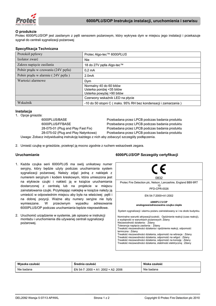 6000PLUS/OP Instrukcja instalacji, uruchomienia i serwisu O produkcie Protec 6000PLUS/OP jest zasilanym z pętli sensorem pożarowym, który wykrywa dym w miejscu jego instalacji i przekazuje sygnał do centrali sygnalizacji pożarowej Specyfikacja Techniczna Protokół pętlowy Izolator zwarć Zakres napięcie zasilania Pobór prądu w czuwaniu (24V pętla) Pobór prądu w alarmie ( 24V pętla ) Wartości alarmowe Wskaźnik Protec Algo-tec™ 6000PLUS Nie 18 do 27V pętla Algo-tec™ 0.2 mA 2.0mA Dym Normalny 40 do 60 bitów Usterka poniżej <35 bitów Usterka powyżej >90 bitów Czerwony wskaźnik LED na płycie -10 do 50 stopni C ( maks. 95% RH bez kondensacji i zamarzania ) Instalacja 1. Opcje gniazda: 6000PLUS/BASE Przebadana przez LPCB podczas badania produktu 6000PLUS/FFBASE Przebadana przez LPCB podczas badania produktu 28-075-01 (Plug and Play Fast Fix) Przebadana przez LPCB podczas badania produktu 28-075-02 (Plug and Play Natynkowa) Przebadana przez LPCB podczas badania produktu Uwaga: Zobacz indywidualną instrukcję każdego z nich aby zobaczyć szczegóły podłączenia. 2. Umieść czujkę w gnieździe, przekręć ją mocno zgodnie z ruchem wskazówek zegara. 6000PLUS/OP Szczegóły certyfikacji Uruchamianie 1. Każda czujka serii 6000PLUS ma swój unikatowy numer seryjny, który będzie użyty podczas uruchamiania system sygnalizacji pożarowej. Należy zdjąć jedną z naklejek z numerem seryjnym i kodem kreskowym, która umieszona jest na etykiecie czujki i nakleić ją w książce uruchamiania dostarczonej z centralą lub na projekcie w miejscu zainstalowania czujki. Przyklejając naklejkę w książce należy ją umieścić w odpowiednim miejscu aby była na właściwej pętli i na dobrej pozycji. Ważne aby numery seryjne nie były wymieszane. W przeciwnym wypadku adresowanie 6000PLUS/OP podczas uruchamiania będzie nieprawidłowe. 2. Uruchomić urządzenie w systemie, jak opisano w instrukcji montażu i uruchomienia dla używanej centrali sygnalizacji pożarowej. 0832 Protec Fire Detection plc, Nelson, Lancashire, England BB9 6RT 10 PFD-CPR-0026 EN 54-7:2000+A1:2002 6000PLUS/OP analogowa/adresowalna czujka ciepła System sygnalizacji i alarmu pożaru zainstalowany w i na około budynku. Nominalne warunki aktywacji/czułość. Opóźnienie reakcji (czas reakcji), a wydajność w warunkach pożarowych: Zdany Niezawodność działania : Zdany Tolerancja napięcia zasilania : Zdany Trwałość niezawodności działania i opóźnienie reakcji, odporność termiczna : Zdany Trwałość niezawodności działania, odporność na wibracje : Zdany Trwałość niezawodności działania, odporność na wilgoć : Zdany Trwałość niezawodności działania, odporność na korozję : Zdany Trwałość niezawodności działania, stabilność elektryczną : Zdany Wysoka czułość Średnia czułość Niska czułość Nie badana EN 54-7: 2000 + A1: 2002 + A2: 2006 Nie badana DEL2092 Wersja 5 07/13 AP/KKL Strona 1 z 2 Copyright © Protec Fire Detection plc 2010 6000PLUS/OP Instrukcja instalacji, uruchomienia i serwisu 6000PLUS Mechanizm zatrzaskowy Gama czujek 6000PLUS posiada zatrzask (Rysunek 1) uniemożliwiający odkręcenie czujki. Usunięcie małej plastikowej poprzeczki włączy mechanizm zatrzaskowy i kiedy czujka zostanie umieszczona w gnieździe mechanizm zablokuje ją w nim. Poprzeczka blokująca Śruby krzyżakowe Usuń Górną Komorę i oczyść siatkę oraz plastik Czyść tutaj używając miękkiego pędzelka Dno komory Rysunek 1 – Rozmieszczenie poprzeczki blokującej. oraz śrub krzyżakowych Rysunek 2 – Usunięcie obudowy zewnętrznej odsłania komorę optyczną. 6000PLUS/OP Szczegóły serwisu i konserwacji Usuń Czujkę z gniazda, sprawdź na centrali czy zasygnalizowała błąd urządzenia. Usuń dwie śruby krzyżakowe pokazane na rysunku 1. Usuń obudowę zewnętrzną. Usuń Deflektor oraz górną osłonę komory, trzymając siatkę w miejscu na górnej osłonie. Upewnij się, że rurka lampki nie zginie. Oczyść osłonę i siatkę miękkim pędzelkiem, użyj również miękkiego pędzelka do czyszczenia w środku dolnej osłony komory (zob. rys. 2) Za pomocą pędzelka wyczyść deflektor. Oczyść osłonę zewnętrzną czujki za pomocą szmatki. By złożyć, na początku umieść deflektor na górnej osłonie komory ustawiając położenie strzałki na środku komory optycznej. Upewnij się że siatka płasko przylega do osłony komory. Upewnij się że rurka od lampki jest na swoim miejscu. Upewnij się, że oba obiektywy są umieszone na spodniej osłonie komory. Umieść zespół komory/deflektora na dolnej osłonie komory. Umieść obudowę zewnętrzna używając rurki od lampki jako wskaźnik położenia. Skręć ciasno obudowę przy pomocy dwóch śrub krzyżakowych, uważaj by nie zerwać gwintu na obudowie zewnętrznej. Umieść czujkę z powrotem w gnieździe. Poczekaj na ponowne zalogowanie się czujki w centrali co zostanie potwierdzone przez zaświecenie się diody LED, następnie aktywuj sensor optyczny by sprawdzić czy centrala się aktywuje. DEL2092 Wersja 5 07/13 AP/KKL Strona 2 z 2 Copyright © Protec Fire Detection plc 2010