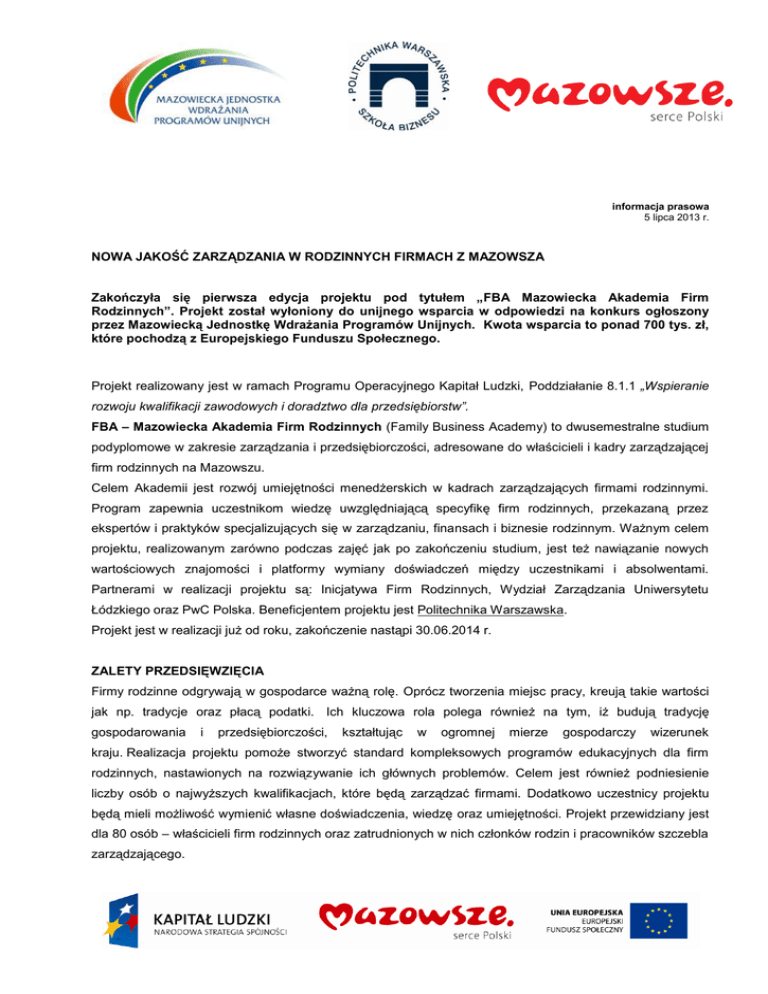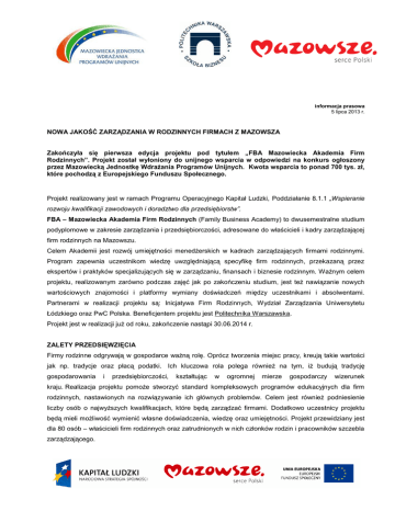 informacja prasowa 5 lipca 2013 r. NOWA JAKOŚĆ ZARZĄDZANIA W RODZINNYCH FIRMACH Z MAZOWSZA Zakończyła się pierwsza edycja projektu pod tytułem „FBA Mazowiecka Akademia Firm Rodzinnych”. Projekt został wyłoniony do unijnego wsparcia w odpowiedzi na konkurs ogłoszony przez Mazowiecką Jednostkę Wdrażania Programów Unijnych. Kwota wsparcia to ponad 700 tys. zł, które pochodzą z Europejskiego Funduszu Społecznego. Projekt realizowany jest w ramach Programu Operacyjnego Kapitał Ludzki, Poddziałanie 8.1.1 „Wspieranie rozwoju kwalifikacji zawodowych i doradztwo dla przedsiębiorstw”. FBA – Mazowiecka Akademia Firm Rodzinnych (Family Business Academy) to dwusemestralne studium podyplomowe w zakresie zarządzania i przedsiębiorczości, adresowane do właścicieli i kadry zarządzającej firm rodzinnych na Mazowszu. Celem Akademii jest rozwój umiejętności menedżerskich w kadrach zarządzających firmami rodzinnymi. Program zapewnia uczestnikom wiedzę uwzględniającą specyfikę firm rodzinnych, przekazaną przez ekspertów i praktyków specjalizujących się w zarządzaniu, finansach i biznesie rodzinnym. Ważnym celem projektu, realizowanym zarówno podczas zajęć jak po zakończeniu studium, jest też nawiązanie nowych wartościowych znajomości i platformy wymiany doświadczeń między uczestnikami i absolwentami. Partnerami w realizacji projektu są: Inicjatywa Firm Rodzinnych, Wydział Zarządzania Uniwersytetu Łódzkiego oraz PwC Polska. Beneficjentem projektu jest Politechnika Warszawska. Projekt jest w realizacji już od roku, zakończenie nastąpi 30.06.2014 r. ZALETY PRZEDSIĘWZIĘCIA Firmy rodzinne odgrywają w gospodarce ważną rolę. Oprócz tworzenia miejsc pracy, kreują takie wartości jak np. tradycje oraz płacą podatki. Ich kluczowa rola polega również na tym, iż budują tradycję gospodarowania i przedsiębiorczości, kształtując w ogromnej mierze gospodarczy wizerunek kraju. Realizacja projektu pomoże stworzyć standard kompleksowych programów edukacyjnych dla firm rodzinnych, nastawionych na rozwiązywanie ich głównych problemów. Celem jest również podniesienie liczby osób o najwyższych kwalifikacjach, które będą zarządzać firmami. Dodatkowo uczestnicy projektu będą mieli możliwość wymienić własne doświadczenia, wiedzę oraz umiejętności. Projekt przewidziany jest dla 80 osób – właścicieli firm rodzinnych oraz zatrudnionych w nich członków rodzin i pracowników szczebla zarządzającego. W ramach projektu odbyło się 180 godzin zajęć o następującej tematyce: - firma, rynek, otoczenie - elementy prawa dla firm rodzinnych - finanse firm rodzinnych - zarządzanie oraz biznes plan - przedsiębiorczość i innowacje - zarządzanie kadrami w firmie rodzinnej - fundusze unijne - etyka biznesu - warsztaty psychologiczne, dodatkowo, słuchacze mieli zaplanowane warsztaty integrujące. Po zakończeniu I edycji projektu osiągnięte rezultaty to: 31 absolwentów; platforma networkingu; klub absolwenta; wzrost jakości kapitału ludzkiego: założono wzrost wiedzy o 40% - osiągnięto 67% wzrostu wiedzy. Rekrutacja na II edycję Mazowieckiej Akademii Firm Rodzinnych została zakończona w czerwcu. We wrześniu słuchacze rozpoczną zajęcia w studium podyplomowym FBA. Więcej informacji na www.biznes.edu.pl. Tytuł projektu: FBA – Mazowiecka Akademia Firm Rodzinnych Całkowita wartość projektu: 838 672,02 zł Kwota dofinansowania: 704 423,85 zł Beneficjent: Politechnika Warszawska Poddziałanie 8.1.1 Wspieranie rozwoju kwalifikacji zawodowych i doradztwo dla przedsiębiorstw Edyta Al-Tawil Wydział Informacji i Szkoleń Beneficjentów Mazowiecka Jednostka Wdrażania Programów Unijnych tel. 022 542 25 62
