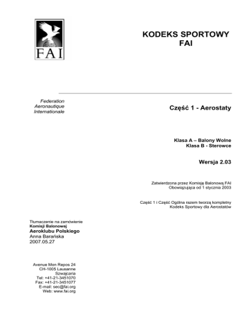 KODEKS SPORTOWY FAI Federation Aeronautique Internationale Część 1 - Aerostaty Klasa A – Balony Wolne Klasa B - Sterowce Wersja 2.03 Zatwierdzona przez Komisję Balonową FAI Obowiązująca od 1 stycznia 2003 Część 1 i Część Ogólna razem tworzą kompletny Kodeks Sportowy dla Aerostatów Tłumaczenie na zamówienie Komisji Balonowej Aeroklubu Polskiego Anna Barańska 2007.05.27 Avenue Mon Repos 24 CH-1005 Lausanne Szwajcaria Tel: +41-21-3451070 Fax: +41-21-3451077 E-mail: [email protected] Web: www.fai.org Kodeks Sportowy FAI Część 1 – Aerostaty FEDERATION AERONAUTIQUE INTERNATIONALE Avenue Mon Repos 24, CH-1005 Lausanne – Szwajcaria Prawa autorskie 2003 Wszelkie prawa zastrzeżone. Prawa autorskie do tego dokumentu należą do Międzynarodowej Federacji Lotniczej (Fédération Aéronautique Internationale - FAI). Każda osoba działająca w imieniu FAI lub jeden z jej Członków jest niniejszym upoważniony do kopiowana, drukowania oraz dystrybucji tego dokumentu przy uwzględnieniu następujących warunków: 1. Dokument ten służy jedynie celom informacyjnym i nie może być wykorzystywany w celach komercyjnych. 2. Wszystkie kopie tego dokumentu bądź jego części muszą zawierać informację o prawach autorskich. Jednocześnie informuje się, że wszelaki produkt, proces oraz technologia opisana w tym dokumencie może być również przedmiotem innych praw Własności Intelektualnej, zastrzeżonych przez Międzynarodową Federację Lotniczą bądź inny podmiot, nie uregulowanych bezpośrednio w niniejszym dokumencie. Wersja 2.03 1 stycznia 2003 Strona ii Kodeks Sportowy FAI Część 1 – Aerostaty PRAWA DO MIĘDZYNARODOWYCH ZAWODÓW SPORTOWYCH FAI Wszelkie międzynarodowe zawody sportowe organizowane w całości lub w części na podstawie przepisów Kodeksu i ii Sportowego Międzynarodowej Federacji Lotniczej (FAI) zwane są Międzynarodowymi Zawodami Sportowymi FAI . Na iii podstawie Statutu FAI, FAI posiada i kontroluje wszelkie prawa związane z Międzynarodowymi Zawodami Sportowymi iv v FAI. Członkowie FAI będą wdrażać na swoich terytoriach krajowych własność FAI do Międzynarodowych Zawodów vi Sportowych FAI i wymagać, aby były one zarejestrowane w Kalendarzu Sportowym FAI. Pozwolenie i upoważnienie do wykorzystywania wszelkich praw do jakichkolwiek działań komercyjnych na takich imprezach, w tym, lecz nie wyłącznie, do reklamowania się na takich imprezach lub reklamowania samych imprez, wykorzystania nazwy imprezy lub logo dla celów handlowych i wykorzystania wszelkich dźwięków i/lub obrazów, czy to zapisywanych w formie elektronicznej lub w inny sposób lub transmitowanych w czasie rzeczywistym, odbywać się musi za uprzednią zgodą FAI. Dotyczy to w szczególności wszelkich praw do wykorzystania wszelkich materiałów, w formie elektronicznej lub innej, które stanowią część jakiejkolwiek metody lub systemu oceniania, przyznawania punktów, oceny vii występów lub informacji wykorzystywanych na Międzynarodowych Zawodach Sportowych FAI . viii Każda Komisja Sportów Powietrznych FAI upoważniona jest do negocjacji, odpowiednio z Członkami FAI lub innymi jednostkami, uprzednich umów w imieniu FAI do transferu całości lub części praw do wszelkich Międzynarodowych Zawodów Sportowych FAI (poza imprezą Światowe Igrzyska Powietrzneix), które są organizowane w całości lub w części na podstawie rozdziału Kodeksu Sportowegox, za które odpowiedzialna jest ta Komisjaxi. Wszelki taki transfer praw odbywać się będzie na podstawie „Umowy z Organizatorem”xii jak wskazano w bieżącym Regulaminie FAI Rozdział 1, ustęp 1.2 „Zasady Transferu Praw do Międzynarodowych Zawodów Sportowych FAI”. Każda osoba fizyczna lub prawna przyjmująca na siebie obowiązek organizacji Zawodów Sportowych FAI, czy to na podstawie umowy pisemnej lub innej, robiąc to akceptuje jednocześnie prawa własności FAI wyszczególnione powyżej. Jeśli nie miało miejsca formalne przekazanie praw, FAI zatrzymuje wszelkie prawa do danej imprezy. Niezależnie od jakiejkolwiek umowy lub przekazania praw, FAI będzie miało, bezpłatnie dla własnych celów archiwalnych lub promocyjnych, pełen dostęp do wszelkich nagrań dźwiękowych i/lub obrazów wizualnych z wszelkich Zawodów Sportowych FAI i zawsze zastrzega sobie prawo do rejestracji, filmowania i/lub fotografowania całości lub części wszelkich imprez dla takich celów, bez żadnych opłat. i ii iii iv v vi vii viii ix x xi xii Statuty FAI, Rozdział 1, paragraf 1.6 Kodeks Sportowy FAI, Część Ogólna, Rozdział 3, paragraf 3.1.3. Statuty FAI, Rozdział 1, paragraf 1.8.1 Statuty FAI, Rozdział 5, paragraf 5.1.1.2; 5.5; 5.6 oraz 5.6.1.6 Rozporządzenia FAI, Rozdział 1, paragraf 1.2.1 Kodeks Sportowy FAI, Część Ogólna, Rozdział 3, paragraf 3.1.3. Rozporządzenia FAI, Rozdział 1, paragraf 1.2.3 Statuty FAI, Rozdział 5, paragraf 5.1.1.2; 5.5; 5.6, 5.6.1.6 Kodeks Sportowy FAI, Część Ogólna, Rozdział 3, paragraf 3.1.7 Kodeks Sportowy FAI, Część Ogólna, Rozdział 1, paragraf 1.2. oraz 1.4 Kodeks Sportowy FAI, Część Ogólna, Rozdział 3 paragraf 3.1.3. Rozporządzenia FAI, Rozdział 1, paragraf 1.2.2 Wersja 2.03 1 stycznia 2003 Strona iii Kodeks Sportowy FAI Część 1 – Aerostaty POPRAWKI I. WŁADZE Kodeks Sportowy CZĘŚĆ l - AEROSTATY może ulegać zmianom przez zalecenia GŁÓWNEJ KOMISJI SPORTOWEJ FAI (ex CASI) lub przez KOMISJĘ BALONOWĄ FAI (CIA) (Część Główna 10.1). II. DATA WEJŚCIA W ŻYCIE Poprawki do Kodeksu Sportowego CZĘŚĆ 1 wchodzą w życie z dniem 1 stycznia. Międzynarodowa Komisja Balonowa (CIA) jest upoważniona do zatwierdzania i natychmiastowego wprowadzania poprawek proponowanych ze względów bezpieczeństwa (Część Ogólna 10.2.). III. PUBLIKACJA a. KODEKS SPORTOWY Kodeks Sportowy CZĘŚĆ 1 - AEROSTATY będzie publikowany przez Sekretariat FAI i może być przedrukowywany co pięć lat (Cz. O. 10.5) zgodnie z następujący