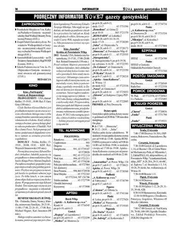 14 INFORMATOR NOWA gazeta gostyñska 2/10 PODRÊCZNY INFORMATOR NOWEJ gazety gostyñskiej ZAPROSZENIA w Przedszkole Miejskie nr 5 im. Kubusia Puchatka w Gostyniu na przedszkolny fina³ Wielkiej Orkiestry wi¹tecznej Pomocy (8.01.); w Zespó³ Szkó³ Zawodowych im. Powstañców Wielkopolskich w Gostyniu na uroczystoæ z okazji 91. rocznicy wybuchu Powstania Wielkopolskiego (8.01.); w Automobilklub Leszczyñski na IX wiatowy Samochodowy Rajd WOP (Leszno, 10.01.); w Szko³a Podstawowa nr 5 im. ks. Fr. Olejniczaka w Gostyniu na uroczystoæ otwarcia sali gimnastycznej (15.01.). REDAKCJA KINO Kino Pod Kopu³¹ Gostyñ, ul. Bojanowskiego PRAWO ZEMSTY USA, dramat/ thriller, 15-19.01., 18:00. Re¿. F. Gary Gray (108 min.). Clyde Shelton (Gerard Butler) jest przyk³adnym mê¿em i ojcem oraz uczciwym cz³owiekiem, którego ¿ona i córka zostaj¹ brutalnie zamordowane podczas w³amania do ich domu. Kiedy zabójcy zostaj¹ schwytani, sprawê dostaje g³odny sukcesu prokurator z Filadelfii, Nick Rice (Jamie Foxx). Nick proponuje jednemu z podejrzanych z³agodzenie wyroku w zamian za zeznania przeciwko wspólnikowi. DOM Z£Y Polska, thriller, 1519.01., 20:00, 18.01. KDF. Re¿. Wojciech Smarzowski (105 min.). Pewnej deszczowej nocy Edward rodoñ (Arkadiusz Jakubik) pojawia siê przypadkowo w domu ma³¿eñstwa Dziabasów (Kinga Preis i Marian Dziêdziel). Pocz¹tkowa nieufnoæ gospodarzy ustêpuje miejsca tradycyjnej polskiej gocinnoci. Przybysz nie przypuszcza nawet, jak bardzo to spotkanie odmieni jego ¿ycie. Po kilku latach, w tym samym domu ekipa ledcza rozpoczyna dochodzenie. W progu ponownie staje Edward rodoñ. Tym razem jego wizyta nie jest przypadkowa ma pomóc w rekonstrukcji tajemniczych zdarzeñ sprzed czterech lat. RENIFER NIKO RATUJE WIÊTA Finlandia, Dania, Niemcy, Irlandia, animowany/familijny, 20-21.01., 11:00 i 17:00, 22-26. 01., 17:00. Re¿. Michael Hegner, Kari Juusonen (80 min.). Ma³ego renifera samotnie wychowa³a mama, poniewa¿ jego tata jest cz³on- kiem legendarnej Powietrznej Eskadry wiêtego Miko³aja. Niko nigdy nie spotka³ taty, ale bardzo go podziwia i chcia³by w przysz³oci byæ taki jak on. Kiedy stado g³odnych wilków, któremu przewodzi Czarny Wilk, napada na renifery, Niko postanawia zwróciæ siê o pomoc do taty. Kino Szarotka Krobia, ul. Powstañców Wlkp. 2012 Kanada, USA, fantastyczny/katastroficzny, 15-17.01., 17:00 i 20:00. Re¿. Roland Emmerich (158 min.). Przed wiekami Majowie pozostawili ludzkoci kalendarz, który dok³adnie wskazywa³ datê koñca wiata i mówi³ o zjawiskach, które mia³y mu towarzyszyæ. Od tamtego czasu astrologowie odkryli staro¿ytne teorie, numerolodzy wzory, które je potwierdzaj¹, a geolodzy stwierdzili, ¿e Ziemia od dawna jest skazana na taki scenariusz. Nawet rz¹dowi naukowcy nie mog¹ zaprzeczyæ faktom w 2012 roku Ziemiê czekaj¹ kataklizmy o niebywa³ej skali. Przepowiednia, której pocz¹tek dali Majowie zosta³a dobrze udokumentowana, przedyskutowana, roz³o¿ona na czynniki i sprawdzona. W 2012 roku nast¹pi¹ zjawiska, o których dobrze wiedzielimy bylimy przecie¿ ostrzegani przed tysi¹cami lat. TEL. ALARMOWE POGOTOWIA Ratunkowe. . . . . . . . .999, 65 5720471 Ciep³ownicze . . . . . . . . . . . . . . 993 Drogowe . . . . . . . . . . . . . . . . 981 Energetyczne. . . . . . . 991, 65 5739187 65 5720026 Gazowe. . . . . . . . . . 992, 65 5721218 Wod.-kan.. . . . . . . . . .994, 65 5721211 Policja. . . . . . . . . . .997, 65 5758200 Policyjny telefon zaufania. . . 65 5727864 Tel. alarmowy . . . . . . . . . . . . . .112 Stra¿ Po¿arna. . . . . . . . 998, 065 5729530 Stra¿ Miejska . . . . . . . . 65 5752163 65 5752164, 507 154 706 Telefon zaufania . . . . . 65 5727799 Orodek Interwencji Kryzysowej . . . . . . . 65 573900 pn-pt 8-20, sob 9-13, niedz. 13-17 . . . . . . . 65 5751594 Remedium, ul. Górna 22 pn-pt 10-18 . . . . . . . 065 5721370 ROM-FARM, ul. £okietka 2 pn-pt 9-20, sob 9-14 i 16-19, niedz. 17-19. . . . . . . . . . 65 5720289 Salus, ul. Olejniczaka 7a pn-pt 8-20, sob 8-13 . . . .65 5720173 S³oneczna, ul. Powstañców Wlkp. 45 pn-pt 8-19, sob 8-13 . . . . 65 5725555 Starogostyñska, ul. Starogostyñska 9, pn-pt 8-19:30, ost. sob mies. 8-14:30 . . 65 5722393 w. £ukasza, ul. Graniczna 6e pn-pt 8-20, sob 8-14 . . . . 65 5723350 W Rynku, Rynek 18 pn-pt 9-17, sob 9-13 . . . . 65 5720218 Apteka Anna Kalisoras, ul. Witosa 13 pn-niedz. 8-22 . . . . . . .65 5723334 Nasza, ul. Graniczna 4 pn-pt 8-20, sob 8-14 . . . 65 5725053 Zdrowie, ul. Kolejowa 12 (przy PEPCO) pn-pt 8-20, sob 9-14 . . . 65 5722005 PROMED, ul. Przy Dworcu 4a Dy¿ury aptek Gostyñskie apteki pe³ni¹ dy¿ury nocne w godzinach od 20:00 do 7:00 rano dnia nastêpnego. Oto plan: w do 17.01. S³oneczna, w 18.12.24.01. Salus. Medica pe³ni dy¿ur ca³odobowo. W niedziele i wiêta apteka dy¿urna czynna jest od 9:00 do 13:00. Apteka ROMFARM czynna jest w soboty od 9:00 do 14:00 i od 16:00 do 19:00, w niedziele i wiêta od 17:00 do 19:00. Apteka Anna Kalisoras czynna jest od poniedzia³ku do niedzieli od 8:00 do 22:00. Krobia Amaranthus, ul. Powst. Wlkp. 134 pn-pt 9-17, sob 9-13 . . . 65 5738621 Apteka, ul. Powst. Wlkp. 28 pn-pt 9-18, sob 9-12 . . . . 65 5738568 Pudliszki A. Kalisoras sp. z o.o. ul. Fabryczna 2 . . . . . . 65 5738799 pn-pt 9-17, sob 9-13 Pêpowo Calamus, ul. Or³onia 1a pn-pt 8-18, sob 9-13 . . . . 65 5741166 APTEKI Piaski Borek Wlkp. ul. Lena, pn-pt 8-18. . . . . 65 5727626 Apteki A. Kalisoras sp. z o.o. Medica, ul. Warszawska Rynek 14 . . . . . . . . . . .65 5716545 pn-pt 8-19, sob 9-12 . . . . 65 5719105 pn-pt 8-19, sob 8-13 Pogorzela Gostyñ w. Ducha, Rynek 6 Hygieja, ul. £¹cznikowa 1 pn-pt 8-18, sob 8-12 . . .65 5734850 pn-pt 8-20, sob 8-13 . . . 65 5723299 w. Jadwigi, ul. Kotkowiaka 5 Medica, ul. Mostowa 2a pn-pt 8-16, sob 8-12 . . . . 65 5734734 Poniec A. Kalisoras sp. z o.o. ul. Dworcowa 2b . . . . . . 65 5731534 pn-pt 8:30-18, sob 8:30-13 Milenijna, ul. Kocielna 3 pn-pt 9-18:30, sob 9-16, niedz. 10-14 . . . . . . . . 65 572