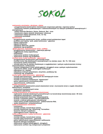 malowanie emulsyjne, akrylowe, olejne - przygotowanie powierzchni malowanych (reperacje pęknięć, naprawa tynku) - malowanie farbami podkładowymi i nawierzchniowymi na róŜnych podłoŜach wewnętrznych i zewnętrznych - palety kolorów Beckers, Dulux, Dekoral, Ral - inne - malowanie olejne stolarki drzwiowej i okiennej - malowanie olejne balustrad, krat, rur itp. - malowanie posadzek tapetowanie - przygotowanie powierzchni ścian, sufitów przed połoŜeniem tapet - podłoŜe pod tapety: tynk, płyta kartonowo - gipsowa - tapety papierowe - tapety winylowe - układanie dekorów, pasów - układanie wg projektów gładź gipsowa, szpachlowanie ścian, sufitów - przygotowanie powierzchni - reperacja pęknięć - wygładzanie masą szpachlową - szlifowanie - wykonanie tynków tradycyjnych - wykonanie tynków wg projektów montaŜ ścian z płyt kartonowo - gipsowych - przygotowanie powierzchni pod montaŜ ścian - montaŜ ścian k/g działowych wewnętrznych na stelaŜu (szer. 50, 75, 100 mm) - wyciszenie wełną mineralną - montaŜ płyt k/g na stelaŜu metalowym z wygładzaniem i pełnym wykończeniem ściany (szpachlowanie, szlifowanie) - montaŜ nietypowych ścian półokrągłych i okrągłych wraz z pełnym wykończeniem - wykonanie półek, wnęk, podciągów sufitowych - zabudowa rur, stelaŜy - zabudowy wolnych przestrzeni, strychów, poddaszy itp - realizacja wg. projektów suche tynki z płyt kartonowo - gipsowych - montaŜ płyt kartonowo - gipsowych do istniejących ścian - montaŜ za pomocą kleju - montaŜ za pomocą metalowych "dystansów" - pełne wykończenie montowanej płyty - szpachlowanie, szlifowanie ściany murowanie - przygotowanie powierzchni przed stawianiem ścian -murowanie ścian z cegieł, bloczków betonowych, pustaków - tynkowanie postawionych ścian - nietypowe zabudowy ściany przeszklone na konstrukcji aluminiowej - wykonanie ścianek działowych przeszklonych na konstrukcji aluminiowej (szer. 50 mm) - zabudowa wewnętrzna i zewnętrzna - podział przestrzeni biurowej i ekspozycyjnej - ścianki z drzwiami jedno- i dwuskrzydłowymi - ścianki o dobrej izolacyjności akustycznej - róŜne kolory profili aluminiowych - paleta kolorów RAL - szyby bezpieczne i antywłamaniowe sufity podwieszane mineralne - trasowanie - montaŜ stelaŜa, konstrukcji nośnej - montaŜ kasetonów typ. Amstrong, Termathex - łączenie róŜnych wysokości - zaokrąglenia ścian, filarów itp. sufity podwieszane z płyty kartonowo - gipsowej - trasowanie - montaŜ stelaŜa, konstrukcji nośnej - montaŜ płyty kartonowo - gipsowej - pełne wykończenie szpachlowanie, szlifowanie - łączenie róŜnych wysokości - wykonanie sufitów półokrągłych, okrągłych - wykonanie sufitów wg nietypowych projektów układanie glazury, terakoty - przygotowanie powierzchni - układanie wewnętrzne, zewnętrzne - układanie wg projektów - docinanie krawędzi płytek (maszynowo i ręcznie) - wstawianie dekorów, pasków, ornamentów - obudowa wanien, brodzików, podestów, stopni - układanie terazkoty na stopniach schodowych, tarasach itp. instalacje hydrauliczne - przerobienie / wykonanie nowych punktów ciepłej i zimnej wody wraz z odpływami - przerobienie / wykonanie nowych podejść kanalizacyjnych - montaŜ ceramiki łazienkowej - wanien, umywalek, zlewozmywaków, brodzików, bidetów, kabin prysznicowych, tradycyjnych i panelowych - montaŜ stelaŜy ściennych do compactów (misek ustępowych) - montaŜ baterii ściennych, sztorcowych - przerobienie / wymiana instalacji centralnego ogrzewania - wymiana grzejników ściennych - wykonanie ogrzewania podłogowego - przerobienie / wykonanie nowej instalacji gazowej stolarka drzwiowa - demontaŜ istniejących ościeŜnic drzwiowych - montaŜ nowych ościeŜnic drzwiowych w istniejące ściany murowane i kartonowo - gipsowe - montaŜ nowych ościeŜnic drzwiowych w nowo stawiane ściany murowane i kartonowo - gipsowe - montaŜ drzwi podwójnych - obróbka glifów drzwiowych - montaŜ progów drzwiowych stolarka okienna - demontaŜ stolarki okiennej, róŜne typy - wykonanie na zamówienie okien PCV typ REHAU - montaŜ stolarki okiennej, róŜne typy - wykończenie ścian, glifów okiennych po wykonaniu wymiany - wykonanie parapetów okiennych z PCV - wymiana parapetów okiennych, róŜne typy szlichty podłogowe, samopoziomujące - przygotowanie powierzchni - gruntowanie powierzchni - wykonanie izolacji poziomej - wykonanie szlichty podłogowej wraz z ociepleniem stropów - wykonanie korekty poziomów masą samopoziomującą - nadlewanie poziomów masą samopoziomującą układanie podłóg, cyklinowanie i lakierowanie - przygotowanie powierzchni - układanie mozaiki róŜne wzory i wielkości - układanie parkietu, róŜne wzory i wielkości - montaŜ listew przypodłogowych - montaŜ listew progowych - cyklinowanie podłóg - lakierowanie - układanie paneli podłogowych - montaŜ listew panelowych układanie wykładzin dywanowych - demontaŜ istniejących wykładzin - przygotowanie powierzchni do połoŜenia wykładzin - układanie wykładzin w rolkach - układanie wykładzin w płytkach - układanie nietypowych wzorów - montaŜ cokołów przypodłogowych dywanowych - montaŜ cokołów obszywanych - pranie i czyszczenie wykładzin - atesty dla biur ocieplanie poddaszy - motaŜ folii wiatro- i paroizolacyjnej - motaŜ wełny mineralnej projektowanie wnętrz - wykonanie projektów architektonicznych - projekty wnętrz mieszkaniowych, biurowych, sklepowych malowanie elewacji - ustawianie rusztowań - reperacja tynku - malowanie ścian farbami fasadowymi, akrylowymi i silikatowymi ocieplenie ścian zewnętrznych - przygotowanie powierzchni - montaŜ styropianu - montaŜ listwy startowej - montaŜ siatki - wykonanie faktury elewacyjnej, róŜne wzory układanie klinkieru - przygotowanie powierzchni - układanie płytek klinkierowych, róŜne wzory - układanie cegieł klinkierowych - obkładanie stopnic i podstopnic schodowych m