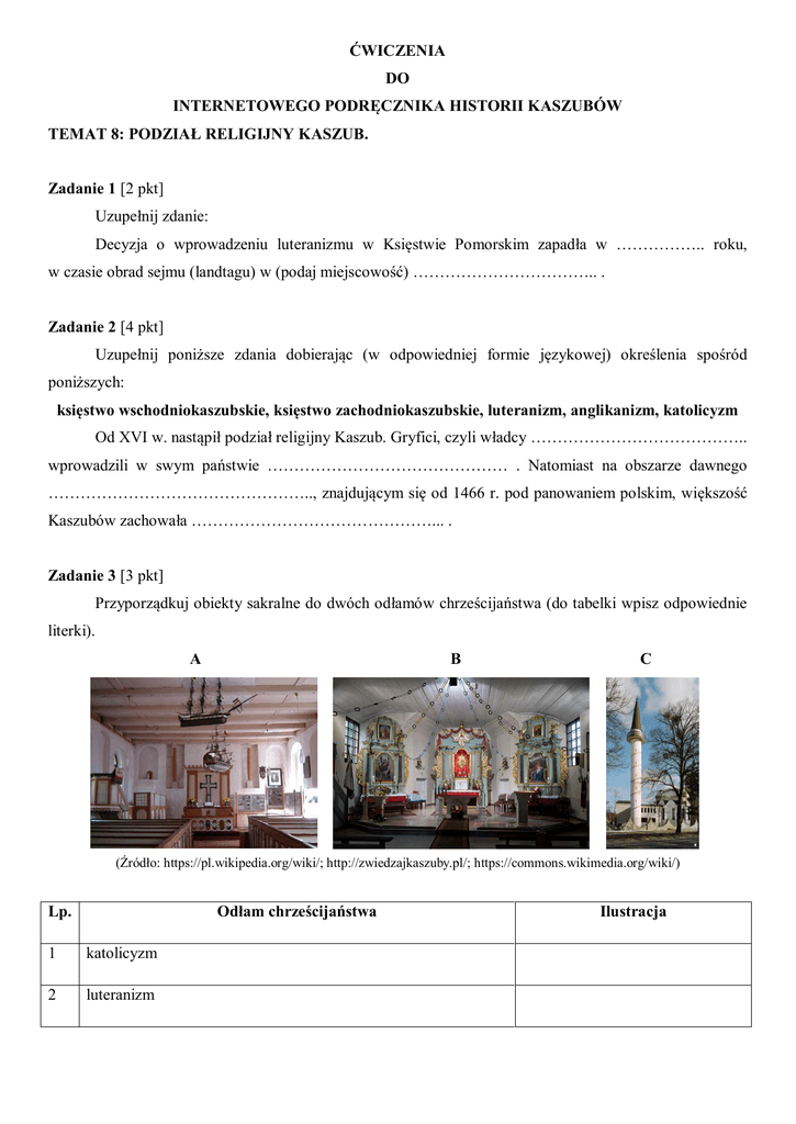 ĆWICZENIA DO INTERNETOWEGO PODRĘCZNIKA HISTORII KASZUBÓW TEMAT 8: PODZIAŁ RELIGIJNY KASZUB. Zadanie 1 [2 pkt] Uzupełnij zdanie: Decyzja o wprowadzeniu luteranizmu w Księstwie Pomorskim zapadła w …………….. roku, w czasie obrad sejmu (landtagu) w (podaj miejscowość) …………………………….. . Zadanie 2 [4 pkt] Uzupełnij poniższe zdania dobierając (w odpowiedniej formie językowej) określenia spośród poniższych: księstwo wschodniokaszubskie, księstwo zachodniokaszubskie, luteranizm, anglikanizm, katolicyzm Od XVI w. nastąpił podział religijny Kaszub. Gryfici, czyli władcy ………………………………….. wprowadzili w swym państwie ……………………………………… . Natomiast na obszarze dawnego ………………………………………….., znajdującym się od 1466 r. pod panowaniem polskim, większość Kaszubów zachowała ………………………………………... . Zadanie 3 [3 pkt] Przyporządkuj obiekty sakralne do dwóch odłamów chrześcijaństwa (do tabelki wpisz odpowiednie literki). A B C (Źródło: https://pl.wikipedia.org/wiki/; http://zwiedzajkaszuby.pl/; https://commons.wikimedia.org/wiki/) Odłam chrześcijaństwa Lp. 1 katolicyzm 2 luteranizm Ilustracja Materiał źródłowy do zadań 4 i 5: Źródło A. Wprowadzenie reformacji w księstwie zachodniokaszubskim. Na (…) sejmie Rzeszy w Wormacji [w 1521 r. – D.Sz.] wyklęto naukę doktora Marcina Lutra i księgi jego spalono, cesarz zaś rozkazał, iżby wszędy przestrzegano starych obyczajów Kościoła rzymskiego. To też książę (….), wróciwszy do domu, edykt ten kazał ogłosić stanom, które się nie sprzeciwiły. Wnet jednakowoż (…) znalazło się wielu, którzy naukę jego przyjęli oraz jej bronili. (…) Atoli książę (…) zostawił to w spokoju i nieszczególne w tej sprawie podejmował wysiłki. Byli (…) pośród jego radców (…) uczeni, którzy sprzyjając ewangelii, nie dopuścili, żeby kaznodziejom stało się coś złego. Tak tedy w Szczecinie postawiła ewangelia pierwszy krok na ziemi pomorskiej i z czasem rozeszła się stąd do Strzałowa, Słupska, Kołobrzegu, Trzebiatowa nad Regą i kilku innych miast. (…) Gdy rządy objęli jego synowie, książę Jerzy oraz książę Barnim (…) nastąpił sejm zapowiedziany (…). Książęta przedstawili tam stanom swój zamiar co do ewangelii. (…) Przystali tedy wszyscy wespół na to, by w całym kraju ewangelię świętą głoszono jasno i bez przeszkód oraz wszelki usunięto papizm i obrządki będące wbrew Bogu. (T. Kantzow, Pomerania. Kronika pomorska z XVI wieku, t. 2, tłum. K. Gołda, Szczecin 2005, s. 146-148, 157, 207) Źródło B. Fragment drzewa genealogicznego Gryfitów. (Na podstawie: G. Labuda, Historia Kaszubów w dziejach Pomorza, t. 1: Czasy średniowieczne, Gdańsk 2006, s. 106-107; E. Rymar, Rodowód książąt pomorskich, Szczecin 2005, tab. X, XII) Zadanie 4 [3 pkt] A. Wykorzystując źródło B podaj imię księcia, który był ojcem wspomnianych w źródle A książąt: Jerzego i Barnima. Imię księcia - …………………………………………………. B. Wyjaśnij, czy ów książę był władcą tolerancyjnym. ………………………………………………………………………………………………………………….. ………………………………………………………………………………………………………………….. ………………………………………………………………………………………………………………….. C. Odwołując się także do wiedzy pozaźródłowej wyjaśnij, czy idee głoszone przez Marcina Lutra szybko znalazły zwolenników w księstwie zachodniokaszubskim. ………………………………………………………………………………………………………………….. ………………………………………………………………………………………………………………….. Zadanie 5 [1 pkt] Wyjaśnij, odwołując się wyłącznie do materiału źródłowego, kto szybciej przyjmował luteranizm: mieszczanie czy chłopi? ………………………………………………………………………………………………………………….. ………………………………………………………………………………………………………………….. Materiał źródłowy do zadań 6 i 7: Początki piśmiennictwa kaszubskiego wiążą się ściśle z reformacją. (…) Zgodnie z zasadami nowego Kościoła nabożeństwa miały być odprawiane w języku ojczystym wiernych, a więc również po kaszubsku. (…) W nabożeństwach ewangelickich pieśń kościelna zajmowała od samego początku szczególnie ważne miejsce, toteż nic dziwnego, że najpierw wydano drukiem śpiewnik. (…) W przedmowie do zbioru pieśni Krofeya autor wyraził nadzieję, że więcej książek zostanie przetłumaczone na język „slawięsky”; na ziemi bytowskiej i lęborskiej nie doszło jednak do tego, ponieważ w roku 1637, wobec wymarcia rodu zachodniopomorskich Gryfitów, Polska wcieliła te ziemie jako wygasłe lenno do swego obszaru państwowego i przez dwadzieścia lat zarządzała nimi bezpośrednio. W tym okresie kontrreformacja prowadziła skutecznie swą działalność, częściowo restytuując katolicyzm, a wraz z nim polski język kościelny. Punkt ciężkości piśmiennictwa kaszubskiego, związanego ściśle z protestantyzmem, przesunął się zatem na północny zachód, do ziemi słupskiej, a ściślej – do (…) Smołdzina. (…) Od połowy XVIII wieku liczba ewangelików kaszubskich zaczęła się szybko zmniejszać, co spowodowało osłabienie zainteresowania pastorów działalnością przekładową. (Źródło: F. Neureiter, Historia literatury kaszubskiej. Próba zarysu, przeł. M. Boduszyńska-Borowikowa, wstęp T. Bolduan, Gdańsk 1982, s. 23, 25