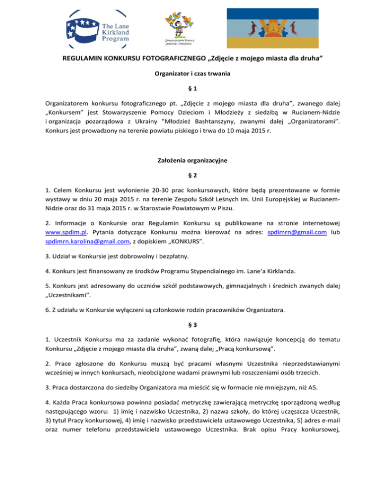 REGULAMIN KONKURSU FOTOGRAFICZNEGO „Zdjęcie z mojego miasta dla druha” Organizator i czas trwania §1 Organizatorem konkursu fotograficznego pt. „Zdjęcie z mojego miasta dla druha”, zwanego dalej „Konkursem” jest Stowarzyszenie Pomocy Dzieciom i Młodzieży z siedzibą w Rucianem-Nidzie i organizacja pozarządowa z Ukrainy "Młodzież Bashtanszyny, zwanymi dalej „Organizatorami”. Konkurs jest prowadzony na terenie powiatu piskiego i trwa do 10 maja 2015 r. Założenia organizacyjne §2 1. Celem Konkursu jest wyłonienie 20-30 prac konkursowych, które będą prezentowane w formie wystawy w dniu 20 maja 2015 r. na terenie Zespołu Szkół Leśnych im. Unii Europejskiej w RucianemNidzie oraz do 31 maja 2015 r. w Starostwie Powiatowym w Piszu. 2. Informacje o Konkursie oraz Regulamin Konkursu są publikowane na stronie internetowej www.spdim.pl. Pytania dotyczące Konkursu można kierować na adres: [email protected] lub [email protected], z dopiskiem „KONKURS”. 3. Udział w Konkursie jest dobrowolny i bezpłatny. 4. Konkurs jest finansowany ze środków Programu Stypendialnego im. Lane‘a Kirklanda. 5. Konkurs jest adresowany do uczniów szkół podstawowych, gimnazjalnych i średnich zwanych dalej „Uczestnikami”. 6. Z udziału w Konkursie wyłączeni są członkowie rodzin pracowników Organizatora. §3 1. Uczestnik Konkursu ma za zadanie wykonać fotografię, która nawiązuje koncepcją do tematu Konkursu „Zdjęcie z mojego miasta dla druha”, zwaną dalej „Pracą konkursową”. 2. Prace zgłoszone do Konkursu muszą być pracami własnymi Uczestnika nieprzedstawianymi wcześniej w innych konkursach, nieobciążone wadami prawnymi lub roszczeniami osób trzecich. 3. Praca dostarczona do siedziby Organizatora ma mieścić się w formacie nie mniejszym, niż A5. 4. Każda Praca konkursowa powinna posiadać metryczkę zawierającą metryczkę sporządzoną według następującego wzoru: 1) imię i nazwisko Uczestnika, 2) nazwa szkoły, do której uczęszcza Uczestnik, 3) tytuł Pracy konkursowej, 4) imię i nazwisko przedstawiciela ustawowego Uczestnika, 5) adres e-mail oraz numer telefonu przedstawiciela ustawowego Uczestnika. Brak opisu Pracy konkursowej, zgodnego z metryczką, albo jakiegokolwiek jej punktu skutkuje możliwością odrzucenia Pracy konkursowej z Konkursu. §4 1. Zgłoszenia do Konkursu dokonuje przedstawiciel ustawowy Uczestnika Konkursu. Do Konkursu można zgłosić tylko jedną Pracę konkursową Uczestnika. 2. Zgłoszenie należy doręczyć na adres: Stowarzyszenie Pomocy Dzieciom i Młodzieży, 12-220 Ruciane Nida, ul. Kolejowa 2 B z dopiskiem „KONKURS”. 3. Zgłoszenia, które nie będą dokonane osobiście muszą być zabezpieczone w taki sposób, aby Praca konkursowa nie uległa zniszczeniu. 4. Zgłoszona Praca konkursowa nie podlega zwrotowi. 5. Zgłoszenie do Konkursu jest równoznaczne z zapoznaniem się i akceptacją Regulaminu Konkursu. Terminarz §5 1. Zgłoszenia do Konkursu będą przyjmowane w terminie od 20 kwietnia 2015 do 10 maja 2015 r. (decyduje data wpływu zgłoszenia do Organizatora). 2. Wyniki Konkursu zostaną opublikowane na stronie internetowej www.spdim.pl najpóźniej w dniu 15 maja 2015 r. Nagrody i wyróżnienia §6 1. Prace konkursowe będą oceniane przez Komisję Konkursową powołaną przez Organizatora Konkursu. 2. Zadaniem Komisji Konkursowej jest ocena Prac konkursowych, wytypowanie Prac konkursowych, o których mowa w § 3 i przyznanie nagród. 3. Komisja Konkursowa wybierze 20-30 Prac konkursowych, które zostaną zaprezentowane w formie wystawy, o której mowa w § 2 ust. 1. 4. Z Prac konkursowych, o których mowa w § 3 Komisja Konkursowa wybierze trzy Prace konkursowe, których autorzy, zwani dalej „Laureatami Konkursu”, otrzymają nagrody rzeczowe. 5. Decyzja Komisji Konkursowej jest ostateczna i nie przysługuje od niej odwołanie. §7 1. Uczestnicy, których Prace konkursowe zostaną zakwalifikowane do wystawy, o której mowa w § 2 ust. 1 zostaną nagrodzeni dyplomami oraz pamiątkowymi upominkami. 2. Nagrody rzeczowe oraz dyplomy i pamiątkowe upominki zostaną wręczone w dniu 18 maja 2015 r. 3. Komisja Konkursowa ma prawo przyznania nagród specjalnych i wyróżnień. Prawa autorskie §8 1. Twórcą Pracy konkursowej jak i jej poszczególnych elementów, w rozumieniu ustawy z dnia 4 lutego 1994 r. o prawie autorskim i prawach pokrewnych (Dz. U. z 2006 r. Nr 90, poz. 631 z późn. zm.) może być tylko Uczestnik. 2. Zgłoszenie do Konkursu jest równoznaczne z nieodpłatnym i nieograniczonym czasowo i terytorialnie upoważnieniem (licencja niewyłączna) Organizatora do wykorzystywania Pracy konkursowej przez publiczną prezentację w formie wystawy plenerowej oraz kopiowanie i wytwarzanie dowolną techniką, w szczególności techniką drukarską, reprograficzną, zapisu magnetycznego, cyfrową, a także wprowadzanie do pamięci komputera lub serwera, a także wprowadzanie i publiczne prezentowanie w sieci Internet. 3. Zgłoszenie do Konkursu jest równoznaczne z nieodpłatnym przeniesieniem na Organizatora własności egzemplarza Pracy konkursowej. Postanowienia końcowe §9 1. Organizator zastrzega sobie prawo do zmiany Regulaminu Konkursu. Informacja o ewentualnych zmianach zostanie zamieszczona na stronie internetowej www.spdim.pl. 2. W sprawach nieuregulowanych w Regulaminie Konkursu decyduje Organizator. Od decyzji Organizatora nie przysługuje odwołanie.