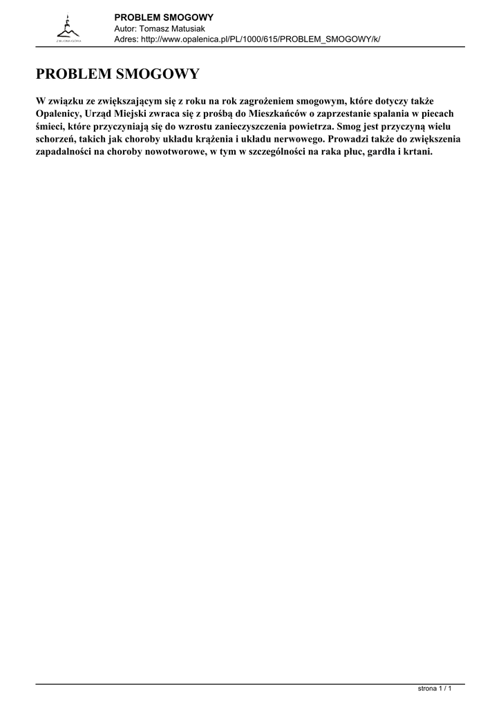 PROBLEM SMOGOWY Autor: Tomasz Matusiak Adres: http://www.opalenica.pl/PL/1000/615/PROBLEM_SMOGOWY/k/ PROBLEM SMOGOWY W związku ze zwiększającym się z roku na rok zagrożeniem smogowym, które dotyczy także Opalenicy, Urząd Miejski zwraca się z prośbą do Mieszkańców o zaprzestanie spalania w piecach śmieci, które przyczyniają się do wzrostu zanieczyszczenia powietrza. Smog jest przyczyną wielu schorzeń, takich jak choroby układu krążenia i układu nerwowego. Prowadzi także do zwiększenia zapadalności na choroby nowotworowe, w tym w szczególności na raka płuc, gardła i krtani. strona 1 / 1 Powered by TCPDF (www.tcpdf.org)
