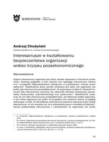 2016 nr 2014 nr 44 (XVII) BEZPIECZEĠSTWO • TEORIA I PRAKTYKA Andrzej Chodyński Krakowska Akademia im. Andrzeja Frycza Modrzewskiego Interesariusze w kształtowaniu bezpieczeństwa organizacji wobec kryzysu pozaekonomicznego Wprowadzenie Pojęcie interesariuszy organizacji jest dosyć szeroko opisywane w literaturze przedmiotu. Ewolucję poglądów w tym zakresie oraz typologię interesariuszy zawiera m.in. monografia Odpowiedzialność ekologiczna w proaktywnym rozwoju przedsiębiorstw1. Współcześnie dosyć szeroko omawiana jest także rola organizacji non profit, jako interesariuszy przedsiębiorstwa2. W wyjściowym modelu R. Edwarda Freemana jako interesariuszy wymienia się: właścicieli, klientów, dostawców, pracowników, konkurentów, rząd-administrację oraz społeczności3. Współcześnie rozpatruje się nie tylko interesariuszy przedsiębiorstwa, ale faktycznie każdej organizacji, w tym także organizacji non profit. W przypadku tych ostatnich istotne są poglądy wskazujące na fakt, że identyfikacja interesariuszy powinna wykraczać poza związki ekonomiczne, co ma znaczenie np. przy wskazywaniu grup o charakterze lokalnym4. Szerzej problematykę interesariuszy, z nastawieniem na organizacje non profit, 1 2 3 4 A. Chodyński, Odpowiedzialność ekologiczna w proaktywnym rozwoju przedsiębiorstw, Kraków 2011. M. Huczek, Organizacja pozarządowa jako ważny interesariusz i partner przedsiębiorstwa, [w:] Biznes odpowiedzialny wobec interesariuszy, red. A. Chodyński, Kraków 2013, s. 33–57. R.E. Freeman, Strategic management: a stakeholder approach, Boston 1984. A. Crane, T. Ruebottom, Stakeholder theory and social identity: rethinking stakeholder identification, „Journal of Business Ethics” 2012, Vol. 102, No. 1, s. 77–87. 41 Andrzej Chodyński zaprezentowała Maria Inha5. Tworzone są także propozycje interesariuszy dla sektora publicznego6. Siła interesariuszy zależy od posiadanych przez nich atrybutów. Przedsiębiorstwa w pierwszej kolejności zaspokajają żądania interesariuszy posiadających wszystkie atrybuty. Są nimi: władza, legitymizacja i pilność. Władza (siła; power) oparta jest na zależności ekonomicznej lub politycznej. Legitymizacja (legitymacy), opiera się o system norm, wartości i przekonań. Z kolei pilność (natarczywość; urgency) wiąże się z wymaganym czasem reakcji na roszczenia (żądania) interesariuszy7. Siła interesariuszy może przybierać charakter wymuszający (coercive), normatywny (normative) i oparty o praktyczność (utilitarian)8. Warto zwrócić uwagę, że aspekty pilności, ale również charakteru wymuszającego mogą mieć szczególne znaczenie w kwestiach bezpieczeństwa organizacji i występujących zagrożeń, powodujących kryzys pozaekonomiczny. Dla niektórych organizacji szczególne znaczenia ma kwestia bliskości (głównie geograficznej) interesariuszy. Sytuacja taka będzie mieć miejsce w przypadku różnego typu kataklizmów o lokalnym charakterze, np. w przypadku klęsk żywiołowych, bądź cywilizacyjnych. Wówczas, z punktu widzenia bezpieczeństwa, znaczenie ma rozumienie pojęcia bliskości jako atrybutu interesariusza (proximity)9. W literaturze wyróżnia się bliskości o różnym charakterze: geograficznym, poznawczym, społecznym, czy instytucjonalnym10. Można się także spotkać z podziałem na bliskość geograficzną (odnosi się do przestrzeni geograficznej i wymiaru społecznego), przemysłową (charakteryzuje ją podobieństwo i/lub komplementarność technologiczna), kulturową (związaną z podobieństwem wartości, postaw i norm), organizacyjną (odnosi się do podobieństwa zasad koordynacji działań) i instytucjonalną. W przypadku tej ostatniej uczestnicy wspólnoty wykorzystują te same reguły postępowania. Patrycja Klimas opisuje także pojęcie bliskości relacyjnej poprzez scharakteryzowanie liczby, częstotliwości i jakości występujących relacji11. Dla potrzeb rozważań w niniejszym opracowaniu warto podkreślić znaczenie wspólnoty kulturowej – bezpieczeństwo może być bowiem ważnym elementem kultury organizacyjnej i wyznawanych wartości. Określane są także czynniki charakteryzujące społeczność (community), obejmującą zarówno pojedynczych obywateli, jak i grupy obywateli, reprezentujących określone 5 6 7 8 9 10 11 42 M. Inha, Stakeholder relationships in a non-profit network organization. Case: European Business Ethics Network, University of Tampere, School of Management, 2015, https://tampub.uta.fi/…/ GRADU-1438161442.pdf [dostęp: 28.11.2015]. E.W. Mainarders, H. Alves, M. Raposo, A model for stakeholder classification and stakeholder relationship, „Management Decision” 2012, Vol. 50, No. 10, s. 1861–1879; według tych autorów interesariusze sektora publicznego to regulatorzy, interesariusze zależni, pasywni, partnerzy, kontrolujacy oraz, jakby obok tego podziału, non-stakeholder (bez oddziaływań). R.K. Mitchell, B.R. Agle, D.J. Wood, Toward a theory of stakeholder identification and salience: defining the principle of who and what really counts, „Academy of Management Review” 1997, Vol. 22, No. 4, s. 853–886. A. Etzioni, Modern organizations, Englewood Cliffs 1964. C. Driscoll, M. Starik, The primordial stakeholder: advancing the conceptual consideration of stakeholder status for the natural environment, „Journal of Business Ethics” 2004, Vol. 49, No. 1, s. 55–73. R. Boschma, Proximity and innovation: a critical assessment, „Regional Studies” 2005, Vol. 39, No. 1, s. 61–74. P. Klimas, Wymiary bliskości w sieciach innowacji, „Przegląd Organizacji” 2011, nr 4, s. 16–20. Interesariusze w kształtowaniu bezpieczeństwa organizacji wobec kryzysu pozaekonomicznego interesy, mianowicie: geograficzny, interakcje i tożsamość. O czynniku geograficznym związanym z terytorium dyskutuje się, gdy nie występują interakcje między obywatelami. Interakcje, związane z relacjami społecznymi, mogą