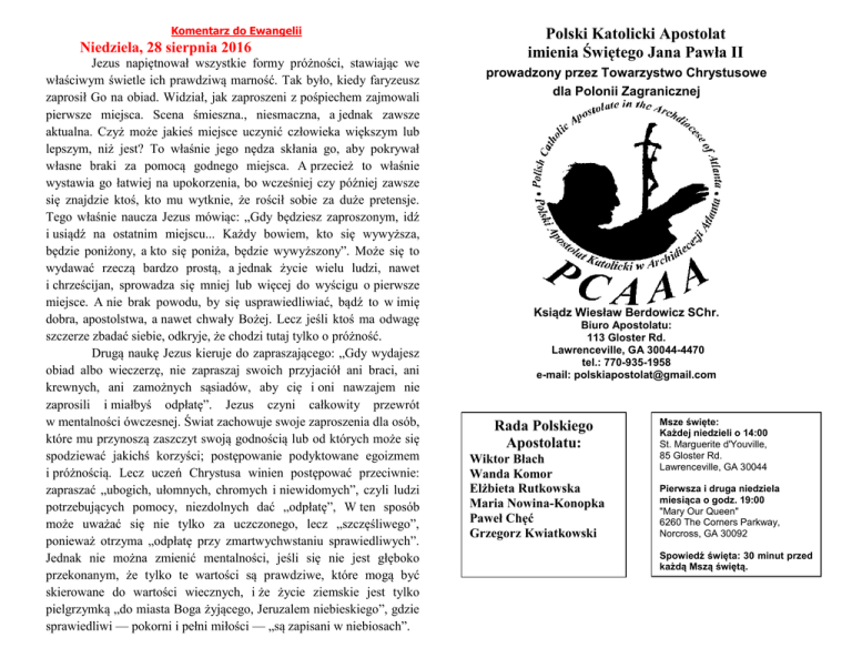 Komentarz do Ewangelii Niedziela, 28 sierpnia 2016 Jezus napiętnował wszystkie formy próżności, stawiając we właściwym świetle ich prawdziwą marność. Tak było, kiedy faryzeusz zaprosił Go na obiad. Widział, jak zaproszeni z pośpiechem zajmowali pierwsze miejsca. Scena śmieszna., niesmaczna, a jednak zawsze aktualna. Czyż może jakieś miejsce uczynić człowieka większym lub lepszym, niż jest? To właśnie jego nędza skłania go, aby pokrywał własne braki za pomocą godnego miejsca. A przecież to właśnie wystawia go łatwiej na upokorzenia, bo wcześniej czy później zawsze się znajdzie ktoś, kto mu wytknie, że rościł sobie za duże pretensje. Tego właśnie naucza Jezus mówiąc: „Gdy będziesz zaproszonym, idź i usiądź na ostatnim miejscu... Każdy bowiem, kto się wywyższa, będzie poniżony, a kto się poniża, będzie wywyższony”. Może się to wydawać rzeczą bardzo prostą, a jednak życie wielu ludzi, nawet i chrześcijan, sprowadza się mniej lub więcej do wyścigu o pierwsze miejsce. A nie brak powodu, by się usprawiedliwiać, bądź to w imię dobra, apostolstwa, a nawet chwały Bożej. Lecz jeśli ktoś ma odwagę szczerze zbadać siebie, odkryje, że chodzi tutaj tylko o próżność. Drugą naukę Jezus kieruje do zapraszającego: „Gdy wydajesz obiad albo wieczerzę, nie zapraszaj swoich przyjaciół ani braci, ani krewnych, ani zamożnych sąsiadów, aby cię i oni nawzajem nie zaprosili i miałbyś odpłatę”. Jezus czyni całkowity przewrót w mentalności ówczesnej. Świat zachowuje swoje zaproszenia dla osób, które mu przynoszą zaszczyt swoją godnością lub od których może się spodziewać jakichś korzyści; postępowanie podyktowane egoizmem i próżnością. Lecz uczeń Chrystusa winien postępować przeciwnie: zapraszać „ubogich, ułomnych, chromych i niewidomych”, czyli ludzi potrzebujących pomocy, niezdolnych dać „odpłatę”, W ten sposób może uważać się nie tylko za uczczonego, lecz „szczęśliwego”, ponieważ otrzyma „odpłatę przy zmartwychwstaniu sprawiedliwych”. Jednak nie można zmienić mentalności, jeśli się nie jest głęboko przekonanym, że tylko te wartości są prawdziwe, które mogą być skierowane do wartości wiecznych, i że życie ziemskie jest tylko pielgrzymką „do miasta Boga żyjącego, Jeruzalem niebieskiego”, gdzie sprawiedliwi — pokorni i pełni miłości — „są zapisani w niebiosach”. Polski Katolicki Apostolat imienia Świętego Jana Pawła II prowadzony przez Towarzystwo Chrystusowe dla Polonii Zagranicznej Ksiądz Wiesław Berdowicz SChr. Biuro Apostolatu: 113 Gloster Rd. Lawrenceville, GA 30044-4470 tel.: 770-935-1958 e-mail: [email protected] Rada Polskiego Apostolatu: Wiktor Błach Wanda Komor Elżbieta Rutkowska Maria Nowina-Konopka Paweł Chęć Grzegorz Kwiatkowski Msze święte: Każdej niedzieli o 14:00 St. Marguerite d'Youville, 85 Gloster Rd. Lawrenceville, GA 30044 Pierwsza i druga niedziela miesiąca o godz. 19:00 "Mary Our Queen" 6260 The Corners Parkway, Norcross, GA 30092 Spowiedź święta: 30 minut przed każdą Mszą świętą. Biuletyn: 28 sierpnia 2016 22 niedziela zwykła Ty, dobry Boże, biednego ochraniasz. Składki 21 sierpnia St Marguerite $719 Potrzebna tygodniowa składka $1500. Serdeczne Bóg zapłać za wsparcie. Wszystkim wypoczywającym, życzę wspaniałych wakacji, a pracującym, spokojnego sierpnia. Wszystkim zaangażowanym we wczorajszy Festiwal Pierogów serdeczne Bóg zapłać. Wygląda na to, że tegoroczny festiwal okazał się sukcesem. To dzięki Waszej ofierze, pracy i poświęceniu Polski Apostolat może istnieć i funkcjonować. *************************************************************************************************************** Intencje Mszalne Niedziela, 28 sierpnia 2016 Md'Y - 2:00pm O Boże błogosławieństwo dla Oskara z okazji urodzin. Niedziela, sierpnia 2016 Md'Y - 2:00pm – Służba liturgiczna OGŁOSZENIA 28 sierpnia 2016 2:00pm St. Marguerite I czytanie Józef Mądrzyk II czytanie Kamil Jezierski Szafarze Józef Mądrzyk Danuta Wróblewska