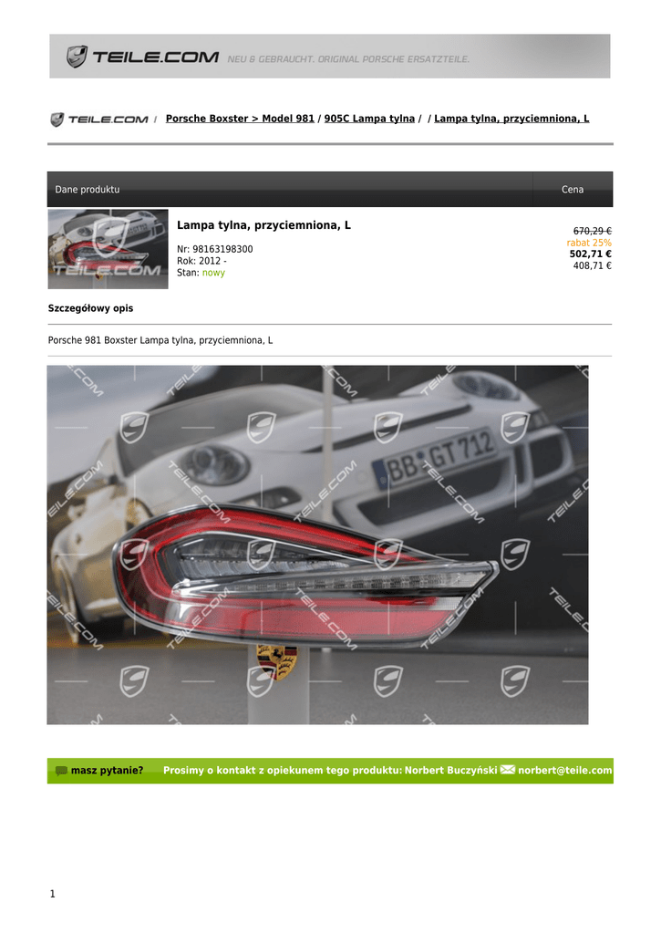 Porsche Boxster > Model 981 / 905C Lampa tylna / / Lampa tylna, przyciemniona, L Dane produktu Cena Lampa tylna, przyciemniona, L Nr: 98163198300 Rok: 2012 Stan: nowy 670,29 € rabat 25% 502,71 € 408,71 € Szczegółowy opis Porsche 981 Boxster Lampa tylna, przyciemniona, L masz pytanie? 1 Prosimy o kontakt z opiekunem tego produktu: Norbert Buczyński [email protected]