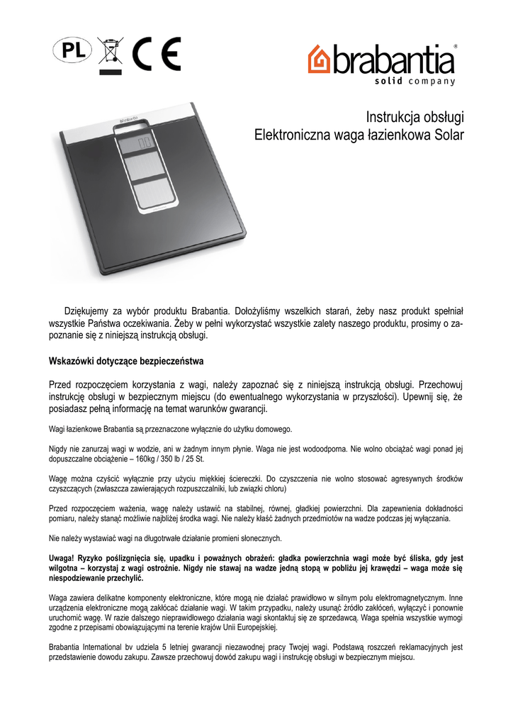Instrukcja obsługi Elektroniczna waga łazienkowa Solar Dziękujemy za wybór produktu Brabantia. Dołożyliśmy wszelkich starań, żeby nasz produkt spełniał wszystkie Państwa oczekiwania. Żeby w pełni wykorzystać wszystkie zalety naszego produktu, prosimy o zapoznanie się z niniejszą instrukcją obsługi. Wskazówki dotyczące bezpieczeństwa Przed rozpoczęciem korzystania z wagi, należy zapoznać się z niniejszą instrukcją obsługi. Przechowuj instrukcję obsługi w bezpiecznym miejscu (do ewentualnego wykorzystania w przyszłości). Upewnij się, że posiadasz pełną informację na temat warunków gwarancji. Wagi łazienkowe Brabantia są przeznaczone wyłącznie do użytku domowego. Nigdy nie zanurzaj wagi w wodzie, ani w żadnym innym płynie. Waga nie jest wodoodporna. Nie wolno obciążać wagi ponad jej dopuszczalne obciążenie – 160kg / 350 lb / 25 St. Wagę można czyścić wyłącznie przy użyciu miękkiej ściereczki. Do czyszczenia nie wolno stosować agresywnych środków czyszczących (zwłaszcza zawierających rozpuszczalniki, lub związki chloru) Przed rozpoczęciem ważenia, wagę należy ustawić na stabilnej, równej, gładkiej powierzchni. Dla zapewnienia dokładności pomiaru, należy stanąć możliwie najbliżej środka wagi. Nie należy kłaść żadnych przedmiotów na wadze podczas jej wyłączania. Nie należy wystawiać wagi na długotrwałe działanie promieni słonecznych. Uwaga! Ryzyko poślizgnięcia się, upadku i poważnych obrażeń: gładka powierzchnia wagi może być śliska, gdy jest wilgotna – korzystaj z wagi ostrożnie. Nigdy nie stawaj na wadze jedną stopą w pobliżu jej krawędzi – waga może się niespodziewanie przechylić. Waga zawiera delikatne komponenty elektroniczne, które mogą nie działać prawidłowo w silnym polu elektromagnetycznym. Inne urządzenia elektroniczne mogą zakłócać działanie wagi. W takim przypadku, należy usunąć źródło zakłóceń, wyłączyć i ponownie uruchomić wagę. W razie dalszego nieprawidłowego działania wagi skontaktuj się ze sprzedawcą. Waga spełnia wszystkie wymogi zgodne z przepisami obowiązującymi na terenie krajów Unii Europejskiej. Brabantia International bv udziela 5 letniej gwarancji niezawodnej pracy Twojej wagi. Podstawą roszczeń reklamacyjnych jest przedstawienie dowodu zakupu. Zawsze przechowuj dowód zakupu wagi i instrukcję obsługi w bezpiecznym miejscu. Instrukcja obsługi wagi Przed pierwszym użyciem 1. ustaw wagę na równej, gładkiej powierzchni (nie na dywanie) 2. waga jest zasilana światłem – migający na wyświetlaczu symbol ☼ oznacza ładowanie akumulatorów wagi. Czas ładowania akumulatorów zależy od natężenia światła 3. jeśli w pomieszczeniu jest niewystarczająca ilość światła, uruchomienie wagi nie będzie możliwe – przenieś wagę w lepiej oświetlone miejsce Pomiar wagi 1. stań na wadze w sposób pokazany na zdjęciu obok, odczytaj wynik pomiaru podany na wyświetlaczu. Po zejściu z wagi, nastąpi jej samoczynne wyłączenie. 2. Jeśli chcesz dokonać ponownego pomiaru, zejdź z wagi i po chwili wejdź na nią ponownie. Komunikaty wyświetlacza wagi ☼ ----- Waga jest gotowa do pracy. Migający symbol ☼ oznacza ładowanie akumulatorów wagi. Zbyt duże obciążenie (ponad 160 kg / 350 lb / 25 st.) Dane techniczne - maksymalne obciążenie 160kg / 350 lb / 25 st. - jednostki pomiaru: kg / lb / St. - dokładność pomiaru -/+ 0,1kg / 0,2 lb / 0,02 st. - zasilanie: wbudowane ogniwa fotowoltaiczne, waga nie wymaga baterii - automatyczny wyłącznik - wybór jednostek pomiaru pomiędzy kg / lb / st.