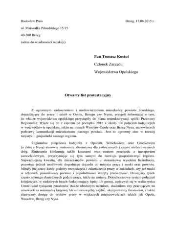 Radosław Preis Brzeg, 17.06.2015 r. ul. Marszałka Piłsudskiego 15/15 49-300 Brzeg (adres do wiadomości redakcji) Pan Tomasz Kostuś Członek Zarządu Województwa Opolskiego Otwarty list protestacyjny Z ogromnym zaskoczeniem i niedowierzaniem mieszkańcy powiatu brzeskiego, dojeżdżający do pracy i szkół w Opolu, Brzegu czy Nysie, przyjęli informację o tym, że władze województwa opolskiego przystąpiły do planu restrukturyzacji spółki Przewozy Regionalne. Wiąże się on z cięciem od początku 2016 r. około 1/4 połączeń kolejowych w województwie opolskim, także na trasach Wrocław-Opole oraz Brzeg-Nysa, stanowiących podstawę komunikacji mieszkańców naszego powiatu. Jest to ogromny cios w rozwój turystyki i gospodarki naszego regionu. Regionalne połączenia kolejowe z Opolem, Wrocławiem oraz Grodkowem (a dalej z Nysą) stanowią znakomitą alternatywę dla zatłoczonych i często niebezpiecznych dróg. Skutecznie konkurują także kosztami oraz czasem przejazdu z transportem samochodowym, przyczyniając się tym samym do rozwoju gospodarczego regionu. Najważniejszą kwestią, dla mieszkańców powiatu o stosunkowo wysokim bezrobociu, pozostaje jednak możliwość dogodnego dojazdu do miejsca pracy i nauki oraz powrotu. Minęły już czasy kiedy godziny rozpoczęcia i zakończenia pracy w zakładach, czy też nauki w szkołach, powodowały poranne i popołudniowe szczyty przewozowe. Dzisiejszy rynek często wymaga elastycznych godzin pracy, także na zmiany. Dotychczasowy system połączeń kolejowych, w niektórych latach funkcjonujący lepiej lub gorzej, wpisywał się w realia rynku Umożliwiał tysiącom pasażerów (także uboższym uczniom, studentom czy pracującym na umowach za minimalną krajową lub śmieciowych), szybki, akceptowalny finansowo, a także elastyczny dostęp do rynków pracy w większych miejscowościach takich jak Opole, Wrocław, Brzeg czy Nysa. Proponowane zmiany, które nie były konsultowane z samorządami, instytucjami czy społeczeństwem, burzą ten model. Drastyczne cięcie ilości połączeń spowoduje bowiem pogłębienie istniejących oraz powstanie nowych problemów, tj. osłabienie rozwoju gospodarczego oraz społecznego powiatu brzeskiego, utrudnienia w dostępie do szkół, urzędów czy instytucji , a przede wszystkim zagrożenie znacznym zwiększeniem bezrobocia. Niestety, obecne władze województwa zdają się nie widzieć powyższych problemów lub próbują je bagatelizować. Doskonałym przykładem jest tu Pańska wypowiedź dla Gazety Wyborczej, dotycząca szczegółów cięć połączeń na trasie Opole - Wrocław, Opole Kędzierzyn-Koźle oraz Opole – Kluczbork: „W tych dwóch pierwszych przypadkach pasażerowie mają do dyspozycji także sporo połączeń ze strony PKP Intercity, zaś w przypadku dojazdu do Kluczborka opolanie mają do dyspozycji szeroką ofertę przewoźników autobusowych - mówi Kostuś”. Droższe połączenia spółki PKP Intercity, mogą być bowiem alternatywą tylko dla mieszkańców miast takich jak Brzeg czy Kędzierzyn-Koźle dojeżdżających do Wrocławia czy Opola (ale już nie stacji Opole Zachód). Inni pasażerowie z mniejszych miejscowości takich jak Lewin Brzeski, gdzie nie zatrzymują się pociągi PKP Intercity, nie dysponują alternatywnymi połączeniami kolejowymi lub autobusowymi. Regionalny transport kolejowy nie może być traktowany jako czysto komercyjne przedsięwzięcie. Kolej pełniła i pełni nie tylko ważną rolę gospodarczą ale także społeczną np. integrującą lokalną wspólnotę, wyrównującą dysproporcje w rozwoju mniejszych miejscowości, ułatwiającą przemieszczanie się osobom niepełnosprawnym. Zwracam się więc z prośbą do wszystkich samorządów, przedsiębiorców, mediów a także zwykłych mieszkańców, myślących o dalszym rozwoju naszego regionu, o poparcie i przyłączenie się do protestu. Z poważaniem mieszkaniec Brzegu Radosław Preis Do wiadomości: 1. Przewodnicząca Rady Miejskiej Brzegu Pani Barbara Mrowiec 2. Przewodniczący Rady Powiatu Brzeskiego Pan Stanisław Kowalczyk