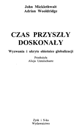John Micklethwait Adrian Wooldridge CZAS PRZYSZŁY DOSKONAŁY Wyzwania i ukryte obietnice globalizacji Przełożyła Alicja Unterschuetz Zysk i S-ka Wydawnictwo Spis treści Od autorów Przedmowa. Kontyngent przyszłości Wprowadzenie. Czas przyszły doskonały 9 15 29 Część pierwsza. Odtwarzanie świata bez granic 1. Upadek i odrodzenie globalizacji 54 Część druga. Trzy lokomotywy globalizacji Technologia jako wolność Brudny dolar Widzialna ręka Seks, śmierć i państwo opiekuńcze 88 111 136 155 Część trzecia. Jeden świat: interes z globalizacją 6. Pięć mitów globalizacji 7. Zarządzanie w globalnym wieku 180 213 2. 3. 4. 5. Część czwarta. Polityka wzajemnej podległości 8. Dziwne trwanie państwa narodowego 9. Porażka globalnego rządu 10. Zamknięcie globalnego umysłu 244 273 305 Część piąta. Zwycięzcy i przegrani 11. Krzemowa Dolina a gospodarka typu „zwycięzca bierze wszystko" 12. Kosmokraci: niespokojna elita 13. Za bramą z czerwonej laki: przegrani globalizacji 330 359 389 Część szósta. Do broni 14. Wróg zbiera siły: odwet na globalizacji 420 15. Członkostwo, czyli obowiązki 452 16. Mrówka i srebrny miecz: praca i inwestowanie w XXI wieku 479 Wnioski. Ukryta obietnica: nowa wolność Podziękowania Przypisy Bibliografia 508 525 529 544