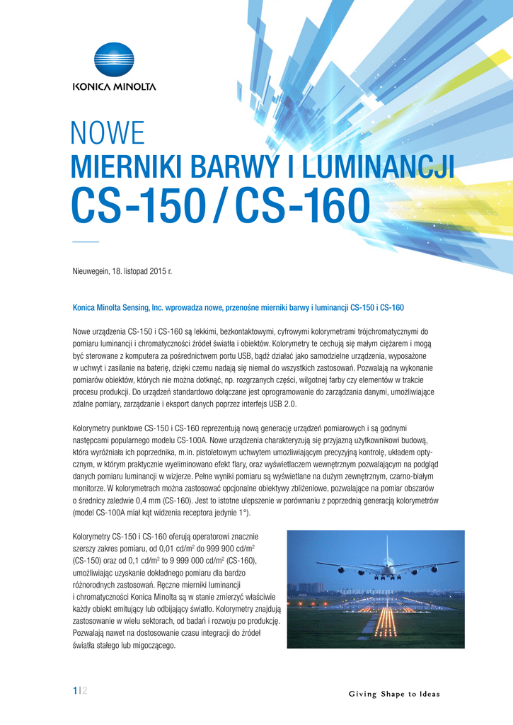 NOWE MIERNIKI BARWY I LUMINANCJI CS-150 / CS-160 Nieuwegein, 18. listopad 2015 r. Konica Minolta Sensing, Inc. wprowadza nowe, przenośne mierniki barwy i luminancji CS-150 i CS-160 Nowe urządzenia CS-150 i CS-160 są lekkimi, bezkontaktowymi, cyfrowymi kolorymetrami trójchromatycznymi do pomiaru luminancji i chromatyczności źródeł światła i obiektów. Kolorymetry te cechują się małym ciężarem i mogą być sterowane z komputera za pośrednictwem portu USB, bądź działać jako samodzielne urządzenia, wyposażone w uchwyt i zasilanie na baterię, dzięki czemu nadają się niemal do wszystkich zastosowań. Pozwalają na wykonanie pomiarów obiektów, których nie można dotknąć, np. rozgrzanych części, wilgotnej farby czy elementów w trakcie procesu produkcji. Do urządzeń standardowo dołączane jest oprogramowanie do zarządzania danymi, umożliwiające zdalne pomiary, zarządzanie i eksport danych poprzez interfejs USB 2.0. Kolorymetry punktowe CS-150 i CS-160 reprezentują nową generację urządzeń pomiarowych i są godnymi następcami popularnego modelu CS-100A. Nowe urządzenia charakteryzują się przyjazną użytkownikowi budową, która wyróżniała ich poprzednika, m.in. pistoletowym uchwytem umozliwiającym precyzyjną kontrolę, układem optycznym, w którym praktycznie wyeliminowano efekt flary, oraz wyświetlaczem wewnętrznym pozwalającym na podgląd danych pomiaru luminancji w wizjerze. Pełne wyniki pomiaru są wyświetlane na dużym zewnętrznym, czarno-białym monitorze. W kolorymetrach można zastosować opcjonalne obiektywy zbliżeniowe, pozwalające na pomiar obszarów o średnicy zaledwie 0,4 mm (CS-160). Jest to istotne ulepszenie w porównaniu z poprzednią generacją kolorymetrów (model CS-100A miał kąt widzenia receptora jedynie 1°). Kolorymetry CS-150 i CS-160 oferują operatorowi znacznie szerszy zakres pomiaru, od 0,01 cd/m2 do 999 900 cd/m2 (CS-150) oraz od 0,1 cd/m2 to 9 999 000 cd/m2 (CS-160), umożliwiając uzyskanie dokładnego pomiaru dla bardzo różnorodnych zastosowań. Ręczne mierniki luminancji i chromatyczności Konica Minolta są w stanie zmierzyć właściwie każdy obiekt emitujący lub odbijający światło. Kolorymetry znajdują zastosowanie w wielu sektorach, od badań i rozwoju po produkcję. Pozwalają nawet na dostosowanie czasu integracji do źródeł światła stałego lub migoczącego. 1|2 Urządzenia CS-150 i CS-160 są wyposażone w sensor o ulepszonej funkcji dopasowywania barw do teoretycznego modelu CIE 1931 oraz lepszej korelacji do teoretycznej krzywej luminancji fotopowej CIE, zapewniając najwyższą dokładność pomiaru. Oprócz pomiaru wartości bezwzględnych, urządzenie może również wyświetlać wartości względem określonego standardu, pozwalając operatorowi na szybką identyfikację i zarejestrowanie różnic luminancji i chromatyczności na dużych powierzchniach lub w podobnych obiektach. Informacje o Konica Minolta Sensing Europe B.V.: Firma Konica Minolta Sensing Europe B.V. jest częścią japońskiego koncernu Konica Minolta Inc. Jest czołowym dostawcą rozwiązań do pomiaru koloru, wyglądu oraz oświetlenia. Firma Konica Minolta Sensing Europe jest obecna na rynku w ponad 30 krajach. W rozwiązaniach pomiarowych firmy stosowane są najnowocześniejsze technologie optyczne i przetwarzania obrazów. Rozwiązania te są wykorzystywane w kontroli jakości oraz wspomagają działy badań i rozwoju w wielu różnych branżach. Nasze rozwiązania do zarządzania kolorami są niezbędnymi składnikami systemów kontroli i monitorowania jakości w wielu branżach produkcyjnych, takich jak motoryzacja, opakowania, tworzywa sztuczne, materiały budowlane, produkty spożywcze, substancje chemiczne i środki farmaceutyczne. W nowatorskiej dziedzinie technologii oświetlenia i wyświetlania analizatory kolorów firmy Konica Minolta są uznawane za standard branżowy. Konica Minolta Sensing stawia na innowacyjność i korzystając z najnowszej technologii bardzo dokładnych detektorów dostarcza rozwiązania, które zaspokajają stale zmieniające się potrzeby w różnych dziedzinach. Kontakt: Konica Minolta Sensing Europe B.V. Theo Duncker Nr telefonu: +31 (0)30 248 1195 [email protected] Więcej informacji można znaleźć na stronie internetowej www.konicaminolta.eu/measuring-instruments Określenia oraz nazwy produktów mogą być znakami towarowymi lub zarejestrowanymi znakami handlowymi prawnych właścicieli, a ich własność jest niniejszym potwierdzona. 2 |2