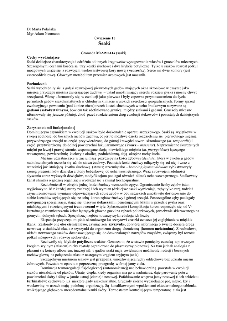 Dr Marta Polańska Mgr Adam Neumann Ćwiczenie 13 Ssaki Gromada MAMMALIA (ssaki) Cechy wyróżniające Ssaki dzisiejsze charakteryzuje i odróżnia od innych kręgowców występowanie włosów i gruczołów mlecznych. Szczególnymi cechami kośćca są trzy kostki słuchowe i dwa kłykcie potyliczne. Tylko u ssaków rozrost półkul mózgowych wiąże się z rozwojem wielowarstwowej kory nowej (neocortex). Serce ma dwie komory (jest czterooddziałowe). Głównym metabolitem przemian azotowych jest mocznik. Pochodzenie Ssaki wyodrębniły się z gałęzi rozwojowej pierwotnych gadów mających okna skroniowe w czaszce jako miejsca przyczepu mięśnia zwierającego żuchwę – układ umożliwiający szeroki rozziew pyska i mocny chwyt szczękami. Włosy uformowały się w ewolucji jako pierwsze i były zapewne przystosowaniem do życia permskich gadów ssakokształtnych w chłodnym klimacie wysokich szerokości geograficznych. Formy sprzed ewolucyjnego powstania (pod koniec triasu) trzech kostek słuchowych w uchu środkowym nazywane są gadami ssakokształtnymi, bowiem tak zdefiniowano granicę między ssakami i gadami. Gruczoły mleczne uformowały się jeszcze później, choć przed rozdzieleniem dróg ewolucji stekowców i pozostałych dzisiejszych ssaków. Zarys anatomii funkcjonalnej Dominującym czynnikiem w ewolucji ssaków było doskonalenie aparatu szczękowego. Ssaki są wyjątkowe w swojej zdolności do bocznych ruchów żuchwą, co jest to możliwe dzięki rozdzieleniu się pierwotnego mięśnia przywodzącego szczęki na część przytwierdzoną do górnej krawędzi otworu skroniowego (m. temporalis) i część przytwierdzoną do dolnej powierzchni łuku jarzmowego (żwacz – masseter). Naprzemienne skurcze tych mięśni po lewej i prawej stronie, wspomagane akcją niewielkiego mięśnia (m. pterygoideus) łączącego wewnętrzną powierzchnię żuchwy z okolicą podniebienną, dają okrężne ruchy żucia. Mięśnie uczestniczące w żuciu mają przyczepy na kości zębowej (dentale), która w ewolucji gadów ssakokształtnych rozrosła się aż do stawu żuchwy. Pozostałe kości żuchwy odłączyły się od niej i wraz z wcześniej już istniejącą kostka słuchową (stapes; strzemiączko – homolog hyomandibulare ryb) stworzyły szereg przenośników dźwięku z błony bębenkowej do ucha wewnętrznego. Wraz z rozwojem zdolności słyszenia coraz wyższych dźwięków, modyfikacjom podlegał również ślimak ucha wewnętrznego. Stożkowaty kanał ślimaka o gadziej organizacji wydłużał się i zwinął trochospiralnie. Rozłożenie sił w obrębie jednej kości żuchwy wzmocniło zgryz. Ograniczenie liczby zębów (stan wyjściowy to 16 z każdej strony żuchwy) i ich wymian (dzisiejsze ssaki wymieniają zęby tylko raz), tudzież zsynchronizowanie wymiany odpowiadających sobie zębów w obu szczękach umożliwiło dostosowanie do siebie kształtów stykających się ze sobą koron zębów żuchwy i górnej szczęki. Poszczególne zęby podlegały postępującej specjalizacji, stając się tnącymi siekaczami i penetrującymi kłami w przedzie pyska oraz miażdżącymi i rozcierającymi trzonowcami w tyle. Spłaszczenie i komplikacja koron rozpoczęło się od Vkształtnego rozmieszczenia żeber łączących główne guzki na zębach policzkowych, przeciwnie skierowanego na górnych i dolnych zębach. Specjalizacji zębów towarzyszyła redukcja ich liczby. Ekspansja przyczepu mięśnia skroniowego ku szczytowi czaszki oznacza jej zagłębianie w miękkie tkanki. Zasłoniły one oko ciemieniowe, czyniąc zeń szyszynkę, do której informacja o świetle dociera drogą nerwową z siatkówki oka, a z szyszynki do organizmu drogą chemiczną (hormon melatonina). Z rozbudową układu nerwowego ssaków dostosowującego się do doskonalonych narządów zmysłów, związany był rozrost półkul mózgowych i rozwój neokorteksu. Rozdwoiły się kłykcie potyliczne ssaków. Oznacza to, że w stawie pomiędzy czaszką a pierwszym kręgiem szyjnym (atlasem) ruchy zostały ograniczone do płaszczyzny pionowej. Na tym jednak analogia z płazami się kończy albowiem, inaczej niż u gadów ssaki mają zwiększone możliwości rotacji i bocznych ruchów głową na połączeniu atlasu z następnym kręgiem szyjnym (axis). Szczególnym mięśniem ssaków jest przepona, umożliwiająca ruchy oddechowe bez udziału mięśni żebrowych. Powstała w oparciu o poprzeczną przegrodę wtórnej jamy ciała. Dominacja termoregulacji fizjologicznej (autonomicznej) nad behawioralną powstała w ewolucji ssaków niezależnie od ptaków. Utratę ciepła, kiedy organizm ma go w nadmiarze, daje parowanie potu z powierzchni skóry i śliny w jamie ustnej (zianie) i nosowej. Pofałdowanie wnętrza jamy nosowej (i ich szkieletu turbinaliów) cechowało już niektóre gady ssakokształtne. Gruczoły skórne wydzielające pot, mleko, łzy i woskowinę w uszach mają podobną organizację. Są kanalikowatymi wpukleniami ektodermalnego nabłonka wnikającego głęboko w mezodermalne tkanki skóry. Termostatem kontrolującym temperaturę ciała jest podwzgórze (hypothalamus) w mózgu. Temperatura powierzchni ciała stekowców (rząd Monotremata) wynosi 26-34° C, jest więc raczej zmienna; łatwo też wchodzą w stan hibernacji, kiedy ciepłota ciała jest tylko o ułamki stopnia wyższa od otoczenia. U torbaczy (rząd Marsupialia) jest nieco wyższa i wynosi 34-36° C. Podwyższona temperatura ciała ssaków łożyskowych (podgromada PLACENTALIA) jest powodem, dla którego u większości z nich (przynajmniej w okresie rui) jądra opuszczają się do worków skórnych znajdujących się poza jama ciała (gonady ptaków, których temperatura bywa jeszcze wyższa, znajdują się w sąsiedztwie worków powietrznych). Stosownie do podwyższonego metabolizmu układ krwionośny ssaków jest znacznie bardziej wyspecjalizowany od gadziego. Ich krwinki czerwone są owalnymi, nie zawierającymi organelli workam