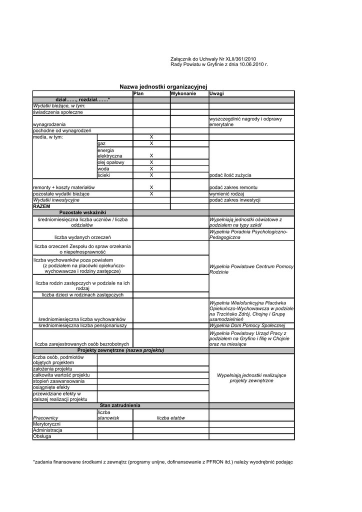 Załącznik do Uchwały Nr XLII/361/2010 Rady Powiatu w Gryfinie z dnia 10.06.2010 r. Nazwa jednostki organizacyjnej Plan Wykonanie Uwagi dział……, rozdział…….* Wydatki bieżące, w tym: świadczenia społeczne wyszczególnić nagrody i odprawy emerytalne wynagrodzenia pochodne od wynagrodzeń media, w tym: gaz energia elektryczna olej opałowy woda ścieki remonty + koszty materiałów pozostałe wydatki bieżące Wydatki inwestycyjne RAZEM Pozostałe wskaźniki średniomiesięczna liczba uczniów / liczba oddziałów X X X X X X X X liczba wydanych orzeczeń podać ilość zużycia podać zakres remontu wymienić rodzaj podać zakres inwestycji Wypełniają jednostki oświatowe z podziałem na typy szkół Wypełnia Poradnia PsychologicznoPedagogiczna liczba orzeczeń Zespołu do spraw orzekania o niepełnosprawność liczba wychowanków poza powiatem (z podziałem na placówki opiekuńczowychowawcze i rodziny zastępcze) Wypełnia Powiatowe Centrum Pomocy Rodzinie liczba rodzin zastępczych w podziale na ich rodzaj liczba dzieci w rodzinach zastępczych średniomiesięczna liczba wychowanków średniomiesięczna liczba pensjonariuszy liczba zarejestrowanych osób bezrobotnych Projekty zewnętrzne (nazwa projektu) liczba osób, podmiotów objętych projektem założenia projektu całkowita wartość projektu stopień zaawansowania osiągnięte efekty przewidziane efekty w dalszej realizacji projektu Stan zatrudnienia liczba stanowisk Pracownicy liczba etatów Merytoryczni Administracja Obsługa Wypełnia Wielofunkcyjna Placówka Opiekuńczo-Wychowawcza w podziale na Trzcińsko Zdrój, Chojnę i Grupę usamodzielnień Wypełnia Dom Pomocy Społecznej Wypełnia Powiatowy Urząd Pracy z podziałem na Gryfino i filię w Chojnie oraz na miesiące Wypełniają jednostki realizujące projekty zewnętrzne *zadania finansowane środkami z zewnątrz (programy unijne, dofinansowanie z PFRON itd.) należy wyodrębnić podając