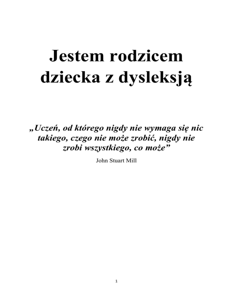 Jestem rodzicem dziecka z dysleksją „Uczeń, od którego nigdy nie wymaga się nic takiego, czego nie może zrobić, nigdy nie zrobi wszystkiego, co może” John Stuart Mill 1 Wskazówki dla rodziców dziecka z dysleksją Co robić? Zachęcać do systematycznej pracy. Zrozumieć problem dziecka – dziecko nie jest leniwe czy niezdolne, ono po prostu potrzebuje właściwie ukierunkowanej pomocy. Poznać jego mocne strony. Wzmacniać w dziecku pozytywne wartości, zainteresowania. Zapewnić mu warunki do pracy. Wzmacniać pozytywnie, czyli nagradzać pochwałą nawet za drobne sukcesy. Analizować trudności. Nauczyć stałego korzystania ze słownika ortograficznego. Czytać wspólnie z dzieckiem. Pobudzać u dziecka potrzebę czytania dla przyjemności. Budowa pewności siebie u dyslektycznego dziecka to proces, który włącza rozwijanie pasji oraz ukrytych talentów dziecka. Ważne jest to, by wspierać dziecko w jego twórczych zabiegach, albowiem dziecko z dysleksją stara się ukryć swoje „słabsze strony” i rozwiązuje często swoje problemy w sposób odmienny niż pozostałe dzieci, bardziej kreatywny. Organizować dziecku czas wolny, zadbać o to, by rozwijało swoje pasje, cieszyć się z jego mniejszych i większych sukcesów. Pozwolić dziecku na uczestnictwo w zajęciach sportowych lub innych dodatkowych zajęciach pozaszkolnych. Wychwycić jego zainteresowania i zdolności - łatwiej i szybciej uczymy się rzeczy, które nas interesują i które sprawiają nam przyjemność. Pokazać dziecku, że zdobywanie wiedzy to świetna zabawa rodzinne oglądanie programów edukacyjnych, czytanie książek, wyprawy do muzeum czy zwiedzanie zabytków… Zachowywać spokój i panować nad emocjami, nie wpadać w gniew, gdy dziecko nas irytuje. 2 Należy skupić się na mocnych stronach dziecka (np. rysowanie, gra w piłkę), a nie na słabościach. Wierzyć w zdolności dziecka. Nagradzać dziecko za małe i większe sukcesy. Opowiadać o napotkanych w dzieciństwie trudnościach, które były podobne do dylematów jego wieku. Zachęcać je do działania i motywować. Słuchać dziecka, gdy chce nam coś opowiedzieć, zachęcać je do inicjowania rozmowy. Codziennie znaleźć czas dla dziecka i poświęcić go tylko jemu, liczy się jakość czasu spędzonego z dzieckiem. Unikać ciągłej kontroli nad dzieckiem - samo musi się nauczyć dokonywać wyborów. Czego nie robić? Nie porównywać z rówieśnikami czy rodzeństwem. Nie liczyć na natychmiastowe efekty. Nie krytykować. Nie odrabiać za dziecko prac domowych. Nie poprawiać błędów w pracach pisemnych - dziecko powinno nauczyć się pracować ze słownikiem ortograficznym. Systematyczna praca w szkole i w domu to podstawowy warunek skutecznego oddziaływania na dziecko. Aby przyniosło ono pożądany efekt, warto zapoznać się z podstawowymi zasadami pracy z dzieckiem z dysleksją: Wykonywanie zadań zawsze w tym samym miejscu – najlepiej przy własnym biurku – i najlepiej o tym samym czasie, bo to wspomaga gotowość dziecka do uczenia się. Pamięć pracuje sprawniej, gdy dziecko jest zrelaksowane, a zatem ważny jest odpoczynek przed przystąpieniem do ćwiczeń. Miejsce do pracy powinno być uprzątnięte, bez zbędnych przedmiotów przykuwających wzrok dziecka i rozpraszających jego uwagę. Trzeba dbać o ciszę – wyłączyć telewizor, sprzęt grający, telefon. Mózg wymaga 3 rozgrzewki, czyli ćwiczeń wstępnych (w formie zabawy). Zalecaną formą wspierającą pracę i relaks dziecka są ćwiczenia ruchowe. Rodzice powinni umiejętnie zachęcać dziecko do pracy. Akcentowanie jego mocnych stron oraz odniesionych sukcesów pomoże mu w pokonywaniu trudności. Rodzice swą postawą mogą wzbudzać w dziecku wiarę w to, że trudności można pokonać wytrwałą i systematyczną pracą. Należy zachęcać dziecko do rozmów o jego porażkach i osiągnięciach, dawać wsparcie oraz poczucie bezpieczeństwa. Wzajemna szczerość i otwartość pomoże dziecku odnaleźć się w trudnych sytuacjach. Praca z dzieckiem z dysleksją wymaga ćwiczenia umiejętności czytania i ortograficznego pisania. Równie ważna jest dbałość o poziom graficzny pisma, czyli o jego czytelność i estetykę. Oba rodzaje ćwiczeń wymagają przestrzegania pewnych zasad. Rodzic podejmujący się kierowania pracą dziecka powinien mieć ich świadomość, by jego zaangażowanie nie przyniosło skutków odwrotnych do pożądanych. Ćwiczenia w czytaniu Ćwiczenia w pisaniu Wybierzmy interesujący tekst. Zezwalajmy na pisanie ołówkiem lub zmazywalnym długopisem. Ułatwi to poprawianie błędów. Unikajmy podkreślania dostrzeżonych błędów. Zaznaczajmy tylko ich liczbę na marginesie linii, w której się pojawiły. Polećmy dziecku, aby samo znalazło błędy korzystając ze słownika ortograficznego dziecko z dysleksją może wypracować nawyk autokorekty. Odszukane błędnie zapisane wyrazy dziecko powinno napisać Wiedzmy, że Twój dobry humor i dziecka przyspieszy postępy w czytaniu. Do ćwiczeń najlepsza jest książka, która ma większy druk i kolorowe ilustracje. Sami zacznijmy czytać dziecku… 4 poprawnie 5-6 razy i użyć je w zdaniach. Niech dziecko palcem wskazuje Pomóżmy dziecku utrwalać słowa, które przeczytasz na głos. zasady pisowni, wyjaśniając wszystkie wątpliwości przy użyciu słownika ortograficznego. Czytając dziecku, podkreślajmy W młodszych klasach nie tonem ich znaczenie. stosujmy dyktand (pisania ze słuchu). Zastąpmy je pisaniem z pamięci (dziecko zapoznaje się z tekstem, zapamiętuje zdanie, a następnie zakrywa je i pisze z pamięci). Dostosujmy szybkość czytania Najlepiej, gdy dziecko zapisuje do możliwości śledzenia tekstu wypowiedź pisemną w przez dziecko. brudnopisie. Po omówieniu z rodzicem przepisuje pracę do zeszytu, a rodzic jeszcze raz sprawdza jej poprawność. Nie ponaglajmy dziecka podczas czytania. Czytajmy z dzieckiem na zmianę. Długość fragme