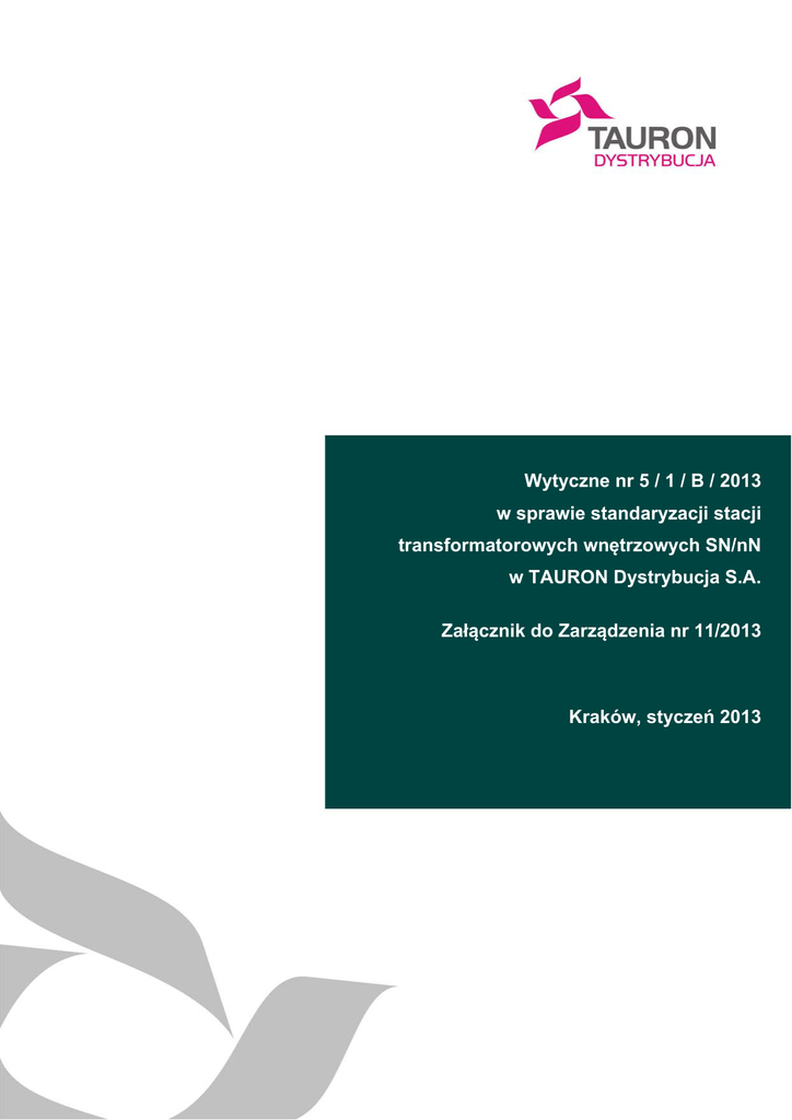 Wytyczne nr 5 / 1 / B / 2013 w sprawie standaryzacji stacji transformatorowych wnętrzowych SN/nN w TAURON Dystrybucja S.A. Załącznik do Zarządzenia nr 11/2013 Kraków, styczeń 2013 Spis treści 1. Zakres stosowania ............................................................................................... 3 2. Podstawa opracowania ........................................................................................ 3 3. Opis zmian ........................................................................................................... 3 4. Wymagania .......................................................................................................... 3 5. Dokumenty związane ......................................................................................... 16 Wytyczne nr 5 /1/ B / 2013 w sprawie standaryzacji stacji transformatorowych wnętrzowych SN/nN TAURON Dystrybucja S.A. str. 2 1. Zakres stosowania Niniejsze ”Wytyczne nr 5/1/B/2013 w sprawie standaryzacji stacji transformatorowych wnętrzowych SN/nN TAURON Dystrybucja S.A.” (dalej: Wytyczne) zawierają podstawowe wymagania techniczne, które powinny spełniać budowane stacje transformatorowe wnętrzowe SN/nN na terenie działania TAURON Dystrybucja SA. W przypadku stacji transformatorowych wnętrzowych SN/nN istniejących, niniejsze Wytyczne – w części lub całości wymagań – mają zastosowanie w przypadkach, kiedy ich użycie jest uzasadnione i celowe (np. remont lub modernizacja stacji). Odstępstwa od wymagań zawartych w niniejszych Wytycznych powinny uzyskać akceptację Dyrektora Oddziału / Dyrektora Naczelnego. Niniejsze Wytyczne obowiązują od dnia 29 stycznia 2013 roku. Wszelkie dokumenty, w szczególności zawarte wcześniej umowy oraz warunki przyłączenia i umowy o przyłączenie do sieci, oraz wszystkie zadania zlecone do realizacji w oparciu o dokumentację uzgodnioną na podstawie dotychczas obowiązujących zasad zachowują ważność po dniu wejścia w życie niniejszych Wytycznych. 2. Podstawa opracowania Podstawą dla opracowania niniejszych Wytycznych jest Zarządzenie nr 6/2012 Prezesa Zarządu TAURON Dystrybucja S.A. z dnia 30 stycznia 2012 roku w sprawie wprowadzenia „Wytycznych w sprawie standaryzacji budowy i eksploatacji elementów sieci elektroenergetycznej TAURON Dystrybucja S.A.” oraz obowiązujące przepisy i powszechnie uznane zasady wiedzy technicznej. 3. Opis zmian Wydanie pierwsze. 4. Wymagania Niniejsze Wytyczne obejmują swoim zakresem wszystkie rodzaje stacji transformatorowych wnętrzowych SN/nN, zarówno w wykonaniu wolnostojącym jak i wkomponowane w istniejące obiekty budowlane. Projektowanie i budowa urządzeń stacji transformatorowych wnętrzowych SN/nN powinny być każdorazowo oparte na aktach prawnych oraz zgodne z uznaną wiedzą techniczną. Jako zasadę przyjmuje się stosowanie typowych rozwiązań stacji transformatorowych wnętrzowych SN/nN, małogabarytowych, zlokalizowanych na gruncie lub w obiektach o uregulowanym stanie prawnym. Rozwiązania konstrukcyjne stacji powinny zapewnić wysoki poziom bezpieczeństwa służbom TAURON Dystrybucja S.A. oraz osobom postronnym. Ponadto powinny zapewniać wysoki poziom niezawodności pracy. Lokalizacja stacji powinna umożliwiać nieskrępowaną i bezpieczną obsługę z całodobowym dostępem do urządzeń. Wszystkie elementy stacji wnętrzowej SN/nN powinny być wykonane w sposób zapewniający 40-letni okres użytkowania. Wytyczne nr 5 /1/ B / 2013 w sprawie standaryzacji stacji transformatorowych wnętrzowych SN/nN TAURON Dystrybucja S.A. str. 3 4.1. Wymagania szczegółowe 4.1.1. Budowa i konstrukcja stacji transformatorowej wnętrzowej SN/nN 4.1.1.1. Budynek stacji Stacje transformatorowe wnętrzowe SN/nN wolnostojące należy wykonywać z prefabrykatów żelbetonowych jako monolityczny odlew ścian, wykonanych z żelbetonu klasy minimum B30. Stacja transformatorowa wnętrzowa SN/nN musi posiadać monolityczny fundament piwniczny pod całym budynkiem zagłębiony poniżej powierzchni terenu z wydzieloną częścią na potrzeby misy olejowej. Dopuszcza się wykonanie budynku metodą tradycyjną. W każdym przypadku wymagany jest projekt architektoniczno – budowlany budynku stacji transformatorowej wnętrzowej SN/nN. Preferowanym rozwiązaniem są stacje transformatorowe wnętrzowe SN/nN z obsługą od wewnątrz. Dopuszcza się stosowanie stacji transformatorowych wnętrzowych SN/nN z obsługą od zewnątrz lub podziemnych (z odpowiednią wentylacją). Elewację budynku należy wykonywać na bazie żywic syntetycznych. Wokół stacji transformatorowej wnętrzowej SN/nN należy przewidzieć opaskę z typowej kostki brukowej betonowej lub z płyt betonowych o szerokości 0,5 m. Opaskę należy wykonać z widocznym spadkiem od stacji transformatorowej wnętrzowej SN/nN na zewnątrz. Rodzaj dachu powinien być dostosowany do wymagań architektonicznych. Stacje transformatorowej wnętrzowej SN/nN nie powinny posiadać rynien, ani otworów okiennych. Pomiędzy komorą transformatorową, a pomieszczeniem w rozdzielni SN i nN w razie potrzeb należy stosować przegrodę odgradzającą, wykonaną z siatki lub blachy. W stacji transformatorowej wnętrzowej SN/nN należy stosować stolarkę aluminiową lakierowaną proszkowo lub stalową, zabezpieczoną antykorozyjnie w systemie duplex lub równoważnym, bądź zabezpieczoną antykorozyjnie np. poprzez cynkowanie ogniowe, zgodnie z treścią dokumentu wymienionego w rozdziale 5 niniejszych Wytycznych, a w środowiskach agresywnych dodatkowo pomalowaną atestowanymi farbami. Prefabrykowana stacja transformatorowa wnętrzowa SN/nN musi być przystosowana do zabudowy w miejscu, gdzie będą występowały normalne warunki pracy tj.: temperatura otoczenia pracy – minimum „+40°C”, minimalna temperatura otoczenia dla klasy „minus 25, warunki wnętrzowe”, wysokość zabudowy do 1000 m n.p.m. Zaleca się stosowanie prefabrykowanych stacji transfor