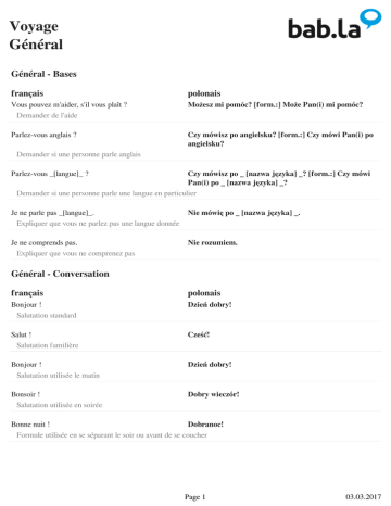 Voyage Général Général - Bases français polonais Vous pouvez m'aider, s'il vous plaît ? Demander de l'aide Możesz mi pomóc? [form.:] Może Pan(i) mi pomóc? Parlez-vous anglais ? Czy mówisz po angielsku? [form.:] Czy mówi Pan(i) po angielsku? Demander si une personne parle anglais Parlez-vous _[langue]_ ? Czy mówisz po _ [nazwa języka] _? [form.:] Czy mówi Pan(i) po _ [nazwa języka] _? Demander si une personne parle une langue en particulier Je ne parle pas _[langue]_. Expliquer que vous ne parlez pas une langue donnée Nie mówię po _ [nazwa języka] _. Je ne comprends pas. Expliquer que vous ne comprenez pas Nie rozumiem. Général - Conversation français polonais Bonjour ! Salutation standard Dzień dobry! Salut ! Salutation familière Cześć! Bonjour ! Salutation utilisée le matin Dzień dobry! Bonsoir ! Salutation utilisée en soirée Dobry wieczór! Bonne nuit ! Dobranoc! Formule utilisée en se séparant le soir ou avant de se coucher Page 1 03.03.2017 Voyage Général Comment vas-tu ? Jak się masz? [form.:] Jak się Pan(i) ma? Conversation générale afin de se renseigner sur la santé de votre interlocuteur Bien, merci. Réponse polie à "Comment vas-tu ?" Dobrze, dziękuję. Comment t'appelles-tu ? Demander le nom d'une personne Jak się nazywasz? [form.:] Jak się Pan(i) nazywa? Je m'appelle ___. Donner son nom Nazywam się ___. D'où viens-tu ? Demander le lieu d'origine de la personne Skąd pochodzisz? [form.:] Skąd Pan(i) pochodzi? Je viens de ___. Donner son lieu d'origine Pochodzę z ___. Quel âge as-tu ? Demander l'âge d'une personne Ile masz lat? [form.:] Ile ma Pan(i) lat? J'ai __ ans. Donner son âge Mam ___ lat(a). Oui Répondre par la positive Tak Non Répondre par la négative Nie S'il vous plaît Formule de politesse Proszę Et voilà ! Proszę bardzo! Formule utilisée en donnant quelque chose à quelqu'un Merci. Remercier quelqu'un Dziękuję. Page 2 03.03.2017 Voyage Général Merci beaucoup. Remercier chaleureusement Dziękuję bardzo. Je t'en prie. Formule polie en retour au "merci" Proszę bardzo! / Nie ma za co! Je suis désolé(e). Demander pardon Przepraszam. Excusez-moi. Attirer l'attention de quelqu'un Przepraszam. Cela ne fait rien. Réponse à une excuse présentée acceptée Nic się nie stało. Il n'y a pas de mal. Réponse à une excuse présentée acceptée Nie ma sprawy. Attention ! Avertir d'un danger Uwaga! J'ai faim. Exprimer sa faim Jestem głodny/-a. J'ai soif. Exprimer sa soif Chce mi się pić. Je suis fatigué(e). Exprimer sa fatigue Jestem zmęczony/-a. Je suis malade. Exprimer un état de santé faible Źle się czuję. Je ne sais pas. Nie wiem. Réponse à une question dont vous ignorez la réponse Ravi(e) de vous avoir rencontré. Miło było cię poznać. [form.:] Miło było Panią/Pana poznać. Formule de politesse pour clore une première rencontre Page 3 03.03.2017 Voyage Général Au revoir ! Se séparer Do widzenia! Général - Plaintes français polonais Je voudrais faire une réclamation. Se plaindre poliment Chciał(a)bym złożyć skargę. Qui est le responsable ici ? Trouver la personne responsable Kto tu rządzi? C'est absolument inacceptable ! Exprimer son insatisfaction To jest absolutnie niedopuszczalne! J'exige un remboursement ! Demander un remboursement Żądam zwrotu pieniędzy! Cela fait plus d'une heure que nous attendons. Se plaindre à propos de l'attente Czekamy ponad godzinę. Général - Jurer français polonais La nourriture est infecte ! To jedzenie smakuje jak gówno! Exprimer son dégoût pour la nourriture de manière vulgaire Cette boisson est imbuvable ! Ten napój/drink smakuje jak szczyny! Exprimer son dégoût pour la boisson de manière vulgaire C'est pourri ici ! To miejsce to obrzydliwa nora! Exprimer son mécontentement du lieu de résidence de manière vulgaire Cette voiture est une épave ! Ten samochód to wrak! Exprimer son mécontentement de la voiture de manière vulgaire Le service est inadmissible ! Obsługa jest do dupy! Exprimer son mécontentement du service de manière vulgaire Page 4 03.03.2017 Voyage Général C'est une grosse arnaque ! Se plaindre du prix trop élevé To jest totalne zdzierstwo! C'est des conneries ! Gówno prawda! Montrer de manière vulgaire que l'on ne croit pas la personne Crétin fini ! Insulter la personne sur son intelligence Kretyn/Kretynka! Vous ne savez pas de quoi de vous parlez ! Insulter la personne sur ses connaissances Gówno wiesz! Allez vous faire voir ! Odwal się! Dire vulgairement à une personne de quitter les lieux On va régler ça dehors ! Załatwmy to na zewnątrz! Demander à une personne de se battre en dehors de l'établissement Page 5 Powered by TCPDF (www.tcpdf.org) 03.03.2017