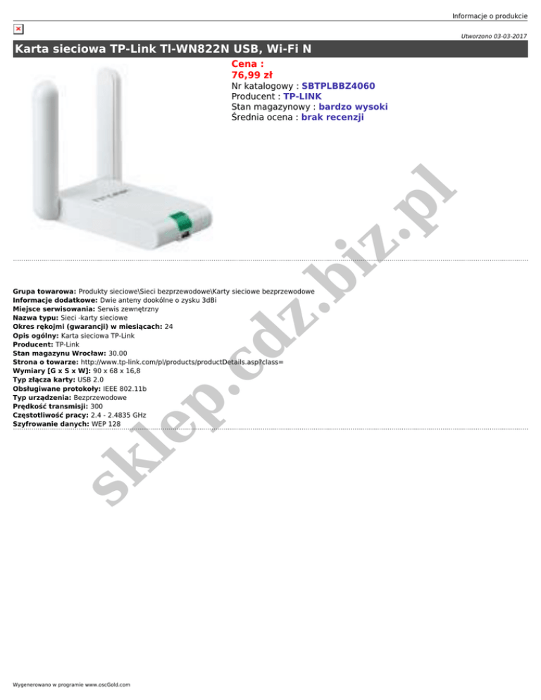 Informacje o produkcie Utworzono 03-03-2017 Karta sieciowa TP-Link Tl-WN822N USB, Wi-Fi N Cena : 76,99 zł .b iz .p l Nr katalogowy : SBTPLBBZ4060 Producent : TP-LINK Stan magazynowy : bardzo wysoki Średnia ocena : brak recenzji sk le p .c dz Grupa towarowa: Produkty sieciowe\Sieci bezprzewodowe\Karty sieciowe bezprzewodowe Informacje dodatkowe: Dwie anteny dookólne o zysku 3dBi Miejsce serwisowania: Serwis zewnętrzny Nazwa typu: Sieci -karty sieciowe Okres rękojmi (gwarancji) w miesiącach: 24 Opis ogólny: Karta sieciowa TP-Link Producent: TP-Link Stan magazynu Wrocław: 30.00 Strona o towarze: http://www.tp-link.com/pl/products/productDetails.asp?class= Wymiary [G x S x W]: 90 x 68 x 16,8 Typ złącza karty: USB 2.0 Obsługiwane protokoły: IEEE 802.11b Typ urządzenia: Bezprzewodowe Prędkość transmisji: 300 Częstotliwość pracy: 2.4 - 2.4835 GHz Szyfrowanie danych: WEP 128 Wygenerowano w programie www.oscGold.com