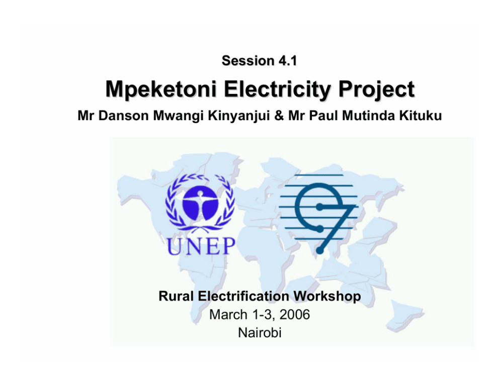Session 4.1 Mpeketoni Electricity Project Mr Danson Mwangi Kinyanjui & Mr Paul Mutinda Kituku Rural Electrification Workshop March 1-3, 2006 Nairobi Mpeketoni Electricity Project • e7 / UNEP Rural Electrification Workshop Nairobi • • • • Community Based Electricity Project Independent of Subsidies High demand High tariffs Constrained by rising cost of production 2 Mpeketoni Overview e7 / UNEP Rural Electrification Workshop Nairobi • Mpeketoni is part of a resettlement programme initiated in the 1970s in an area with high agricultural potential. • It is located of the Northern coast of Kenya, 230km north of Malindi and 60km from Lamu island. • The scheme covers about 38000acres and has a population of about 31000 • Agriculture is the main source of income in the settlement scheme. Crops grown include cashewnuts, cotton, maize, bananas, bixa and simsim. • In addition, a number of fruit and horticulture crops are grown for sale in Lamu and Mombasa markets. 3 Mpeketoni - Location e7 / UNEP Rural Electrification Workshop Nairobi •Coast of Kenya •Lamu District 4 e7 / UNEP Rural Electrification Workshop Nairobi Mpeketoni Electricity Project (MEP) • Diesel-fired electricity generation and distribution system • Isolated from national grid • Established in 1993 – Ksh534,000 (US$7,500) is raised towards the project through the sale of 178 individual shares to the public – community also provides the land – GTZ contributes a generator house, office construction, generation and transmission equipment and starting capital – Land provided by Government 5 MEP History e7 / UNEP Rural Electrification Workshop Nairobi • 1994 - Project starts to generate electricity, the system comprises a 60KVA generator and a 4km network serving 75 single-phase connections and 15, 3-phase connections. • 1996 - A 57kVA generator is added • 1999 - Due to increased demand a 150kVA generator is added and carries the major load to date. • 2004 - Project is handed over to the community. • 2005 - Project has 220 single-phase connections and 20, 3-phase connections 6 MEP Consumers e7 / UNEP Rural Electrification Workshop Nairobi • about 130 shops, over 90 households, 4 flourmills, and a number of garages, workshops and small-scale industries. • several larger industries and key services such as a subdistrict hospital, secondary school, and the Government offices. • Connections made on the Mpeketoni grid reach about 4% of the families in the Lake Kenyatta settlement scheme •Total demand can peak at roughly 200 kW (which is near the limit of the system’s capacity) and totals about kWh 190,000 per year 7 Tariffs • Increase in electricity tariffs since 1994. USc/kWh 40 30 20 10 1999 2004 Year 40 35 30 USc/kWh e7 / UNEP Rural Electrification Workshop Nairobi 0 1994 • MEP’s tariffs in comparison to others in the region (USc) 25 20 15 10 5 0 MEP Kenya Tanzania Uganda South Africa 8 e7 / UNEP Rural Electrification Workshop Nairobi Constraints to Operation and Expansion • The rising price of diesel fuel. • High cost of maintenance of the system components • Power quality and reliability • High connection costs • Rising power demand within and outside the township 9 E7 and MEP e7 / UNEP Rural Electrification Workshop Nairobi • E7 identified MEP in 2004 as a result of a scoping study to identify and develop an off-grid demonstration renewable energy project • Potential for investment in wind energy to reduce generation costs and tariff • Some of the activities undertaken include: – Wind data collection since December 2004 – A feasibility study examine opportunities for utilizing the local wind resource to providing extra capacity to the existing system and drawn down the cost of generation. Upgrading of existing grid to increase security of supply and improve quality of supply (eg soft start panels on grain mills) Reduce costs for connection utilizing low cost electrification techniques 10 Next Steps e7 / UNEP Rural Electrification Workshop Nairobi • MEP to receive 2 x300kVA generators from Government of Kenya Ministry of Energy – discussions, logistics and EIA facilitated by e7 • E7 to review feasibility and agree programme for upgrading of distribution network • International tender underway for purchase and installation of wind turbines. • Financial structure to be finalised 11