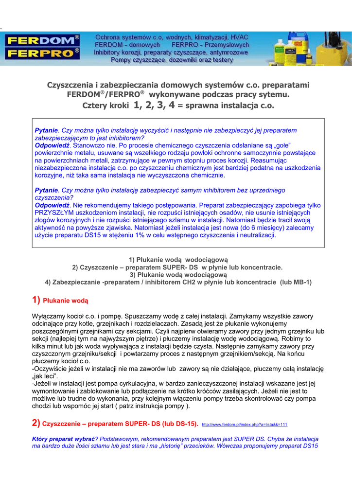 ` Czyszczenia i zabezpieczania domowych systemów c.o. preparatami FERDOM®/FERPRO® wykonywane podczas pracy sytemu. Cztery kroki 1, 2, 3, 4 = sprawna instalacja c.o. Pytanie. Czy można tylko instalację wyczyścić i następnie nie zabezpieczyć jej preparatem zabezpieczającym to jest inhibitorem? Odpowiedź. Stanowczo nie. Po procesie chemicznego czyszczenia odsłaniane są „gołe” powierzchnie metalu, usuwane są wszelkiego rodzaju powłoki ochronne samoczynnie powstające na powierzchniach metali, zatrzymujące w pewnym stopniu proces korozji. Reasumując niezabezpieczona instalacja c.o. po czyszczeniu chemicznym jest bardziej podatna na uszkodzenia korozyjne, niż taka sama instalacja nie wyczyszczona chemicznie. Pytanie. Czy można tylko instalację zabezpieczyć samym inhibitorem bez uprzedniego czyszczenia? Odpowiedź. Nie rekomendujemy takiego postępowania. Preparat zabezpieczający zapobiega tylko PRZYSZŁYM uszkodzeniom instalacji, nie rozpuści istniejących osadów, nie usunie istniejących złogów korozyjnych i nie rozpuści istniejącego szlamu w instalacji. Natomiast będzie tracił swoją aktywność na powyższe zjawiska. Natomiast jeżeli instalacja jest nowa (do 6 miesięcy) zalecamy użycie preparatu DS15 w stężeniu 1% w celu wstępnego czyszczenia i neutralizacji. 1) Płukanie wodą wodociągową 2) Czyszczenie – preparatem SUPER- DS w płynie lub koncentracie. 3) Płukanie wodą wodociągową 4) Zabezpieczanie -preparatem / inhibitorem CH2 w płynie lub koncentracie (lub MB-1) 1) Płukanie wodą Wyłączamy kocioł c.o. i pompę. Spuszczamy wodę z całej instalacji. Zamykamy wszystkie zawory odcinające przy kotle, grzejnikach i rozdzielaczach. Zasadą jest że płukanie wykonujemy poszczególnymi grzejnikami czy sekcjami. Czyli najpierw otwieramy zawory przy jednym grzejniku lub sekcji (najlepiej tym na najwyższym piętrze) i płuczemy instalację wodę wodociągową. Robimy to kilka minut lub jak woda wypływająca z instalacji będzie czysta. Następnie zamykamy zawory przy czyszczonym grzejniku/sekcji i powtarzamy proces z następnym grzejnikiem/sekcją. Na końcu płuczemy kocioł c.o. -Oczywiście jeżeli w instalacji nie ma zaworów lub zawory są nie działające, płuczemy całą instalację „jak leci”. -Jeżeli w instalacji jest pompa cyrkulacyjna, w bardzo zanieczyszczonej instalacji wskazane jest jej wymontowanie i zablokowanie lub podłączenie na krótko króćców zasilających. Jeżeli nie jest to możliwe lub trudne do wykonania, przy kolejnym włączeniu pompy trzeba skontrolować czy pompa chodzi lub wspomóc jej start ( patrz instrukcja pompy ). 2) Czyszczenie – preparatem SUPER- DS (lub DS-15). http://www.ferdom.pl/index.php?a=lista&k=111 Który preparat wybrać? Podstawowym, rekomendowanym preparatem jest SUPER DS. Chyba że instalacja ma bardzo duże ilości szlamu lub jest stara i ma „historię” przecieków. Wówczas proponujemy preparat DS15 a) Instalacje z naczyniem wzbiorczym: spuścić część wody z systemu, wlać preparat do naczynia wzbiorczego, uzupełnić braki wody. b) Instalacje ciśnieniowe: Znaleźć miejsce w instalacji, które można odciąć dwoma zaworami np. grzejnik, kocioł. Zamknąć zawory, spuścić wodę (z grzejników lub kotła) wlać preparat (w grzejniku np. odkręcić korek odpowietrzający i wlać preparat np. lejkiem). Uzupełnić wodę w instalacji. --Uruchomić instalację na ok 2 godz. utrzymując temperaturę pracy 60-70oC. Pozostawić preparat w instalacji przez 2 do 14 dni podczas normalnej pracy systemu. Gdy system nie pracuje np. w okresie letnim włączyć jak wyżej instalację na ok. 2 godz. , a następnie pozostawić preparat w instalacji na okres 4 tygodni, jeżeli można włączając system na 30 min co 2-3 dni. Po zakończeniu czyszczenia spuścić roztwór z instalacji. Ze względu na niskie stężenie oraz brak aktywności po zakończeniu procesu czyszczenia produkt nie wymaga neutralizacji przed spuszczeniem do kanalizacji. Uwaga – Szczególnie w pierwszym etapie czyszczenia kilkunastoletnich instalacji lub tych które miały historię przecieków, należy kontrolować instalację albowiem preparat czyszczący może wypłukać złogi lub osady, które mogły „blokować” wypływ wody z uszkodzonych miejsc instalacji. Typowym miejsce wycieków są zawory i śrubunki, które należy w razie potrzeby ( i możliwości) dokręcić. 3) Płukanie wodą. Powtórzyć czynność z punktu 1). Po skończonym procesie czyszczenia zostawić instalację częściowo napełnioną. 4) Zabezpieczanie -inhibitorem CH2 w płynie, koncentracie (CH-1) http://www.ferdom.pl/index.php?a=lista&k=110 Który preparat wybrać? Podstawowym, rekomendowanym preparatem jest CH2 polecany do instalacji c.o. wykonanych ze wszystkich materiałów, także do tych w której występuje aluminium i miedź. Preparat MB-1 (CH-1) jest do instalacji tradycyjnych, stalowo – żeliwnych. a) Instalacje z naczyniem wzbiorczym: spuścić część wody z systemu, wlać preparat do naczynia wzbiorczego, uzupełnić braki wody. b) Instalacje ciśnieniowe: Znaleźć miejsce w instalacji, które można odciąć dwoma zaworami np. grzejnik, kocioł. Zamknąć zawory, spuścić wodę (z grzejników lub kotła) wlać preparat (w grzejniku np. odkręcić korek odpowietrzający i wlać preparat np. lejkiem). Uzupełnić wodę w instalacji. c) Włączyć system centralnego ogrzewania. --Preparat zabezpieczający inhibitor pozostaje cały czas w instalacji. Trwałość preparatu ok. 3 lata. Jeżeli występują wycieki lub z instalacji była spuszczana woda, uzupełnić jak najszybciej poziom stężenia inhibitora (pomijając punkty 1,2 i 3). Poziom stężenia inhibitora można skontrolować Testerem Inhibitorów FD608. POZOSTAŁE SZCZEGÓŁOWE INFORMACJE NA TEMAT ZASTOSOWANIA POSZCZEGÓLNYCH PREPARATÓW – ZNAJDZIESZ W ICH INSTRUKCJACH. Co warto naprawić / usprawnić w instalacji podczas w procesu czyszczenia – ale prze
