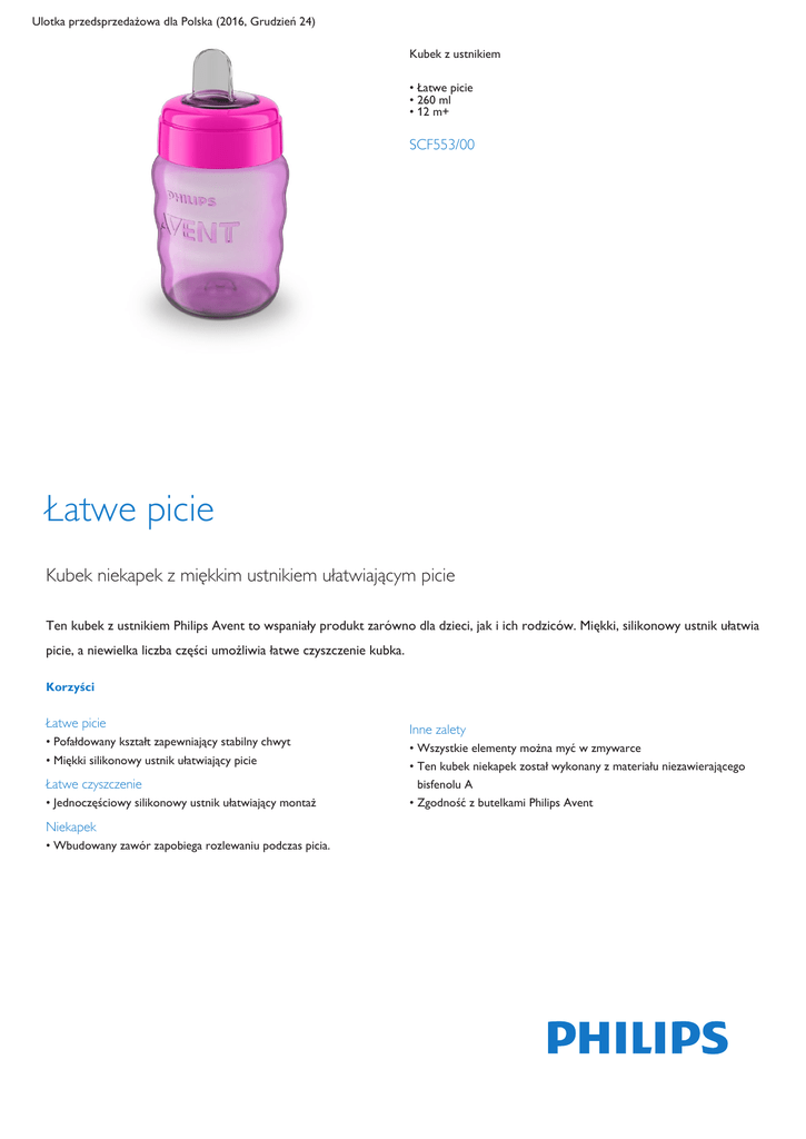 Ulotka przedsprzedażowa dla Polska (2016, Grudzień 24) Kubek z ustnikiem • Łatwe picie • 260 ml • 12 m+ SCF553/00 Łatwe picie Kubek niekapek z miękkim ustnikiem ułatwiającym picie Ten kubek z ustnikiem Philips Avent to wspaniały produkt zarówno dla dzieci, jak i ich rodziców. Miękki, silikonowy ustnik ułatwia picie, a niewielka liczba części umożliwia łatwe czyszczenie kubka. Korzyści Łatwe picie • Pofałdowany kształt zapewniający stabilny chwyt • Miękki silikonowy ustnik ułatwiający picie Łatwe czyszczenie • Jednoczęściowy silikonowy ustnik ułatwiający montaż Niekapek • Wbudowany zawór zapobiega rozlewaniu podczas picia. Inne zalety • Wszystkie elementy można myć w zmywarce • Ten kubek niekapek został wykonany z materiału niezawierającego bisfenolu A • Zgodność z butelkami Philips Avent Cechy Kubek można czyścić w zmywarce Bez bisfenolu A Picie bez żadnych problemów Jednoczęściowy ustnik Zawór jest wbudowany w ustnik, dzięki czemu montaż jest szybki i bezproblemowy. Jednoczęściowy silikonowy ustnik ułatwia picie: zawartość zaczyna wypływać po ściśnięciu ustnika. Zgodność z innymi produktami tej serii Pofałdowany kształt Kształt kubka niekapka ułatwia dziecku chwytanie. Nowy kubek Philips Avent jest zgodny z butelkami Philips Avent Natural i Classic + — z wyjątkiem szklanej butelki Kubek niekapek Specyfikacje Prosimy pamiętać, że jest to ulotka przedsprzedażowa. Treść ulotki jest zgodna z naszą najlepszą wiedzą w momencie publikacji i w odniesieniu do danego kraju (podane powyżej). Treść ulotki może ulec zmianie bez powiadomienia. Firma Philips nie ponosi odpowiedzialności za treść ulotki. Kraj pochodzenia Chiny Głębokość Waga netto Waga brutto EAN Liczba produktów w zestawie Kraj pochodzenia Kod towaru według Systemu Zharmonizowanego (HS) Tak Zawartość zestawu Silikonowy ustnik Kubek z ustnikiem Kubek (200 ml) Higieniczna nasadka 1 szt. Polipropylen, guma silikonowa 1 szt. 1 szt. Akcesoria Część zamienna Wymienny ustnik SCF246 Długość Szerokość Wysokość Waga brutto EAN Liczba opakowań konsumenckich 69 x 111 x 148 mm 0,05 kg Wymiary opakowania Wysokość Szerokość ID 392410 Karton zewnętrzny Waga i wymiary Wymiary produktu bez akcesoriów Waga produktu 6,80 cm 0,06 kg 0,07 kg 08710103667049 1 24,60 cm 14,60 cm 14,50 cm 0,48 kg 18710103667046 6 18,10 cm 10,90 cm Dane wkrótce ulegną zmianie 2016, Grudzień 24 Version: 7.2.1 EAN: 08710103667049 © 2016 Koninklijke Philips N.V. Wszelkie prawa zastrzeżone Dane mogą ulec zmianie bez uprzedniego powiadomienia. Znak towarowy jest własnością Koninklijke Philips N.V. lub odpowiednich podmiotów . www.philips.com