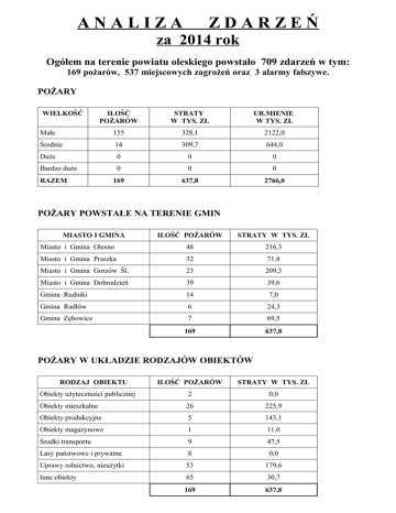 ANALIZA ZDARZEŃ za 2014 rok Ogółem na terenie powiatu oleskiego powstało 709 zdarzeń w tym: 169 pożarów, 537 miejscowych zagrożeń oraz 3 alarmy fałszywe. POŻARY WIELKOŚĆ ILOŚĆ POŻARÓW STRATY W TYS. ZŁ UR.MIENIE W TYS. ZŁ Małe 155 328,1 2122,0 Średnie 14 309,7 644,0 Duże 0 0 0 Bardzo duże 0 0 0 169 637,8 2766,0 RAZEM POŻARY POWSTAŁE NA TERENIE GMIN MIASTO I GMINA ILOŚĆ POŻARÓW STRATY W TYS. ZŁ Miasto i Gmina Olesno 48 216,3 Miasto i Gmina Praszka 32 71,8 Miasto i Gmina Gorzów Śl. 23 209,3 Miasto i Gmina Dobrodzień 39 39,6 Gmina Rudniki 14 7,0 Gmina Radłów 6 24,3 Gmina Zębowice 7 69,5 169 637,8 POŻARY W UKŁADZIE RODZAJÓW OBIEKTÓW RODZAJ OBIEKTU ILOŚĆ POŻARÓW STRATY W TYS. ZŁ Obiekty użyteczności publicznej 2 0,0 Obiekty mieszkalne 26 225,9 Obiekty produkcyjne 5 143,1 Obiekty magazynowe 1 11,0 Środki transportu 9 47,5 Lasy państwowe i prywatne 8 0,0 Uprawy rolnictwo, nieużytki 53 179,6 Inne obiekty 65 30,7 169 637,8 POŻARY W UKŁADZIE DZIAŁÓW GOSPODARCZYCH DZIAŁ GOSPODARCZY ILOŚĆ POŻARÓW Bud. admin.-biurowe, banki 1 Bud. jednorodzinne w tym bliźniaki, zabudowa szeregowa 17 Budynki wielorodzinne 6 Budynki gospodarcze 6 Budynki produkcyjne 1 Budynki mieszkalne w gospodarstwach rolnych 3 Maszyny i urządzenia technologiczne 2 Samochody osobowe, przyczepy samochodów osobowych 9 Lasy – młodniki 1 Inne powierzchnie w obszarach leśnych 7 Nieużytkowane powierzchnie rolnicze 23 Uprawy rolne oraz łąki, rżyska i pożary powstałe podczas zbiorów tych upraw 19 Sterty, stogi 2 Maszyny rolnicze, traktory itp. 3 Budynki inwentarskie, stodoły 2 Śmietniki wolno stojące, wysypiska śmieci 9 Obiekty lub grupa obiektów przyrody (pojedyncze drzewa,) 4 Trawy, trawniki na terenach nierolniczych, pobocza dróg i szlaków, ulic 42 Inne nietypowe 12 169 PRZYCZYNY POWSTANIA POŻARÓW PRZYCZYNA POŻARU ILOŚĆ POŻARÓW Nieostrożność osób dorosłych przy posługiwaniu się otwartym ogniem, w tym papierosy, zapałki 84 Nieostrożność osób nieletnich przy posługiwaniu się otwartym ogniem, w tym papierosy, zapałki 1 Nieostrożność osób dorosłych w pozostałych przypadkach 3 Wady urządzeń i instalacji elektrycznych (przewody, osprzęt oświetlenia, odbiorniki bez urządzeń ogrzewczych) 8 Nieprawidłowa eksploatacja urządzeń ogrzewczych na paliwo stałe 14 Wady urządzeń mechanicznych 3 Wady środków transportu 13 Wady urządzeń ogrzewczych na paliwo stałe 5 Samozapalenia biologiczne 1 Wyładowania atmosferyczne 5 Inne przyczyny 16 Nieustalone 6 Podpalenia umyślne 10 169 2 UDZIAŁ SIŁ I ŚRODKÓW PRZY POŻARACH PSP JRG OSP Z KSRG INNE OSP ZSP ZSR INNE JEDNOSTKI Samochody/ osoby Samochody/ osoby Samochody/ osoby Samochody/ osoby Samochody/ osoby Samochody/ osoby 128/508 234/1294 82/441 0/0 0/0 0/0 MIEJSCOWE ZAGROŻENIA WIELKOŚĆ MZ ILOŚĆ MZ STRATY W TYS. ZŁ Małe 35 0,0 Lokalne 500 1208,3 Średnie 2 48,0 Duże 0 0,0 Gigantyczne lub klęski żyw. 0 0,0 537 1256,3 RAZEM MIEJSCOWE ZAGROŻENIA W UKŁADZIE RODZAJÓW OBIEKTÓW RODZAJ OBIEKTU ILOŚĆ MIEJSCOWYCH ZAGROŻEŃ STRATY W TYS. ZŁ. Obiekty użyteczności publicznej 39 0,0 Obiekty mieszkalne 170 34,0 Obiekty produkcyjne 11 35,0 Obiekty magazynowe 1 10,0 102 1136,3 Lasy państwowe i prywatne 3 0,0 Uprawy rolnictwo 23 10,0 Inne obiekty 188 31,0 537 1256,3 Środki transportu MIEJSCOWE ZAGROŻENIA POWSTAŁE NA TERENIE GMIN MIASTO I GMINA ILOŚĆ MIEJSCOWYCH ZAGROŻEŃ STRATY W TYS. ZŁ. Miasto i Gmina Olesno 201 344,0 Miasto i Gmina Praszka 70 308,0 Miasto i Gmina Gorzów Śl. 49 57,5 Miasto i Gmina Dobrodzień 118 402,8 Gmina Rudniki 49 65,0 Gmina Radłów 26 77,0 Gmina Zębowice 24 2,0 537 1256,3 3 MIEJSCOWE ZAGROŻENIA W UKŁADZIE DZIAŁÓW GOSPODARCZYCH DZIAŁ GOSPODARCZY ILOŚĆ MZ Obiekty administracyjno - biurowe, banki 7 Obiekty oświaty i nauki (budynki dydaktyczne, szkoły, przedszkola) 10 Obiekty służby zdrowia 5 Obiekty handlowo - usługowe 5 Obiekty widowiskowo-rozrywkowe i sportowe 6 Obiekty kultu religijnego 2 Inne obiekty użyteczności publicznej 4 Budynki wielorodzinne 40 Budynki jednorodzinne 124 Inne obiekty mieszkalne (altanki, barakowozy itp.) 6 Budynki produkcyjne 1 Budynki gospodarcze 17 Obiekty magazynowe 1 Drogowe – autobusy, trolejbusy 2 Drogowe – samochody osobowe 84 Drogowe – samochody ciężarowe 10 Drogowe – motocykle, jednoślady 6 Budynki inwentarskie, hodowlane, magazynowe (stodoły), szklarnie 7 Lasy – drzewostany III klasy wieku 3 Maszyny rolnicze 3 Sterty, stogi 2 Obiekty lub grupa obiektów przyrody (pojedyncze drzewa, jaskinie) 53 Obiekty hydrotechniczne 1 Inne zdarzenia powstałe na zbiornikach wodnych 7 Garaże, warsztaty samochodowe itp. 6 Pobocza dróg i szlaków komunikacyjnych (ale bez zdarzeń z udziałem środków transportu, bez pożarów traw na poboczach) 11 Płyty manewrowe i pasy lotnisk, szlaki kolejowe, drogi, ulice 65 Trawy, trawniki na terenach nierolniczych, pobocza dróg i szlaków, ulic 12 Zagrożenia występujące na dużych obszarach mieszkalnych, gospodarczych itp. 2 Inne nietypowe obiekty, budynki, instalacje 35 537 PRZYCZYNY POWSTANIA MIEJSCOWYCH ZAGROŻEŃ PRZYCZYNY POWSTAWANIA MIEJSCOWYCH ZAGROŻEŃ ILOŚĆ MZ Nieprawidłowa eksploatacja urządzeń grzewczych (innych niż elektryczne) 3 Nieprawidłowa eksploatacja urządzeń gazowych 5 Wady urządzeń mechanicznych 2 Wady urządzeń elektrycznych 1 Uszkodzenia sieci i instalacji przemysłowych 2 Wady środków transportu 13 4 Niezachowanie zasad bezpieczeństwa ruchu środków transportu 91 Wady konstrukcji budowlanych 1 Silne wiatry 35 Gwałtowne opady atmosferyczne 53 Nieskuteczne zabezpieczenie hodowlanych zwierząt 1 Wyładowania atmosferyczne 1 Celowe działanie człowieka 1 Akcje terrorystyczne 2 Nieumyślne działanie człowieka 1 Nietypowe, agresywne zachowanie się zwierząt 172 Nieustalone 9 Inne przyczyny 142 537 UDZIAŁ SIŁ I ŚRODKÓW PRZY MIEJSCOWYCH ZAGROŻENIACH PSP JRG OSP Z KSRG INNE OSP ZSP ZSR GSP Samochody/ osoby Samochody/ oso