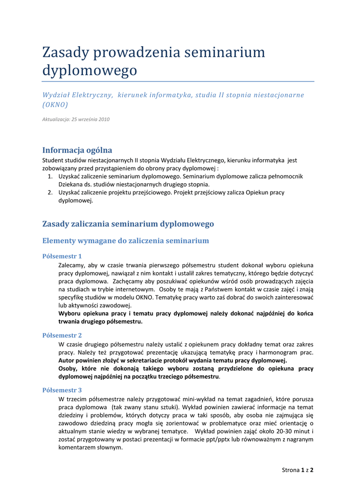 Zasady prowadzenia seminarium dyplomowego Wydział Elektryczny, kierunek informatyka, studia II stopnia niestacjonarne (OKNO) Aktualizacja: 25 września 2010 Informacja ogólna Student studiów niestacjonarnych II stopnia Wydziału Elektrycznego, kierunku informatyka jest zobowiązany przed przystąpieniem do obrony pracy dyplomowej : 1. Uzyskad zaliczenie seminarium dyplomowego. Seminarium dyplomowe zalicza pełnomocnik Dziekana ds. studiów niestacjonarnych drugiego stopnia. 2. Uzyskad zaliczenie projektu przejściowego. Projekt przejściowy zalicza Opiekun pracy dyplomowej. Zasady zaliczania seminarium dyplomowego Elementy wymagane do zaliczenia seminarium Półsemestr 1 Zalecamy, aby w czasie trwania pierwszego półsemestru student dokonał wyboru opiekuna pracy dyplomowej, nawiązał z nim kontakt i ustalił zakres tematyczny, którego będzie dotyczyd praca dyplomowa. Zachęcamy aby poszukiwad opiekunów wśród osób prowadzących zajęcia na studiach w trybie internetowym. Osoby te mają z Paostwem kontakt w czasie zajęd i znają specyfikę studiów w modelu OKNO. Tematykę pracy warto zaś dobrad do swoich zainteresowad lub aktywności zawodowej. Wyboru opiekuna pracy i tematu pracy dyplomowej należy dokonad najpóźniej do kooca trwania drugiego półsemestru. Półsemestr 2 W czasie drugiego półsemestru należy ustalid z opiekunem pracy dokładny temat oraz zakres pracy. Należy też przygotowad prezentację ukazującą tematykę pracy i harmonogram prac. Autor powinien złożyd w sekretariacie protokół wydania tematu pracy dyplomowej. Osoby, które nie dokonają takiego wyboru zostaną przydzielone do opiekuna pracy dyplomowej najpóźniej na początku trzeciego półsemestru. Półsemestr 3 W trzecim półsemestrze należy przygotowad mini-wykład na temat zagadnieo, które porusza praca dyplomowa (tak zwany stanu sztuki). Wykład powinien zawierad informacje na temat dziedziny i problemów, których dotyczy praca w taki sposób, aby osoba nie zajmująca się zawodowo dziedziną pracy mogła się zorientowad w problematyce oraz mied orientację o aktualnym stanie wiedzy w wybranej tematyce. Wykład powinien zająd około 20-30 minut i zostad przygotowany w postaci prezentacji w formacie ppt/pptx lub równoważnym z nagranym komentarzem słownym. Strona 1 z 2 Półsemestr 4 W czwartym półsemestrze należy przygotowad koocową prezentację pracy. W prezentacji należy zawrzed takie elementy jak: cel i zakres pracy, jej temat, krótko przedstawid zagadnienie, którego praca dotyczy, omówienie własnych osiągnięd podczas pisania pracy, wnioski z niej wynikające i bibliografię, na której Autor oparł się przy tworzeniu pracy dyplomowej. Prezentacja ta stanowi trening przed wystąpieniem w czasie egzaminu dyplomowe. Podobnie jak prezentacja stanu sztuki powinna byd przygotowana w formacie ppt/pptx lub równoważnym z nagranym komentarzem słownym. Zalecany czas jej trwania to 10-15 minut. Schemat postępowania Elementy podlegające ocenie w czasie seminarium dyplomowego przedstawiono na rysunku nr 1. PS1 PS2 Zalecany: Wybór opiekuna i tematyki pracy Temat i zakres pracy (protokół wydania tematu) PS3 Prezentacja dziedziny problemowej (stanu sztuki) PS4 Koocowa prezentacja pracy Prezentacja tematyki pracy i harmonogramu prac Praca dyplomowa Rysunek 1. Etapy i główne produkty w czasie pisania pracy dyplomowej - wpis do indeksu Strona 2 z 2