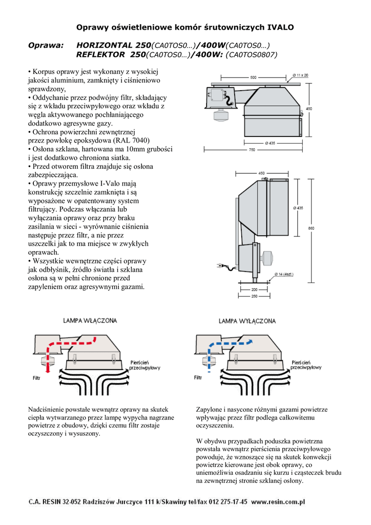 Oprawy oświetleniowe komór śrutowniczych IVALO Oprawa: HORIZONTAL 250(CA0TOS0…)/400W(CA0TOS0…) REFLEKTOR 250(CA0TOS0…)/400W: (CA0TOS0807) • Korpus oprawy jest wykonany z wysokiej jakości aluminium, zamknięty i ciśnieniowo sprawdzony, • Oddychanie przez podwójny filtr, składający się z wkładu przeciwpyłowego oraz wkładu z węgla aktywowanego pochłaniającego dodatkowo agresywne gazy. • Ochrona powierzchni zewnętrznej przez powłokę epoksydowa (RAL 7040) • Osłona szklana, hartowana ma 10mm grubości i jest dodatkowo chroniona siatka. • Przed otworem filtra znajduje się osłona zabezpieczająca. • Oprawy przemysłowe I-Valo mają konstrukcję szczelnie zamknięta i są wyposażone w opatentowany system filtrujący. Podczas włączania lub wyłączania oprawy oraz przy braku zasilania w sieci - wyrównanie ciśnienia następuje przez filtr, a nie przez uszczelki jak to ma miejsce w zwykłych oprawach. • Wszystkie wewnętrzne części oprawy jak odbłyśnik, źródło światła i szklana osłona są w pełni chronione przed zapyleniem oraz agresywnymi gazami. Nadciśnienie powstałe wewnątrz oprawy na skutek ciepła wytwarzanego przez lampę wypycha nagrzane powietrze z obudowy, dzięki czemu filtr zostaje oczyszczony i wysuszony. Zapylone i nasycone różnymi gazami powietrze wpływając przez filtr podlega całkowitemu oczyszczeniu. W obydwu przypadkach poduszka powietrzna powstała wewnątrz pierścienia przeciwpyłowego powoduje, że wznoszące się na skutek konwekcji powietrze kierowane jest obok oprawy, co uniemożliwia osadzaniu się kurzu i cząsteczek brudu na zewnętrznej stronie szklanej osłony.