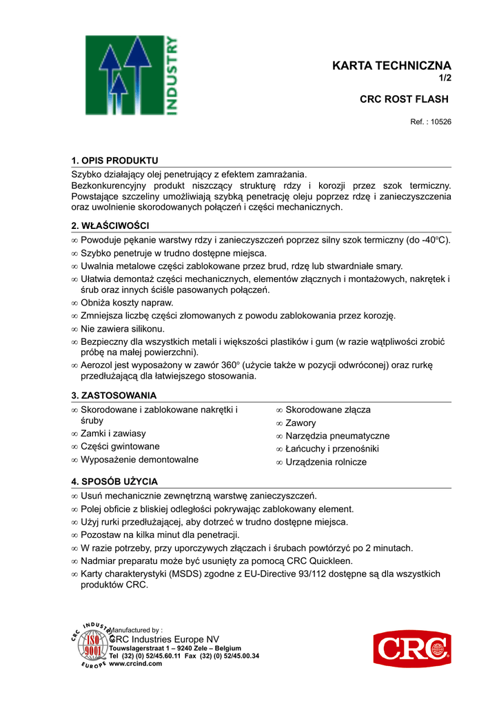 KARTA TECHNICZNA 1/2 CRC ROST FLASH Ref. : 10526 1. OPIS PRODUKTU Szybko działający olej penetrujący z efektem zamrażania. Bezkonkurencyjny produkt niszczący strukturę rdzy i korozji przez szok termiczny. Powstające szczeliny umożliwiają szybką penetrację oleju poprzez rdzę i zanieczyszczenia oraz uwolnienie skorodowanych połączeń i części mechanicznych. 2. WŁAŚCIWOŚCI • • • • • • • • • Powoduje pękanie warstwy rdzy i zanieczyszczeń poprzez silny szok termiczny (do -40oC). Szybko penetruje w trudno dostępne miejsca. Uwalnia metalowe części zablokowane przez brud, rdzę lub stwardniałe smary. Ułatwia demontaż części mechanicznych, elementów złącznych i montażowych, nakrętek i śrub oraz innych ściśle pasowanych połączeń. Obniża koszty napraw. Zmniejsza liczbę części złomowanych z powodu zablokowania przez korozję. Nie zawiera silikonu. Bezpieczny dla wszystkich metali i większości plastików i gum (w razie wątpliwości zrobić próbę na małej powierzchni). Aerozol jest wyposażony w zawór 360o (użycie także w pozycji odwróconej) oraz rurkę przedłużającą dla łatwiejszego stosowania. 3. ZASTOSOWANIA • Skorodowane i zablokowane nakrętki i śruby • Zamki i zawiasy • Części gwintowane • Wyposażenie demontowalne • • • • • Skorodowane złącza Zawory Narzędzia pneumatyczne Łańcuchy i przenośniki Urządzenia rolnicze 4. SPOSÓB UŻYCIA • • • • • • • Usuń mechanicznie zewnętrzną warstwę zanieczyszczeń. Polej obficie z bliskiej odległości pokrywając zablokowany element. Użyj rurki przedłużającej, aby dotrzeć w trudno dostępne miejsca. Pozostaw na kilka minut dla penetracji. W razie potrzeby, przy uporczywych złączach i śrubach powtórzyć po 2 minutach. Nadmiar preparatu może być usunięty za pomocą CRC Quickleen. Karty charakterystyki (MSDS) zgodne z EU-Directive 93/112 dostępne są dla wszystkich produktów CRC. Manufactured by : CRC Industries Europe NV Touwslagerstraat 1 – 9240 Zele – Belgium Tel (32) (0) 52/45.60.11 Fax (32) (0) 52/45.00.34 www.crcind.com KARTA TECHNICZNA 2/2 CRC ROST FLASH Ref. : 10526 5. DANE TECHNICZNE (bez gazu pędnego) Wygląd Zapach Ciężar właściwy (w 20°C) Temperatura zapłonu (zamknięty tygiel) Obniżenie temperatury : : : : : Rozpływanie się w poziomie (po 120 s, w 20°C) : bursztynowa ciecz typowy 0,75 g/cm3 < 0°C do – 40°C na powierzchni 19 cm2 6. OPAKOWANIA aerozol : 12 x 500 ml Wszystkie dane przedstawione w tej karcie oparte są na naszym doświadczeniu i/lub testach laboratoryjnych. Z powodu różnorodności urządzeń i warunków pracy oraz nieprzewidywalnych zachowań ludzkich polecamy wcześniejsze przetestowanie produktu przed użyciem. Wszystkie informacje podane są w dobrej wierze, ale bez żadnej gwarancji. Informacje przedstawione w niniejszej Karcie Technicznej mogą ulec zmianie w wyniku zmian prawnych, zmian składników lub nowych doświadczeń. Ostateczna i aktualna wersja Karty Technicznej może być przesłana na żądanie, jest także dostępna na naszej stronie internetowej: www.crcind.com. Zalecamy zarejestrowanie się na tej stronie, aby w przyszłości automatycznie otrzymywać uaktualnione wersje tej Karty Technicznej. Wersja Data : : 10526 03 0504 01 12 kwietnia 2005 Manufactured by : CRC Industries Europe NV Touwslagerstraat 1 – 9240 Zele – Belgium Tel (32) (0) 52/45.60.11 Fax (32) (0) 52/45.00.34 www.crcind.com
