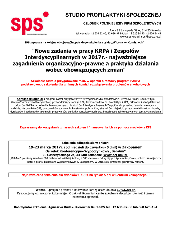 STUDIO PROFILAKTYKI SPOŁECZNEJ CZŁONEK POLSKIEJ IZBY FIRM SZKOLENIOWYCH Aleja 29 Listopada 39 A, 31-425 Kraków tel. centrala: 12 636 92 85, 12 636-37 93; fax: 12 626 94 40, 12 626 94 41 www.sps.org.pl [email protected] SPS zaprasza na kolejną edycję ogólnopolskiego szkolenia z cyklu „Wiosna w Komisjach” "Nowe zadania w pracy KRPA i Zespołów Interdyscyplinarnych w 2017r.- najważniejsze zagadnienia organizacyjno-prawne a praktyka działania wobec obowiązujących zmian" Szkolenie zostało przygotowane m.in. w oparciu o ramowy program PARPA podstawowego szkolenia dla gminnych komisji rozwiązywania problemów alkoholowych Adresat szkolenia: : program został przygotowany w szczególności dla przedstawicieli Urzędów Miast i Gmin, w tym Wójtów/Burmistrzów/Prezydentów, przewodniczący Komisji RPA, Pełnomocników ds. Profilaktyki i RPA, członków i kandydatów na członków GKRPA, a także dla Przewodniczących i członków Interdyscyplinarnych Zespołów ds. przeciwdziałania przemocy w rodzinie, kierowników OPS, pracowników socjalnych, kuratorów, policjantów, strażników miejskich, przedstawicieli służby zdrowia, dyrektorów i pedagogów szkolnych, pracowników punktów konsultacyjnych oraz innych osób zainteresowanych tematyką szkolenia Zapraszamy do korzystania z naszych szkoleń i finansowania ich za pomocą środków z KFS Szkolenie odbędzie się w dniach: 19-23 marca 2017r. (od niedzieli do czwartku- 5 dni!) w Zakopanem Ośrodek Konferencyjno-Wypoczynkowy „Bel-Ami” ul. Goszczyńskiego 24, 34-500 Zakopane (www.bel-ami.pl) „Bel-Ami” położony zaledwie 600 metrów od Wielkiej Krokwi, a 500 metrów – od tętniących życiem Krupówek, uchodzi za najlepszy hotel o profilu biznesowo-wypoczynkowym w Zakopanem. W 2016 roku przeszedł gruntowny remont. Najniższa cena szkolenia dla członków GKRPA na rynku! 5 dni w Centrum Zakopanego!!! Ważne- uprzejmie prosimy o nadsyłanie kart zgłoszeń do dnia 10.03.2017r. Dysponujemy ograniczoną liczbą miejsc. O zakwalifikowaniu i cenie szkolenia decyduje kolejność i termin nadsyłania zgłoszeń. Koordynator szkolenia: Agnieszka Dudek- Kierownik Biura SPS tel.: 12 636-92-85 lub 660 675-194 STUDIO PROFILAKTYKI SPOŁECZNEJ CZŁONEK POLSKIEJ IZBY FIRM SZKOLENIOWYCH Aleja 29 Listopada 39 A, 31-425 Kraków tel. centrala: 12 636 92 85, 12 636-37 93; fax: 12 626 94 40, 12 626 94 41 www.sps.org.pl [email protected] PROGRAM SZKOLENIA: "Nowe zadania w pracy KRPA i Zespołów Interdyscyplinarnych w 2017r.-najważniejsze zagadnienia organizacyjnoprawne a praktyka działania wobec obowiązujących zmian" 19-23.03.2017r.- Ośrodek Konferencyjno-Wypoczynkowy „Bel-Ami” w Zakopanem 19.03.2017r. (niedziela) Przyjazd i zakwaterowanie uczestników szkolenia od godz. 15.00 w „Bel-Ami” 20.03.2017r. (poniedziałek) Realizacja gminnych programów w roku 2017 w kontekście Ustawy o zdrowiu publicznym oraz Narodowego Programu Zdrowia - nowe zasady i kierunki 07.30-09.00 Śniadanie (13.00-14.00 Obiad) 09.00 Powitanie, omówienie harmonogramu szkolenia, rozpoczęcie szkolenia 09.00-15.30 Realizacja gminnych programów w roku 2017 w kontekście Ustawy o zdrowiu publicznym oraz Narodowego Programu Zdrowia - nowe zasady i kierunki: 1. Nowelizacja ustawy o wychowaniu w trzeźwości i przeciwdziałaniu alkoholizmowi w zakresie realizacji gminnych programów profilaktyki i rozwiązywania problemów alkoholowych oraz przeciwdziałania narkomanii wynikająca z ustawy o zdrowiu publicznym. 2. Nowy tryb realizacji zadań z zakresu zdrowia publicznego wprowadzony ustawą o zdrowiu publicznym (konkurs ofert, przykłady ogłoszeń konkursowych) 3. Zadania gminy w zakresie rozwiązywania problemów alkoholowych wynikające z Narodowego Programu Zdrowia (rozporządzenie Rady Ministrów) – jak integrować gminne programy z Narodowym Programem Zdrowia - konkretne wskazówki i przykłady a) Promocja zdrowia Edukacja zdrowotna Szkolenie kadr Zadania regulacyjne i zapewnienie skutecznego egzekwowania przepisów, w tym m.in. zmniejszenie dostępności fizycznej alkoholu b) Profilaktyka, w tym zapisy NPZ dotyczące realizacji programów rekomendowanych Profilaktyka uniwersalna, Profilaktyka selektywna Profilaktyka wskazująca. c) Redukcja szkód, rehabilitacja (readaptacja, reintegracja) zdrowotna, społeczna i zawodowa 4. Obowiązek sprawozdawczości gmin z realizacji celów operacyjnych NPZ 5. Profilaktyka uniwersalna, selektywna i wskazująca opisana w Narodowym Programie Zdrowia jako zadanie dla gminy – przykłady konkretnych programów oraz omówienie bazy programów rekomendowanych. Miejsce sportu w profilaktyce. Socjoterapia jako przykład profilaktyki wskazującej. 6. Procedura zobowiązania do leczenia odwykowego - schemat postepowania, gromadzenie i ochrona danych osobowych oraz trwające prace nowelizacyjny w tym zakresie w kontekście postulatów zgłaszanych przez NIK 15.30-19.00 Czas wolny. Dla zainteresowanych wycieczka piesza z przewodnikiem tatrzańskim od 19.45 Kolacja regionalna z udziałem kapeli góralskiej STUDIO PROFILAKTYKI SPOŁECZNEJ CZŁONEK POLSKIEJ IZBY FIRM SZKOLENIOWYCH Aleja 29 Listopada 39 A, 31-425 Kraków tel. centrala: 12 636 92 85, 12 636-37 93; fax: 12 626 94 40, 12 626 94 41 www.sps.org.pl [email protected] 21.03.2017r. (wtorek) Pomaganie osobom uzależnionym od alkoholu. Jak jest obecnie, co należy zmienić? Nowe uregulowania dotyczące systemu przeciwdziałania przemocy w rodzinie w oparciu o znowelizowaną ustawę o wychowaniu w trzeźwości i przeciwdziałaniu alkoholizmowi 07.30-09.00 Śniadanie (13.00-14.00 Obiad) 09.00-15.30 (zajęcia do wyboru) Pomaganie osobom uzależnionym od alkoholu. Jak jest obecnie, co należy zmienić?: - Różne koncepcje uzależnienia od alkoholu i różne metody leczenia osób uzależnionych. - Cele pomagania osobom uzależnionym: abstynencja i redukcja szkód - Stan i aktualna kondycja polskiego lecznictwa odwykowego - Czynniki efektywności leczenia osób uzależnionych