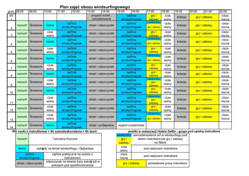 Plan zajęć obozu windsurfingowego godz. 08:00 dni 1 09:00 10:00 11:00 8 17:00 gry i zabawy zajęcia windsurfingowe zajęcia windsurfingowe gry i zabawy gry i zabawy czas wolny czas wolny windsurfing 18:00 czas wolny czas wolny 19:00 20:00 21:00 kolacja gry i zabawy kolacja gry i zabawy kolacja gry i zabawy kolacja gry i zabawy 22:00 cisza nocna cisza nocna czas wolny rozruch śniadanie teoria rozruch śniadanie czas wolny zajęcia windsurfingowe obiad i odpoczynek zajęcia windsurfingowe gry i zabawy czas wolny kolacja gry i zabawy cisza nocna rozruch śniadanie zajęcia windsurfingowe obiad i odpoczynek zajęcia windsurfingowe windsurfing teoria czas wolny kolacja gry i zabawy cisza nocna rozruch śniadanie czas wolny kolacja gry i zabawy rozruch śniadanie teoria kolacja gry i zabawy rozruch śniadanie czas wolny kolacja gry i zabawy rozruch śniadanie teoria zajęcia windsurfingowe obiad i odpoczynek zajęcia windsurfingowe czas wolny kolacja gry i zabawy cisza nocna rozruch śniadanie czas wolny zajęcia windsurfingowe obiad i odpoczynek zajęcia windsurfingowe czas wolny kolacja gry i zabawy cisza nocna rozruch śniadanie czas wolny zajęcia windsurfingowe obiad i odpoczynek zajęcia windsurfingowe czas wolny kolacja gry i zabawy cisza nocna rozruch śniadanie czas wolny zajęcia windsurfingowe obiad i odpoczynek zajęcia windsurfingowe czas wolny kolacja gry i zabawy cisza nocna 11 12 16:00 zajęcia windsurfingowe zajęcia windsurfingowe rozruch śniadanie 9 10 zajęcia windsurfingowe 15:00 teoria 6 7 14:00 rozruch śniadanie 4 5 13:00 przyjazd uczest., zakwaterowanie 2 3 12:00 13 zajęcia windsurfingowe zajęcia windsurfingowe zajęcia windsurfingowe zajęcia windsurfingowe zajęcia windsurfingowe obiad i odpoczynek obiad i odpoczynek obiad i odpoczynek obiad i odpoczynek obiad i odpoczynek obiad i odpoczynek zajęcia rozruch śniadanie teoria obiad i pożegnanie 14 windsurfingowe 50h nauki z instruktorem + 6h samodoskonalenia + 6h teorii rozruch ćwiczenia fizyczne teoria wykłady na temat windsurfingu i żeglarstwa zajęcia windsurfingowe obiad i odpoczynek zajęcia praktyczne na wodzie z instruktorem odpoczynek na terenie bazy szkoły lub w pokojach pod opieką instruktora zajęcia windsurfingowe zajęcia windsurfingowe zajęcia windsurfingowe gry i zabawy windsurfing gry i zabawy gry i zabawy gry i zabawy windsurfing gry i zabawy gry i zabawy windsurfing gry i zabawy gry i zabawy windsurfing gry i zabawy czas wolny czas wolny czas wolny wyjazd uczestników posiłki w restauracji Hotelu Delfin - grupa pod opieką instruktora windsurfing samodskonalenie się w windsurfingu pod okiem instruktora lub gry i zabawy gry i na lądzie zabawy czas pod nadzorem instruktora wolny cisza pod nadzorem instruktora nocna gry i zabawy prowadzone przez instruktora cisza nocna cisza nocna cisza nocna cisza nocna cisza nocna