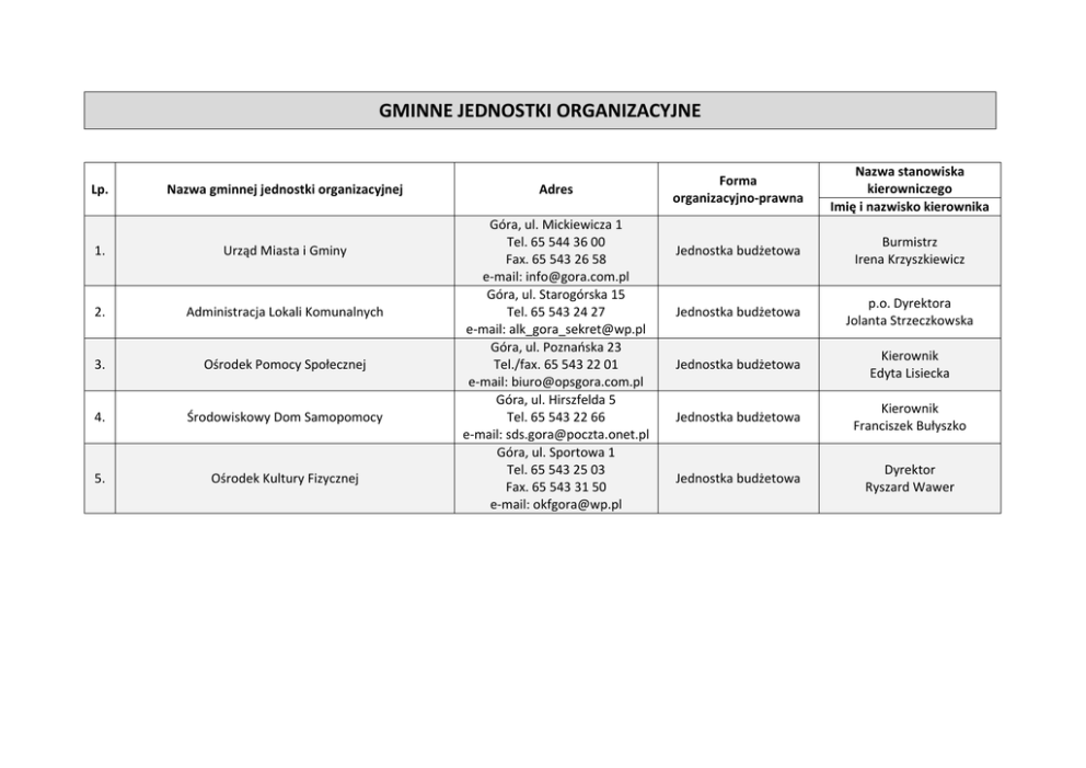 GMINNE JEDNOSTKI ORGANIZACYJNE Lp. Nazwa gminnej jednostki organizacyjnej 1. Urząd Miasta i Gminy 2. Administracja Lokali Komunalnych 3. Ośrodek Pomocy Społecznej 4. Środowiskowy Dom Samopomocy 5. Ośrodek Kultury Fizycznej Adres Góra, ul. Mickiewicza 1 Tel. 65 544 36 00 Fax. 65 543 26 58 e‐mail: [email protected] Góra, ul. Starogórska 15 Tel. 65 543 24 27 e‐mail: [email protected] Góra, ul. Poznańska 23 Tel./fax. 65 543 22 01 e‐mail: [email protected] Góra, ul. Hirszfelda 5 Tel. 65 543 22 66 e‐mail: [email protected] Góra, ul. Sportowa 1 Tel. 65 543 25 03 Fax. 65 543 31 50 e‐mail: [email protected] Forma organizacyjno‐prawna Nazwa stanowiska kierowniczego Imię i nazwisko kierownika Jednostka budżetowa Burmistrz Irena Krzyszkiewicz Jednostka budżetowa p.o. Dyrektora Jolanta Strzeczkowska Jednostka budżetowa Kierownik Edyta Lisiecka Jednostka budżetowa Kierownik Franciszek Bułyszko Jednostka budżetowa Dyrektor Ryszard Wawer GMINNE JEDNOSTKI ORGANIZACYJNE (PRZEDSZKOLA‐SZKOŁY) Lp. Nazwa gminnej jednostki organizacyjnej 1. Przedszkole Publiczne nr 1 im. Marii Konopnickiej 2. Przedszkole Publiczne nr 3 im. Jasia i Małgosi 3. Szkoła Podstawowa nr 1 im. Bolesława Prusa 4. Szkoła Podstawowa nr 3 im. Władysława Broniewskiego 5. Zespół Szkolno‐Przedszkolny z Oddziałami Integracyjnymi w Glince 6. Zespół Szkoła Podstawowa, Gimnazjum i Przedszkole im. św. Huberta w Czerninie 7. Zespół Szkoła Podstawowa i Przedszkole im. Janusza Korczaka w Ślubowie Adres Góra, ul. Żeromskiego 15 Tel. 65 543 23 34 e‐mail: [email protected] Góra, ul. Piastów 7 Tel. 65 543 24 08 e‐mail: [email protected] Góra, ul. Konopnickiej 2 Tel. 65 543 24 52 Fax. 65 544 16 75 e‐mail: [email protected] Góra, ul. Poznańska 2 Tel. 65 543 24 17 Fax. 65 544 16 31 e‐mail: [email protected] Glinka 6, 56‐200 Góra Tel. 065 543 22 89 Tel./Fax 065 543 27 08 e‐mail: [email protected] Czernina, ul. Szkolna 2 Tel. 65 543 67 66 Fax. 65 543 18 99 e‐mail: [email protected] Ślubów 54, 56‐200 Góra Tel. 065 543 68 77 (szkoła), Tel./Fax (065) 543 68 52 e‐mail: [email protected] Forma organizacyjno‐ prawna Nazwa stanowiska kierowniczego Imię i nazwisko kierownika Jednostka budżetowa Dyrektor Urszula Ratajczak Jednostka budżetowa Dyrektor Helena Szczepańska Jednostka budżetowa Dyrektor Lilianna Biedulska Jednostka budżetowa Dyrektor Bożena Domańska Jednostka budżetowa Dyrektor Dorota Paruch Jednostka budżetowa Dyrektor Dorota Adamska Jednostka budżetowa Dyrektor Robert Brojek 8. Zespół Szkoła Podstawowa i Przedszkole im. Władysława Reymonta w Witoszycach 9. Gimnazjum nr 1 im. Marii Skłodowskiej‐Curie 10. Gimnazjum nr 2 im. Mikołaja Kopernika 11. Klub Dziecięcy „Świat Malucha” Witoszyce 10, 56‐200 Góra Tel./Fax. 65 543 13 23 e‐mail: [email protected] Szkolna 2, 56‐200 Góra Tel. 65 543 24 63 Tel./Fax. 65 544 16 40 e‐mail: [email protected] Poznańska 2a, 56‐200 Góra Tel. 65 543 30 71 Tel./Fax. 65 544 20 25 e‐mail: [email protected] Stefana Żeromskiego 15 a Tel. 61 282 30 25 e‐mail: [email protected] Jednostka budżetowa Dyrektor Leszek Stecki Jednostka budżetowa Dyrektor Mariola Żywicka Jednostka budżetowa Dyrektor Janusz Ruszkiewicz Jednostka budżetowa Kierownik Agnieszka Drozdowska