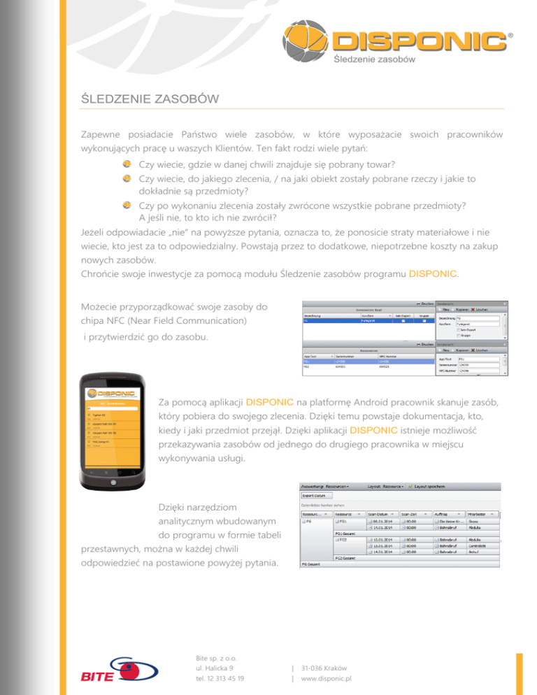 Śledzenie zasobów ŚLEDZENIE ZASOBÓW Zapewne posiadacie Państwo wiele zasobów, w które wyposażacie swoich pracowników wykonujących pracę u waszych Klientów. Ten fakt rodzi wiele pytań: Czy wiecie, gdzie w danej chwili znajduje się pobrany towar? Czy wiecie, do jakiego zlecenia, / na jaki obiekt zostały pobrane rzeczy i jakie to dokładnie są przedmioty? Czy po wykonaniu zlecenia zostały zwrócone wszystkie pobrane przedmioty? A jeśli nie, to kto ich nie zwrócił? Jeżeli odpowiadacie „nie“ na powyższe pytania, oznacza to, że ponosicie straty materiałowe i nie wiecie, kto jest za to odpowiedzialny. Powstają przez to dodatkowe, niepotrzebne koszty na zakup nowych zasobów. Chrońcie swoje inwestycje za pomocą modułu Śledzenie zasobów programu DISPONIC. Możecie przyporządkować swoje zasoby do chipa NFC (Near Field Communication) i przytwierdzić go do zasobu. Za pomocą aplikacji DISPONIC na platformę Android pracownik skanuje zasób, który pobiera do swojego zlecenia. Dzięki temu powstaje dokumentacja, kto, kiedy i jaki przedmiot przejął. Dzięki aplikacji DISPONIC istnieje możliwość przekazywania zasobów od jednego do drugiego pracownika w miejscu wykonywania usługi. Dzięki narzędziom analitycznym wbudowanym do programu w formie tabeli przestawnych, można w każdej chwili odpowiedzieć na postawione powyżej pytania. Bite sp. z o.o. ul. Halicka 9 | 31-036 Kraków tel. 12 313 45 19 | www.disponic.pl Śledzenie zasobów Sam fakt posiadania przez pracownika wiedzy, że pobierane przez niego przedmioty są w jakiś sposób monitorowane, spowoduje, że będzie się z nimi obchodził lepiej. Dodatkowo można monitorować, jaki zasób rzeczywiście został wykorzystany przy wykonywaniu zlecenia i tylko za to wystawić fakturę, a nie również za przedmioty zaplanowane do użycia. Zabezpiecz swoje inwestycje dzięki aplikacji Śledzenie zasobów programu DISPONIC! Bite sp. z o.o. ul. Halicka 9 | 31-036 Kraków tel. 12 313 45 19 | www.disponic.pl